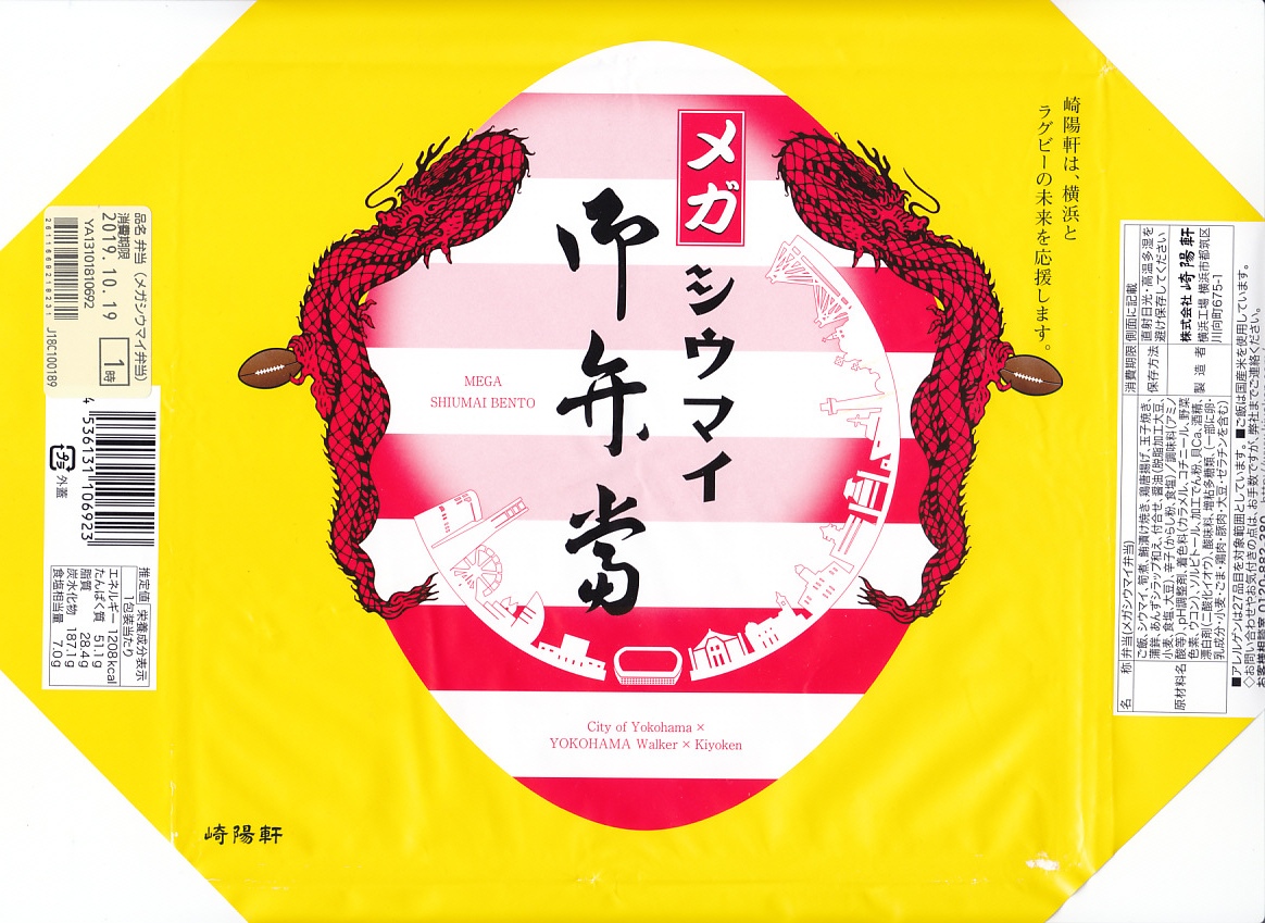 上記の企画駅弁「メガシウマイ弁当」が再登板。今回は調製元と横浜市と出版社のKADOKAWAとのコラボレーション企画で、2019(令和元)年9月20日から11月2日まで販売。日本でのラグビーW杯の開催期間に合わせたもので、公式なライセンスやタイアップではないが、「横浜とラグビーの未来を応援しよう」という理屈で販売したようだ。中身は従前と、掛紙の絵柄は2年前と、ほぼ同じ。