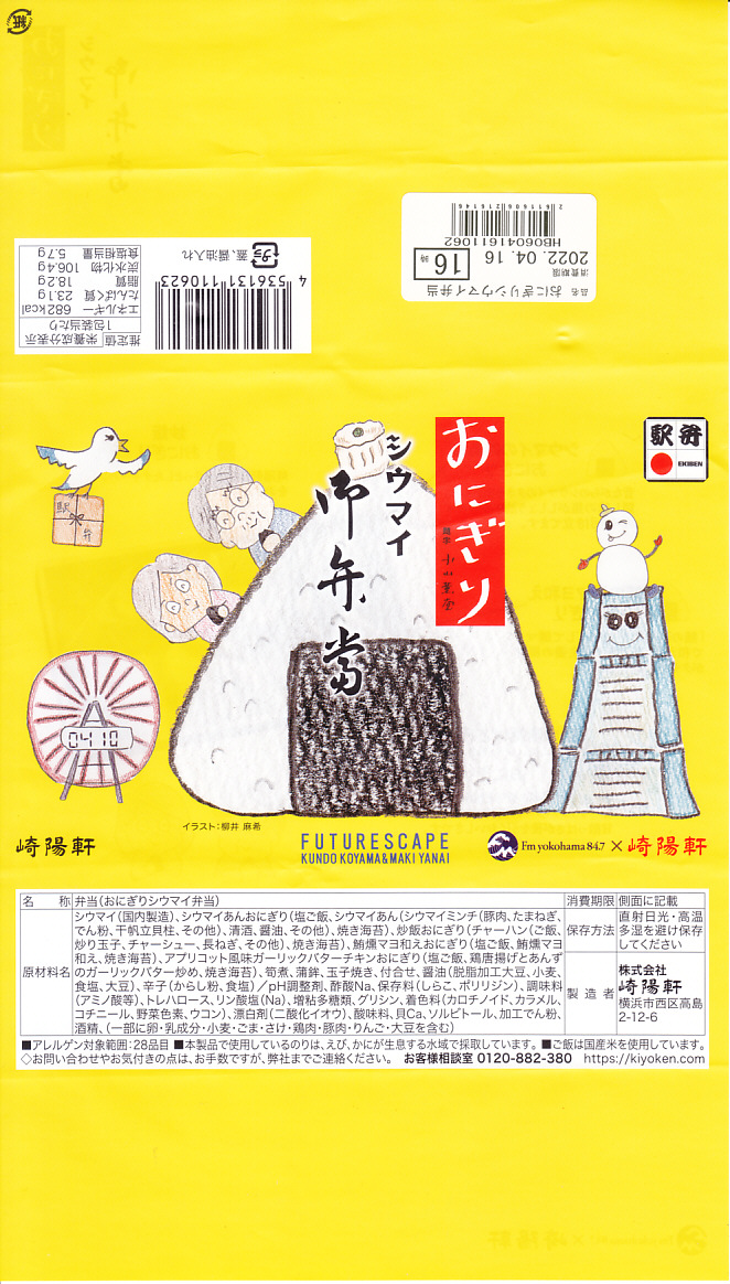 商品名は「おにぎりシウマイ弁当」とも。今回は2022(令和4)年4月10日から19日まで、神奈川エリアや東京エリアの160店舗で一日1,250個を販売。今回は駅弁の日に合わせ、日本鉄道構内営業中央会の会員のうち21社が、FMヨコハマのラジオ番組「FUTURESCAPE」とタイアップし、この年の4月10日から各社の駅売店などで販売した、駅弁の日記念のおにぎり駅弁の、横浜駅バージョンとして販売。今回のキャンペーンで各社に用意された「駅弁カード」が1枚付いてきた。