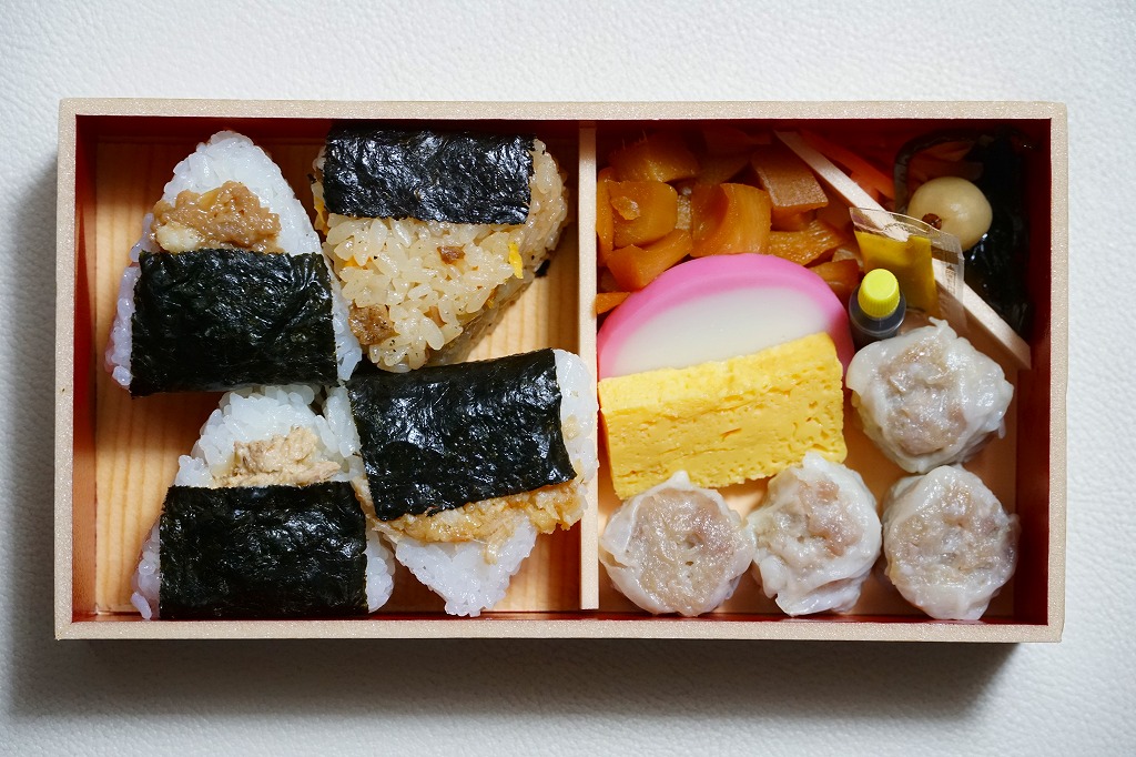 掛紙の絵柄は、普段のシウマイ弁当と同じ感じ。中身は前年と同じで、シウマイの肉あんおにぎり、鮪の燻マヨ和えおにぎり、鶏の唐揚げとあんずのガーリックバター風味おにぎり、炒飯おにぎりで4種各1個のミニおにぎりと、小梅、かまぼこ、玉子焼、筍煮、紅生姜と昆布煮、醤油と洋辛子、昔ながらのシウマイ4個。今までも普段のシウマイ弁当より高かった価格は、さらに140円も値上げされたが、予約して買う人はきっと値段を気にしないと思う。