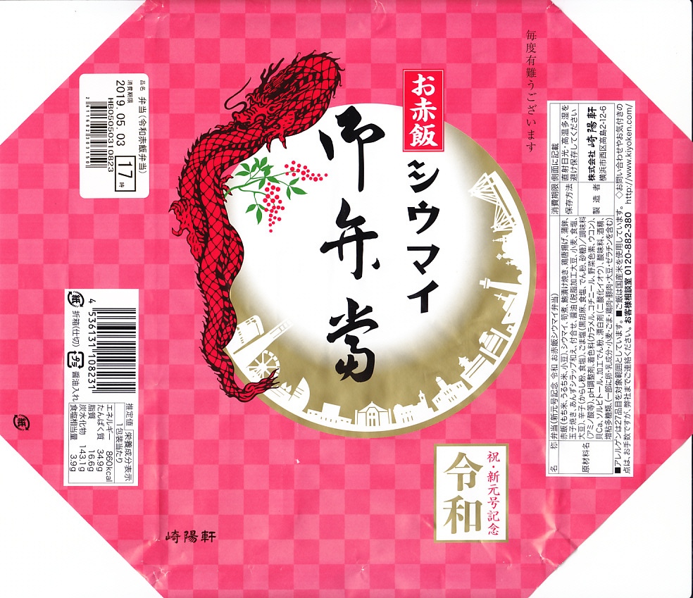 2019(令和元)年5月1日から6月18日まで販売。駅弁の名前のとおり、シウマイ弁当の御飯を赤飯に置き換えたものであり、発売月からの新元号の「令和」を記念するもの。掛紙の絵柄はおおむね通常版と同じで、地色が赤や金になっている。これは2017(平成29)年8月に崎陽軒公式サイト上で実施したアンケート企画「トンデモ!?シウマイ弁当」の、「お赤飯バージョンのシウマイ弁当」の商品化のようにも見える。同年の9月までに、掛紙から「令和」を抜き、5個以上での予約販売を始めた。価格は2019年の発売時や購入時で980円、のち960円、2022年10月から1,000円、2023年10月から1,050円、2025年2月から1,170円、2026年2月から1,280円。