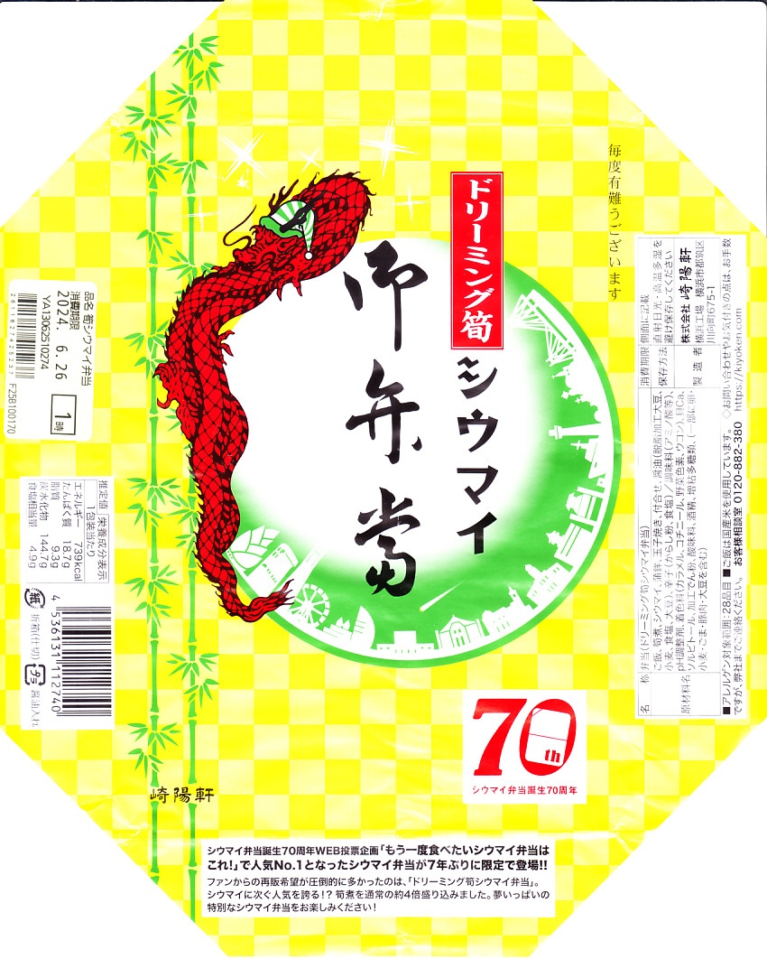 2024(令和6)年4月2日に購入した、横浜駅弁の掛紙。シウマイ弁当誕生70周年企画として、2024年4月1日から7日まで、普段は5個以上の予約販売を行うお赤飯シウマイ弁当の掛紙に70周年オリジナルロゴを追加し、崎陽軒の店舗で予約を要せず1個から販売した。1個からの予約もできた。それ以外は、通常版と同じ。