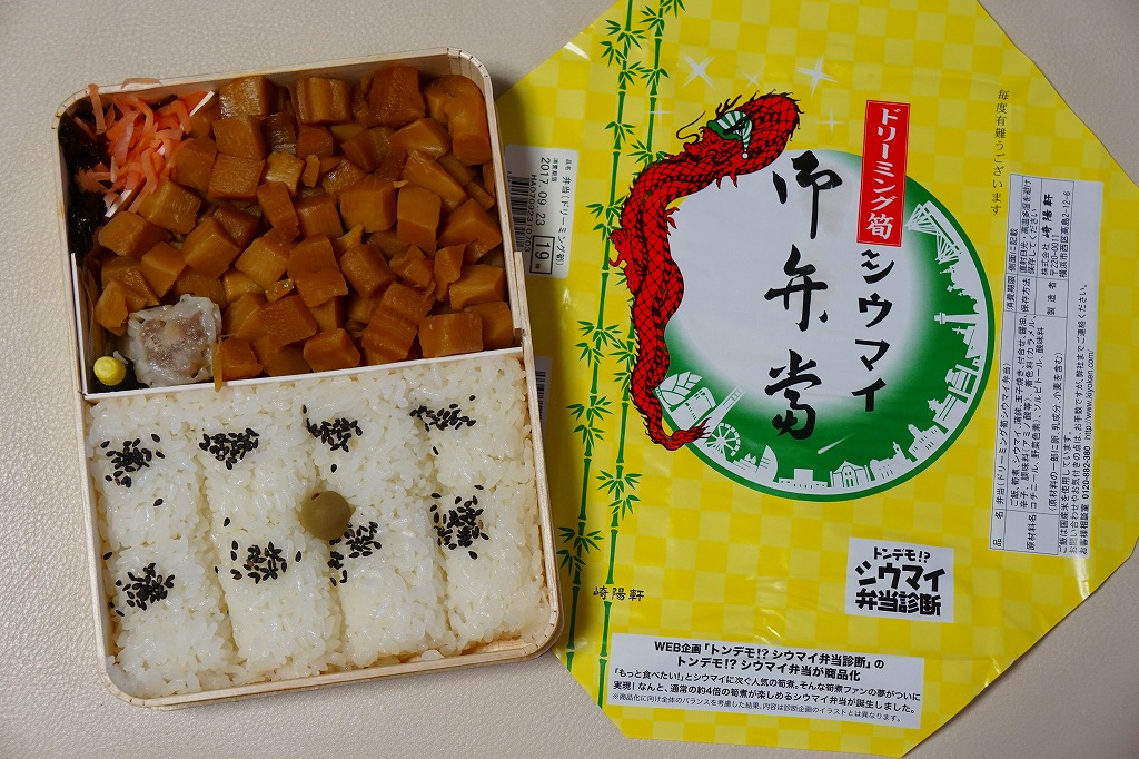 なお、「トンデモ!?シウマイ弁当」における「ドリーミング筍シウマイ弁当」の中身は、上の写真のようなものであった。商品化にあたり、内容を一部変更したという。