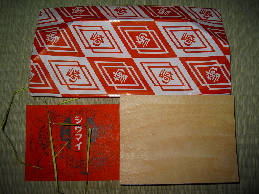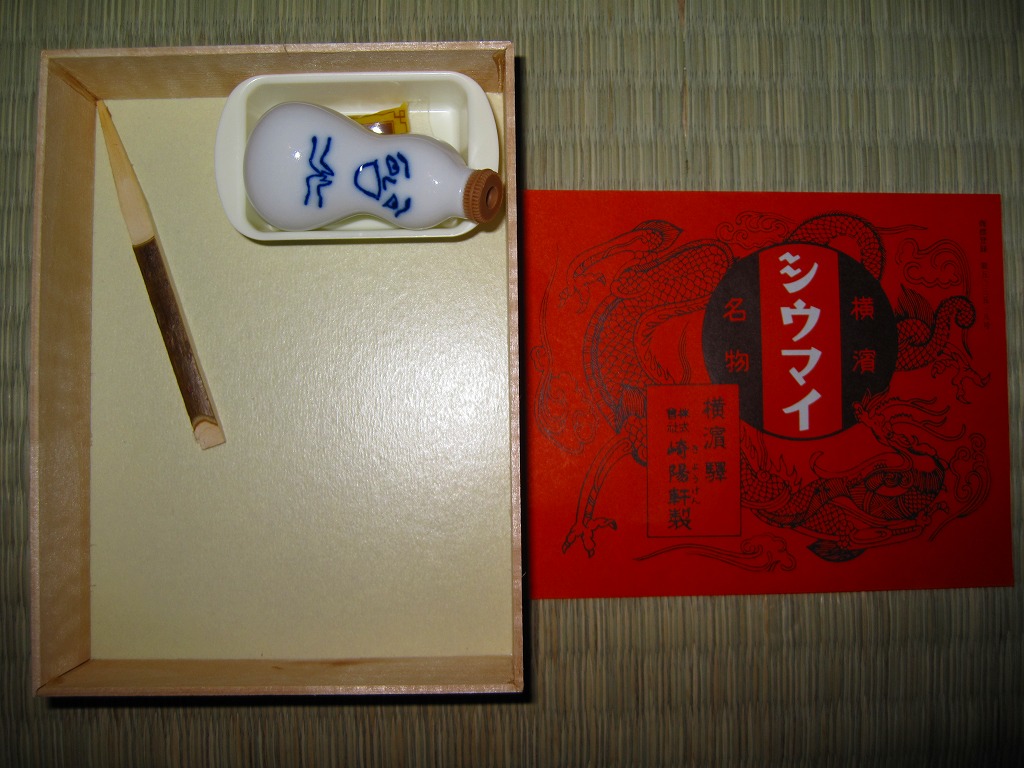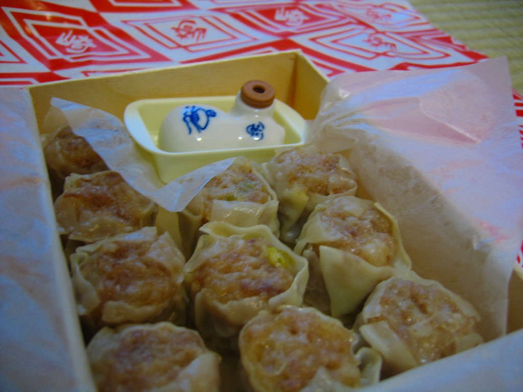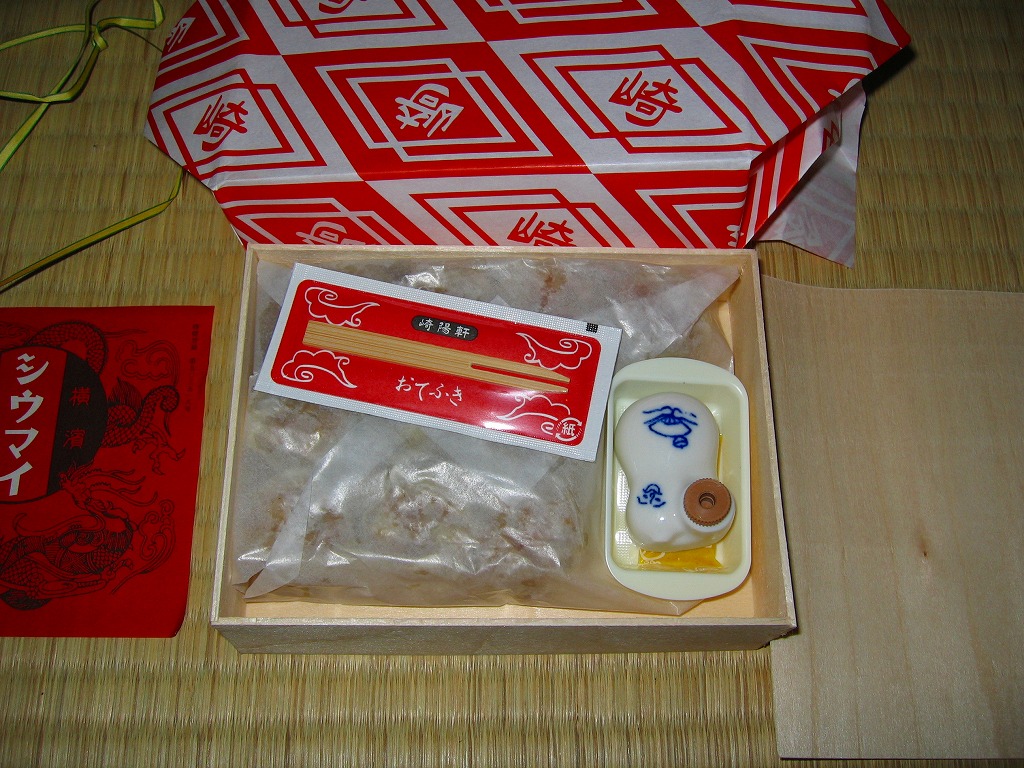 小さな経木の容器を、当時の調製元のロゴマークを印刷した包装紙で包み、今もデザインは変わらない掛紙をかけて、紙ひもでしばる。中身はいつものシウマイの10個入り。名物の醤油入れ「ひょうちゃん」とその受けとマスタードは現行品が付いていたが、そこまで復刻させるのは酷だろう。安全上の理由でもうここでは不可能と思われてきた立ち売りを再現しただけでも、鉄道会社と駅弁屋の英断に感謝したい。