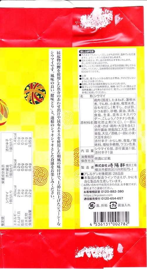 2022(令和4)年9月1日に初めて発売、19日まで販売。おめでたい席や秋の食卓に彩りを添える、和風のシウマイという売り文句。敬老の日向けの商品だろうか。特製シウマイや季節のシウマイの紙箱に、いつもの豚肉でなく鶏肉を、山梨県などで飼育されるブランド鶏「健味どり」に蓮根を混ぜ、鰹など魚介のあわせ出汁や昆布エキスを使用し和風に味付けた、皮と掛紙が黄色い特製シウマイを6個詰める。油や脂の薄い、やや爽やかな味。翌年以降は出ていない。