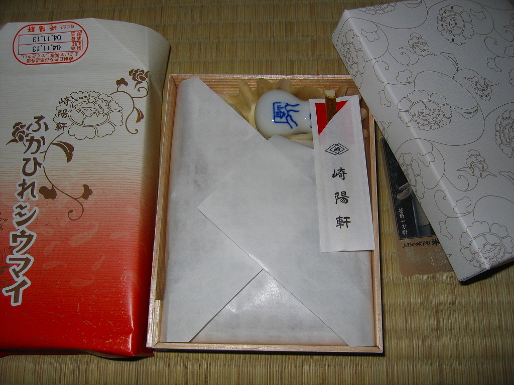 2004(平成16)年10月15日に発売、2005年1月31日まで一日100個限定で発売された、期間限定の特製シウマイ。経木枠の長方形の容器に白地花柄の紙のふたをかけ、朱色のグラデーションに金文字で商品名などを記した包装紙で包む。中身はフカヒレを重量の2割も混ぜたという特製シウマイが十個。味が淡泊なので飯のおかずや酒のつまみには向かないが、多量に混入したフカヒレの風味や食感を十分に楽しめたので、一個あたり160円という価格に割高感はなかった。