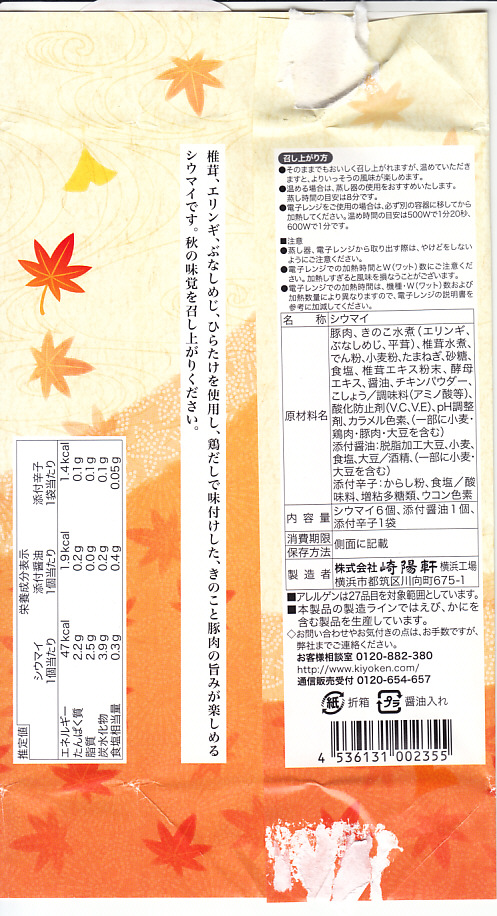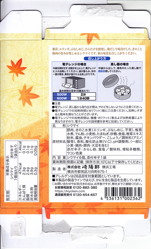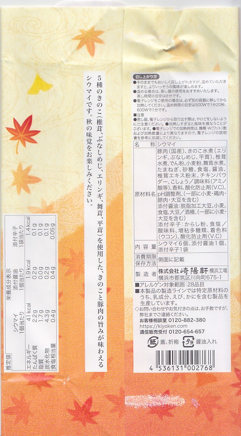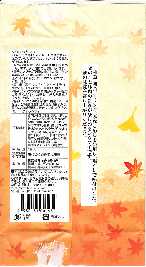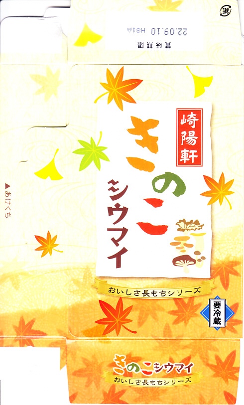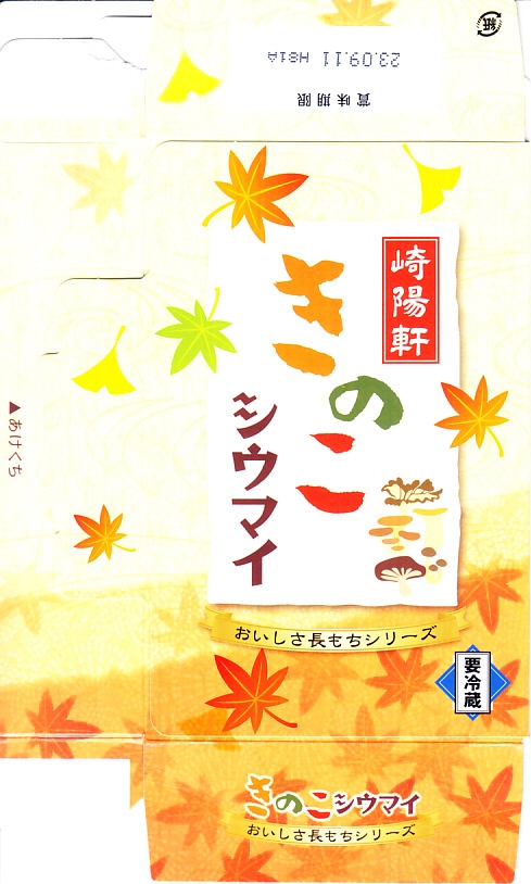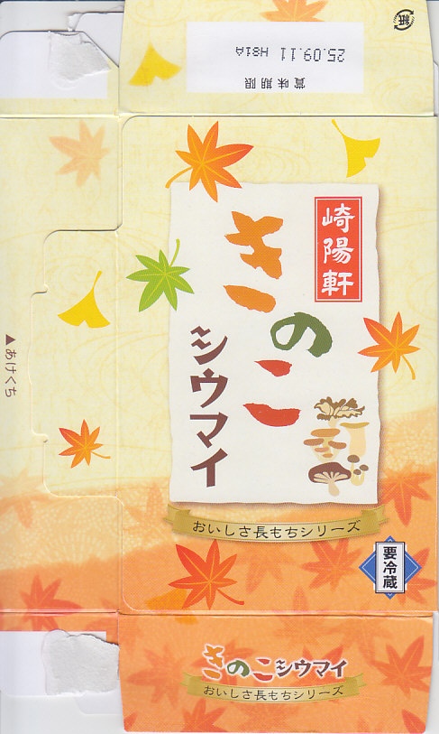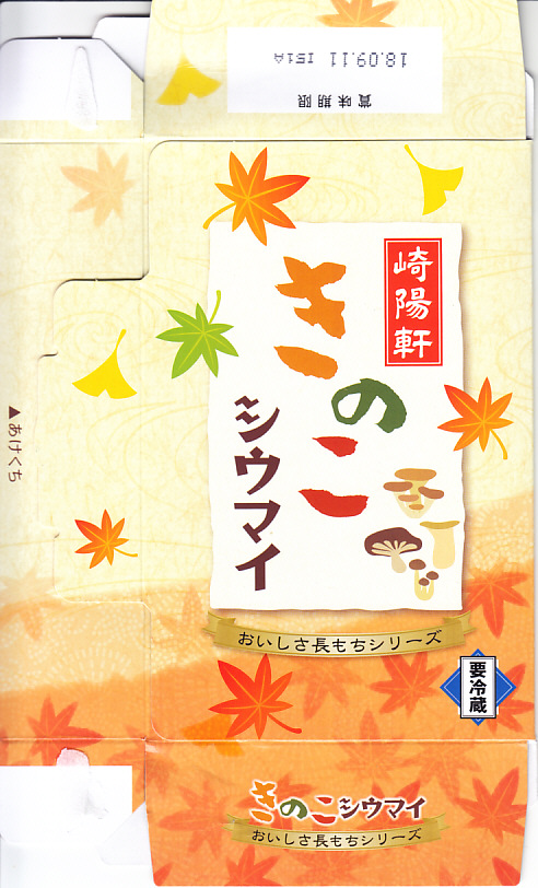 2014(平成26)年9月1日から11月30日までの販売の、秋の特製シウマイ。今回も引き続き、常温タイプと「おいしさ長もちシリーズ」の販売で、こちらは後者の冷蔵タイプ。紙箱も中身も味も据え置かれた。相変わらず、みずみずしいキノコが香る、うまいシウマイ。