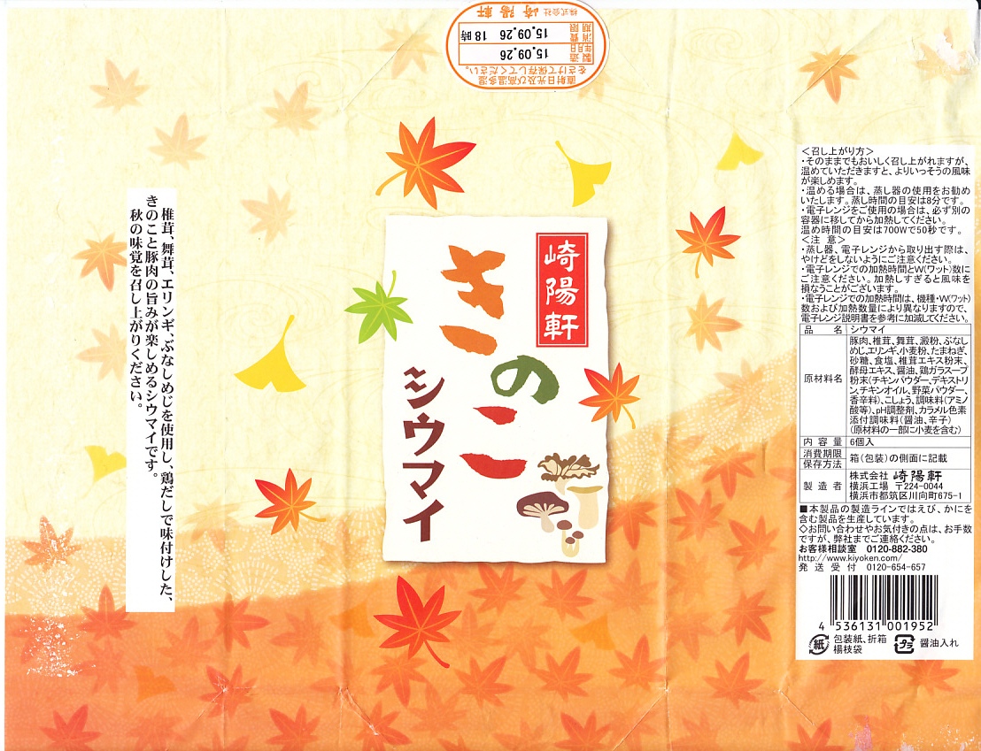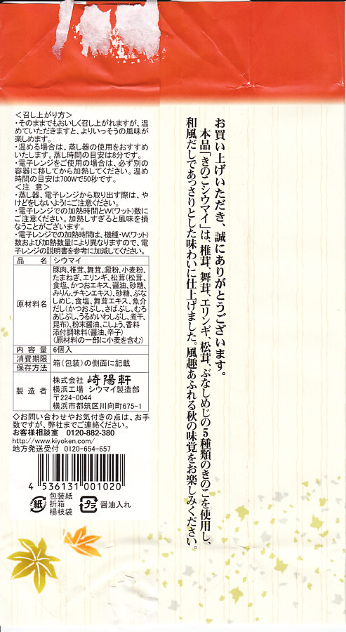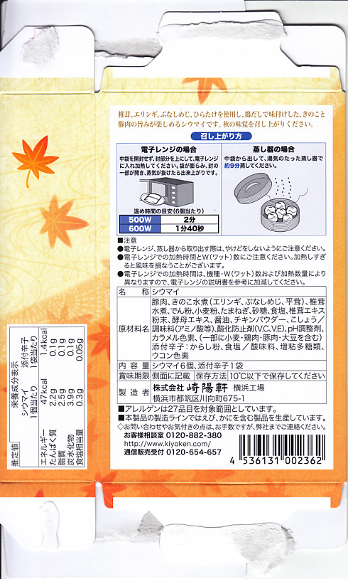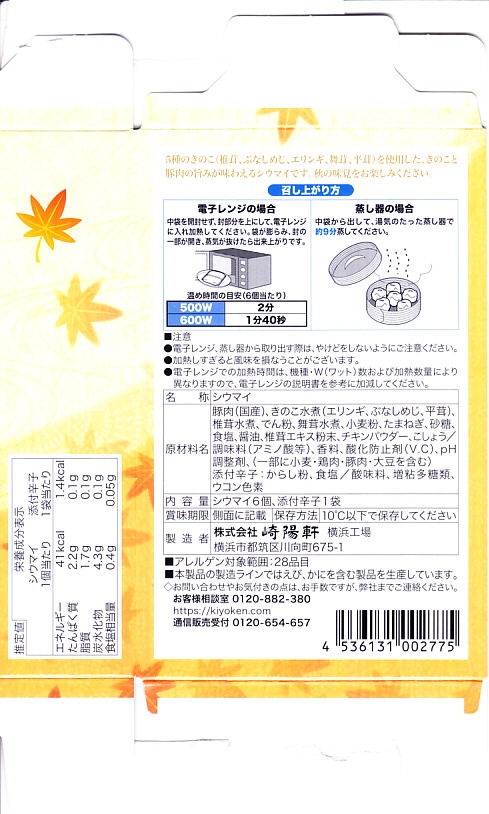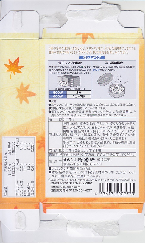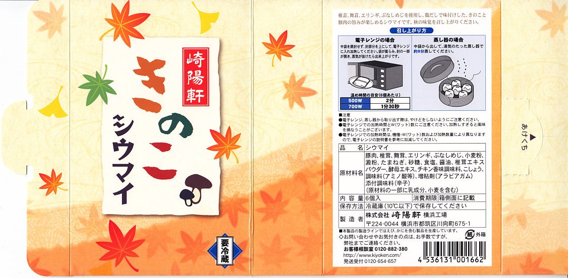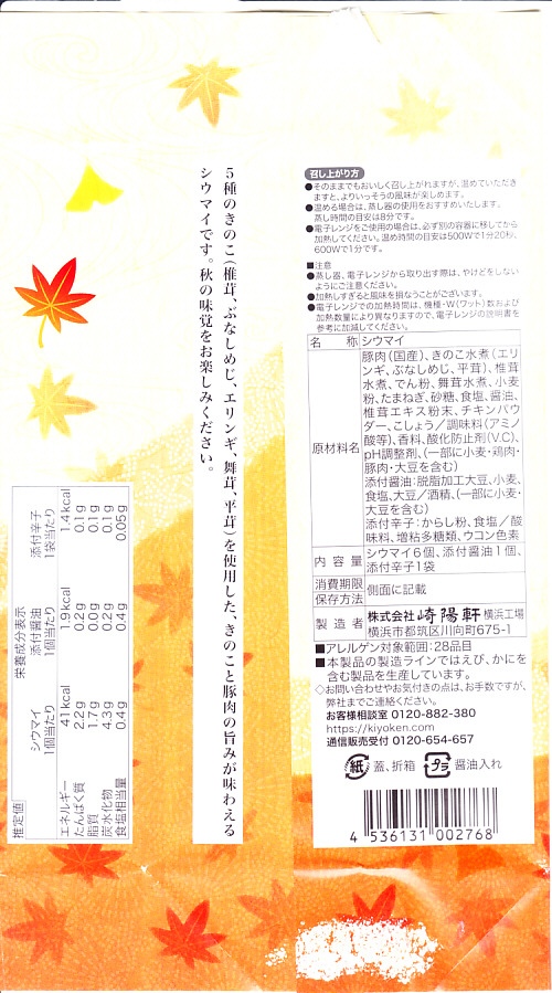 2014(平成26)年9月1日から11月30日までの販売の、秋の特製シウマイ。今回も引き続き、常温タイプと「おいしさ長もちシリーズ」の販売で、こちらは後者の冷蔵タイプ。紙箱も中身も味も据え置かれた。相変わらず、みずみずしいキノコが香る、うまいシウマイ。