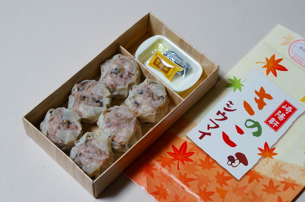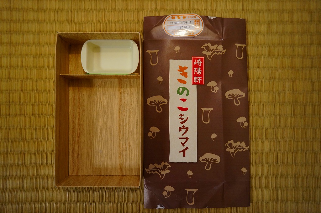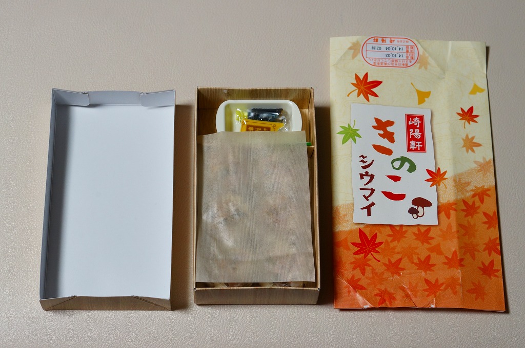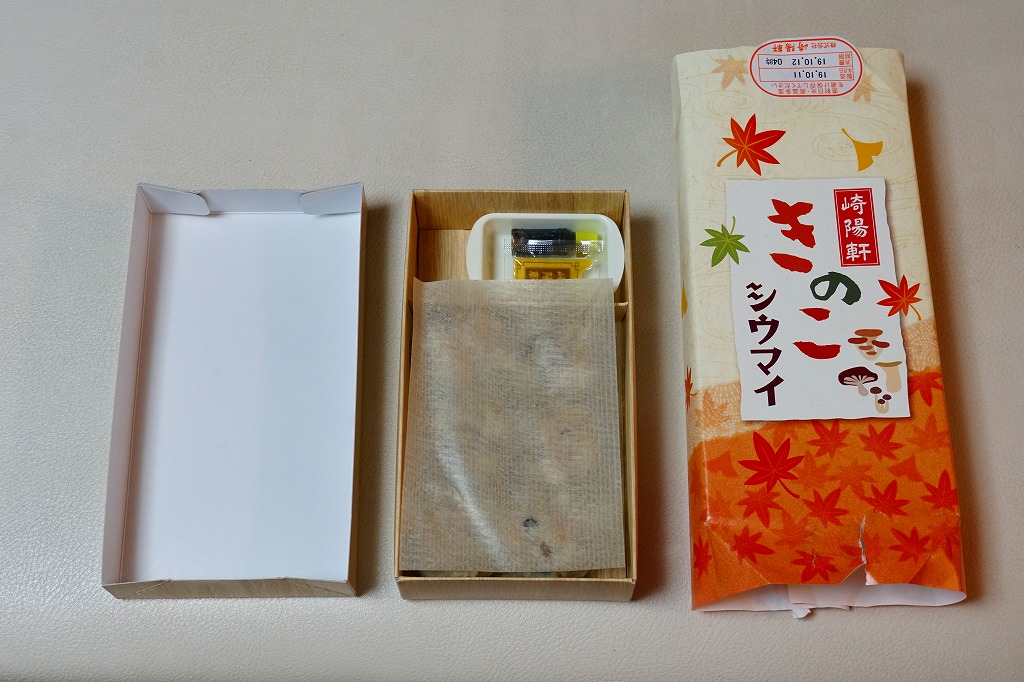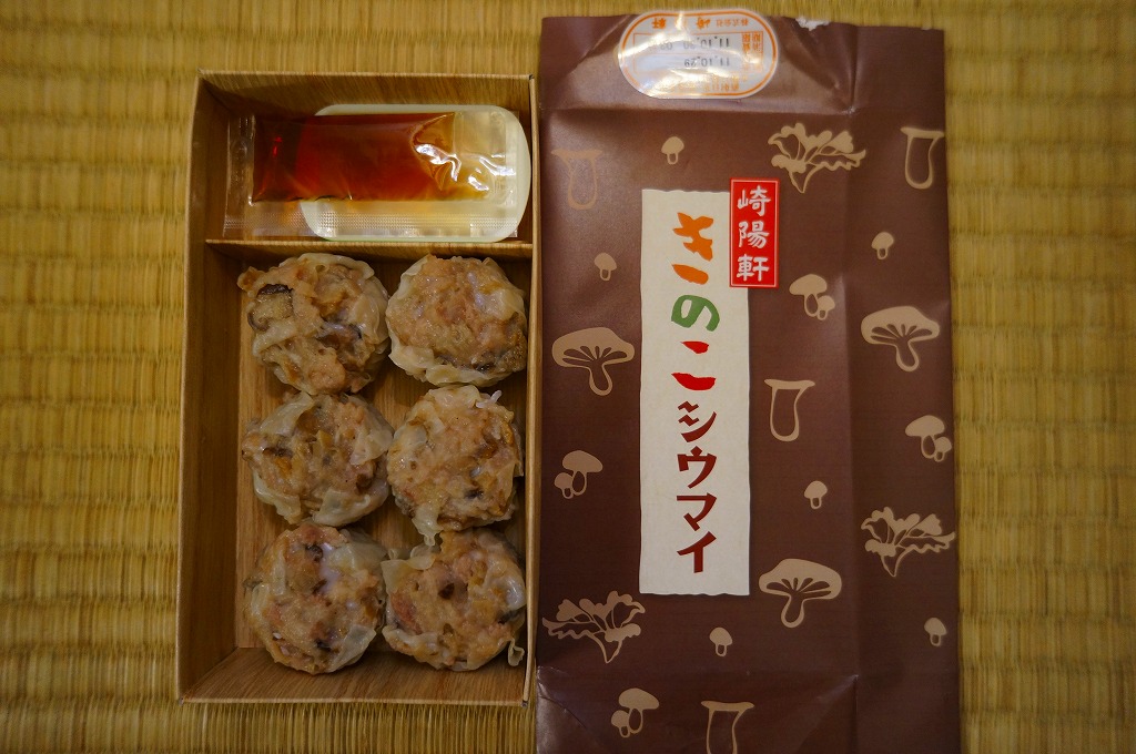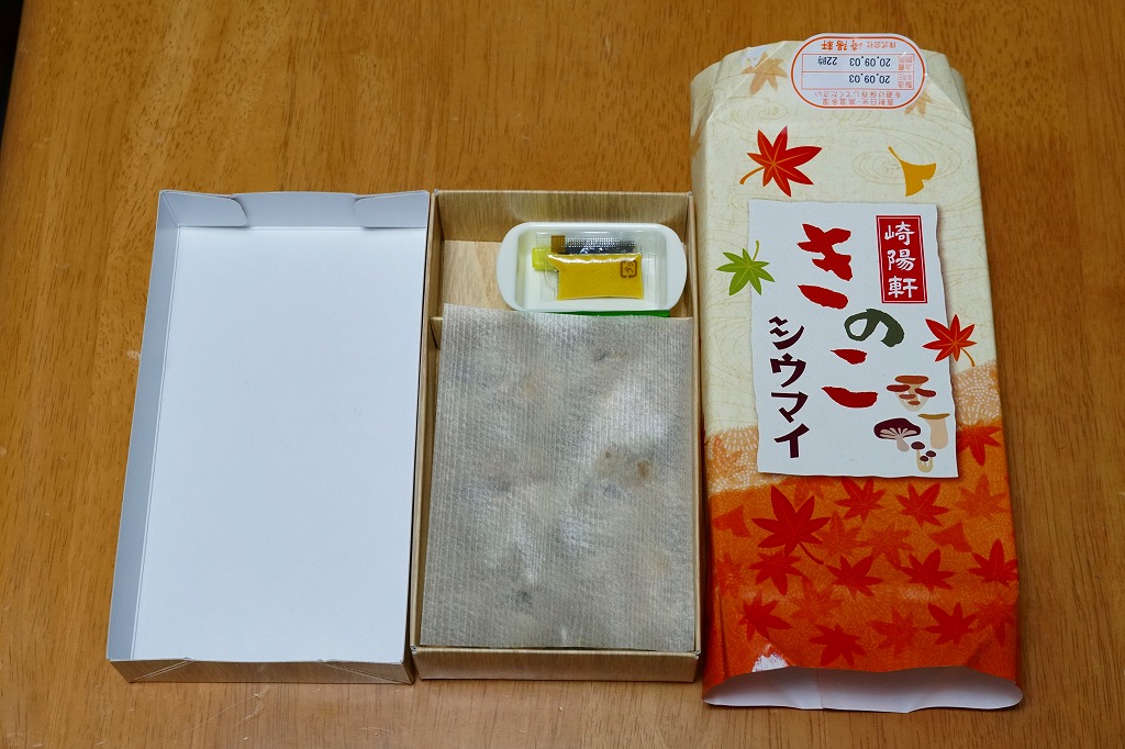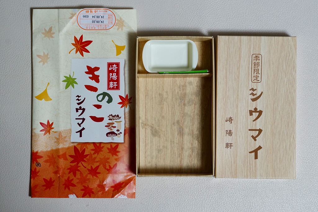 2003(平成15)年に発売された、季節の特製シウマイの秋版。今回も「きのこシウマイ」の、この常温タイプと「おいしさ長もちシリーズ」の両方を、2024(令和6)年9月1日から11月30日まで併売。折箱も包装紙も中身も風味も前年と同じで、実質的に12年連続で据え置かれた。しいたけ、ぶなしめじ、エリンギ、舞茸、ヒラタケと豚肉を混ぜ合わせた、中華の点心としては通常サイズ、崎陽軒の横浜駅弁としては大きいサイズのシウマイを、木目柄の紙箱に6個収め、醤油と辛子を添える。味も12年連続で据え置きか。価格は20円上がった。