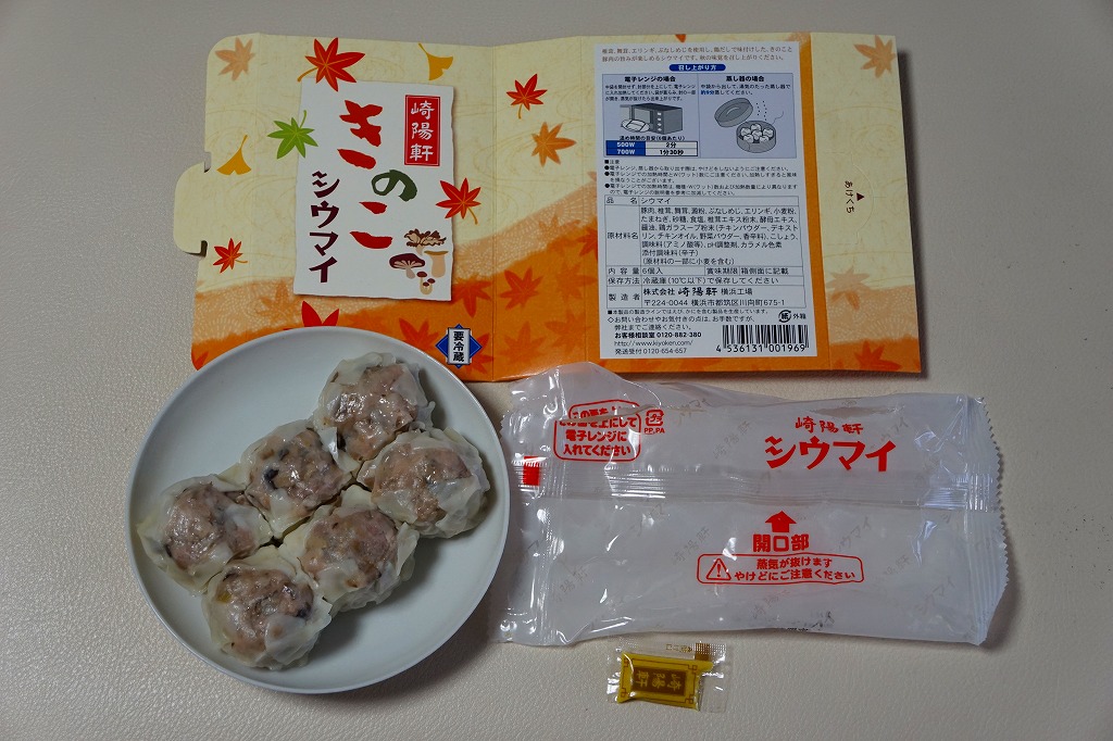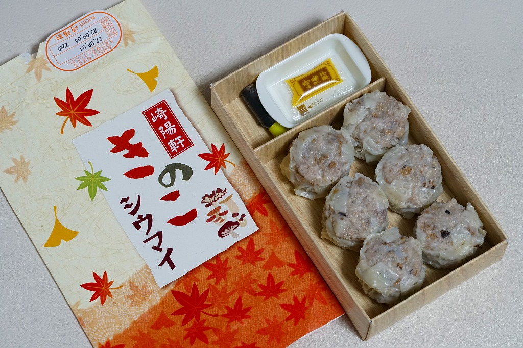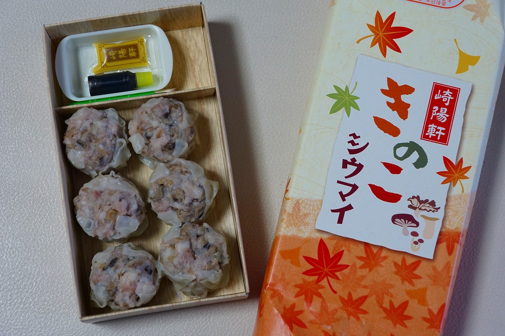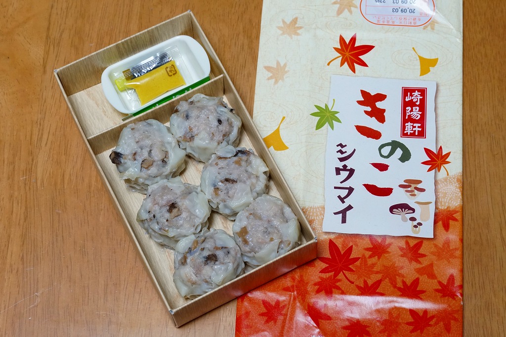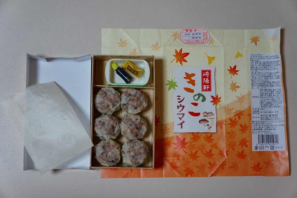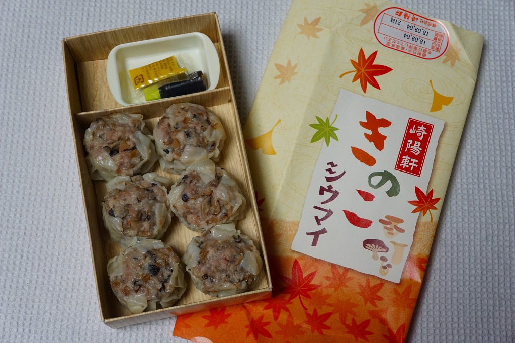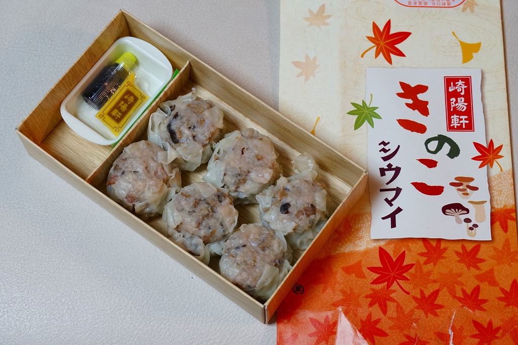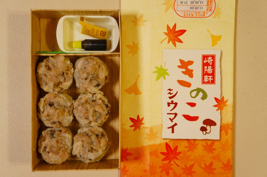2003(平成15)年に発売された、季節の特製シウマイの秋版。今回も「きのこシウマイ」の、この常温タイプと「おいしさ長もちシリーズ」の両方を、2023(令和5)年9月1日から11月30日まで併売。折箱も包装紙も中身も風味も前年と同じで、実質的に11年連続で据え置かれた。しいたけ、ぶなしめじ、エリンギ、舞茸、ヒラタケと豚肉を混ぜ合わせた、中華の点心としては通常サイズ、崎陽軒の横浜駅弁としては大きいサイズのシウマイを、木目柄の紙箱に6個収め、醤油と辛子を添える。味も11年連続で据え置きか。価格は30円上がった。