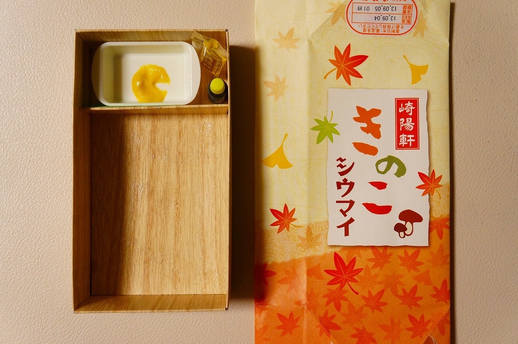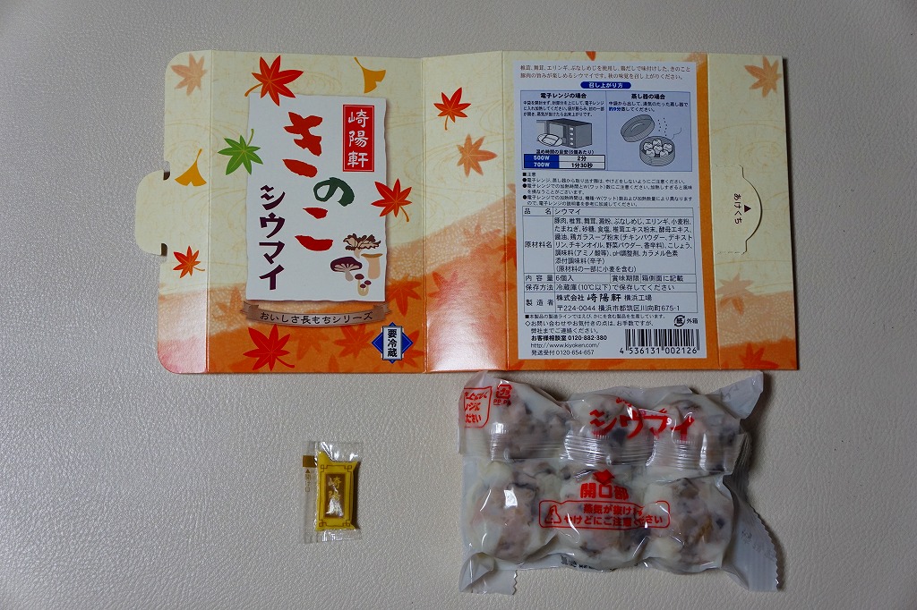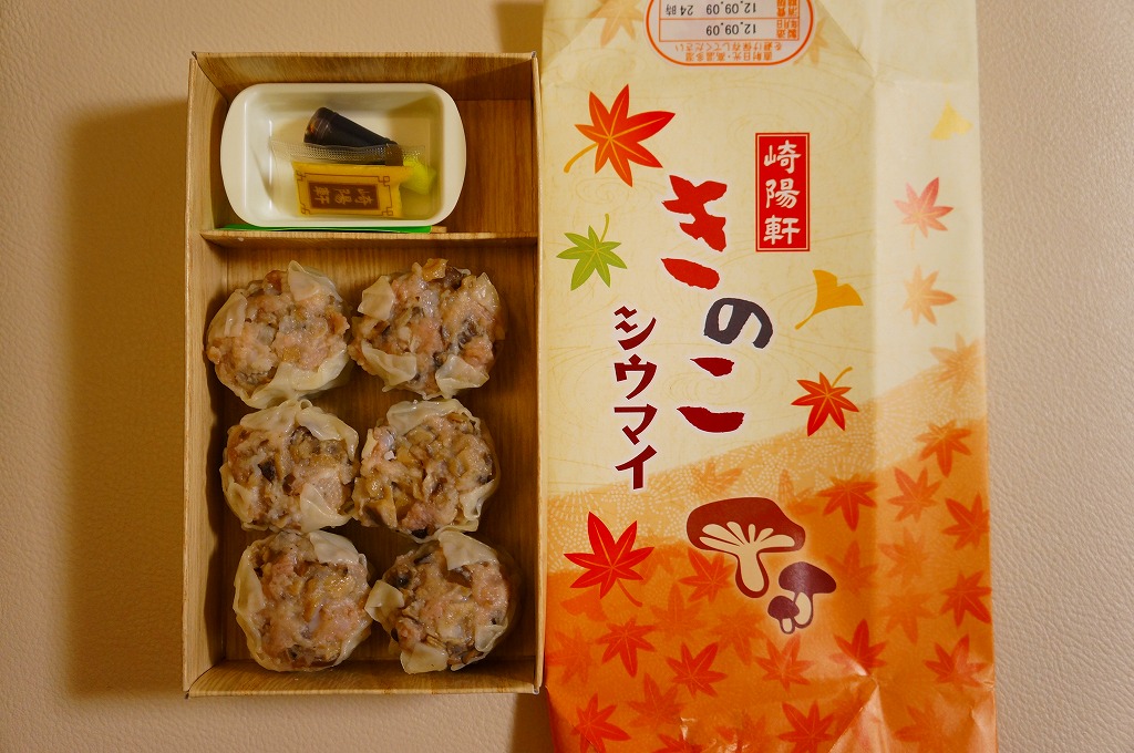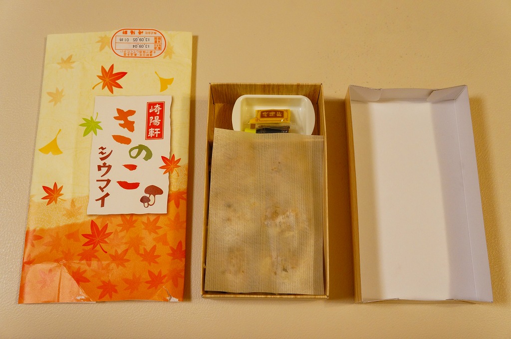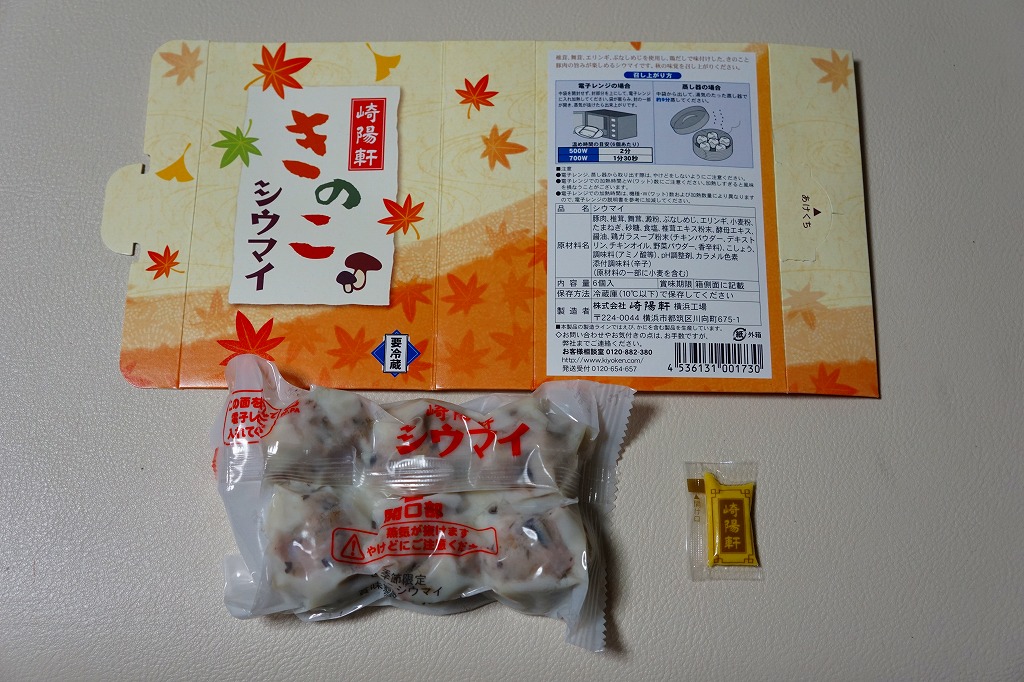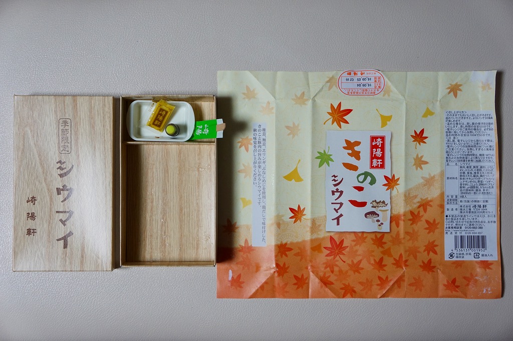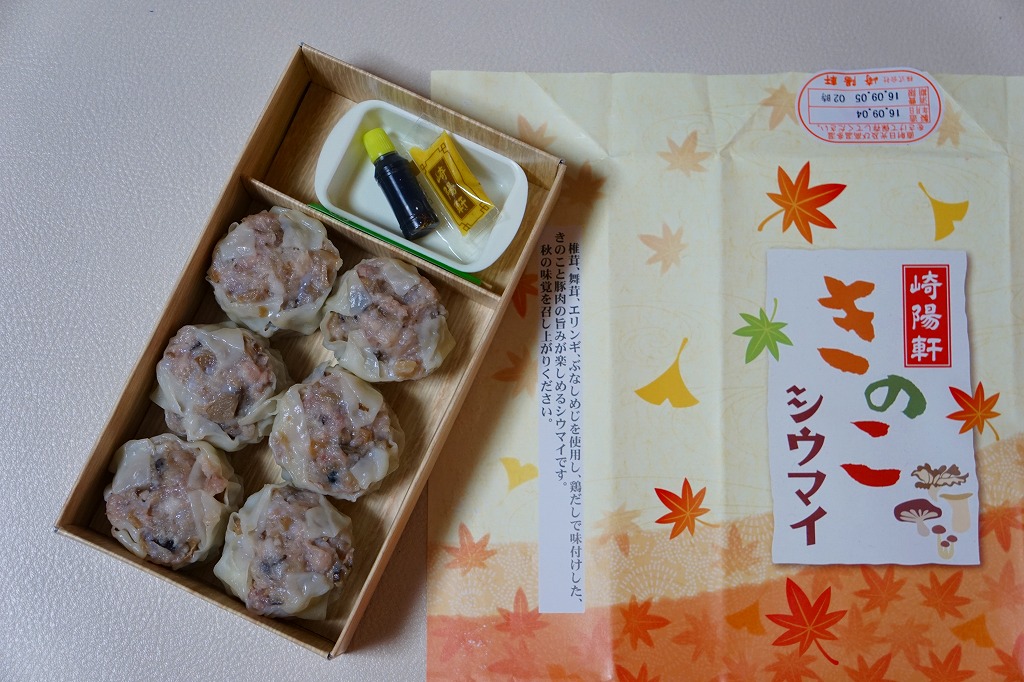 2003(平成15)年に発売された、季節の特製シウマイの秋版。今回も「きのこシウマイ」の、この常温タイプと「おいしさ長もちシリーズ」の両方を、2023(令和5)年9月1日から11月30日まで併売。折箱も包装紙も中身も風味も前年と同じで、実質的に11年連続で据え置かれた。しいたけ、ぶなしめじ、エリンギ、舞茸、ヒラタケと豚肉を混ぜ合わせた、中華の点心としては通常サイズ、崎陽軒の横浜駅弁としては大きいサイズのシウマイを、木目柄の紙箱に6個収め、醤油と辛子を添える。味も11年連続で据え置きか。価格は30円上がった。