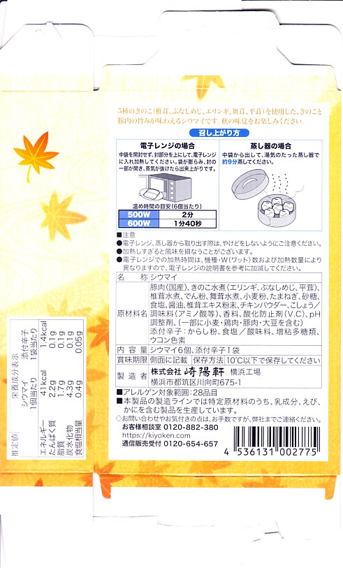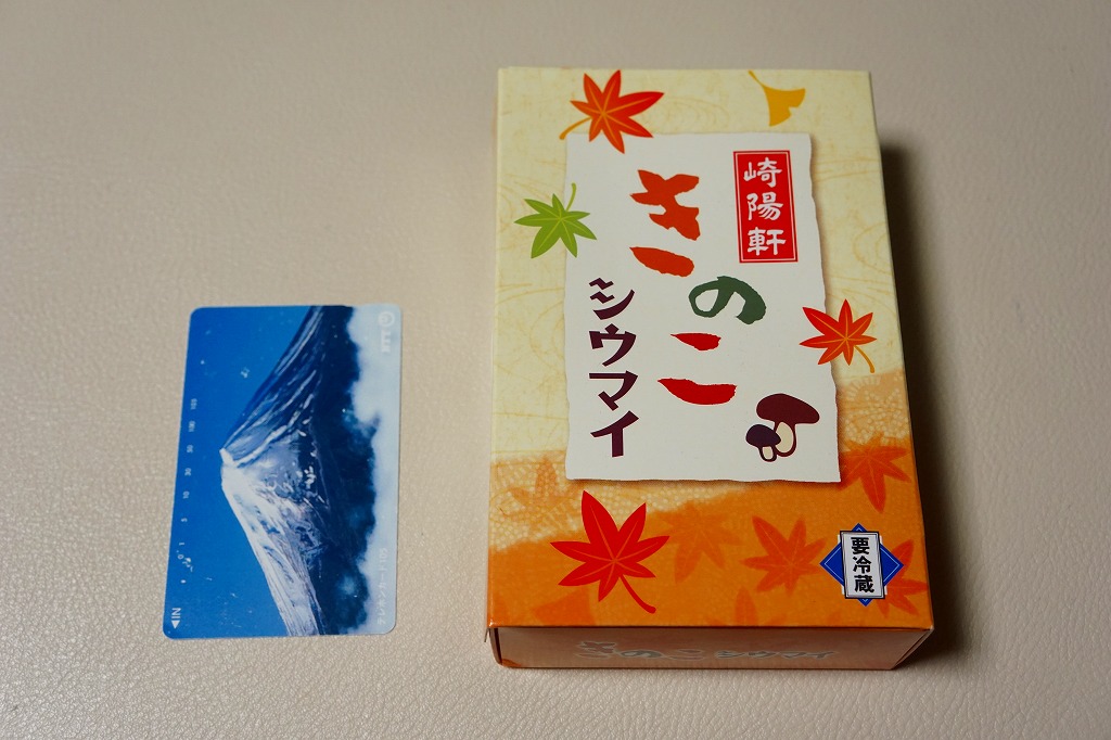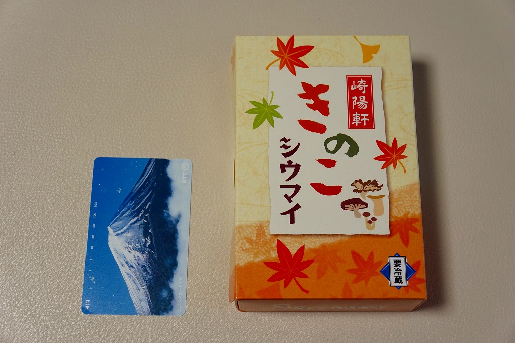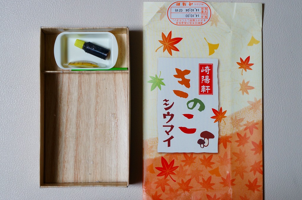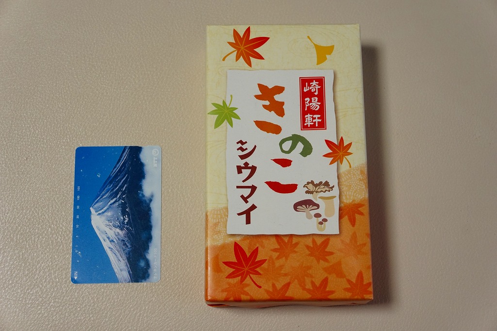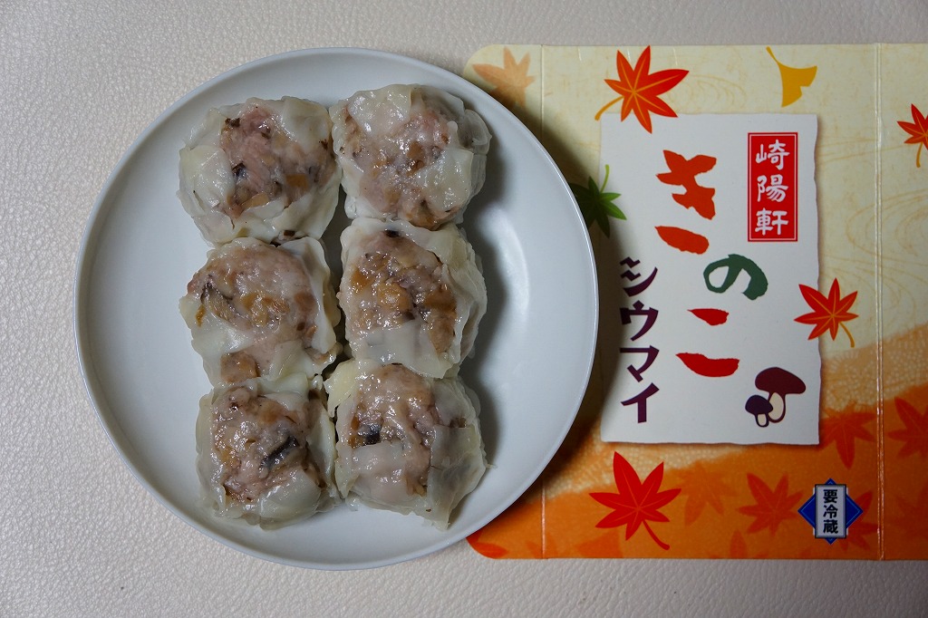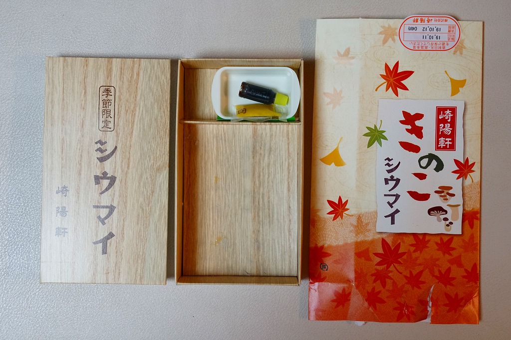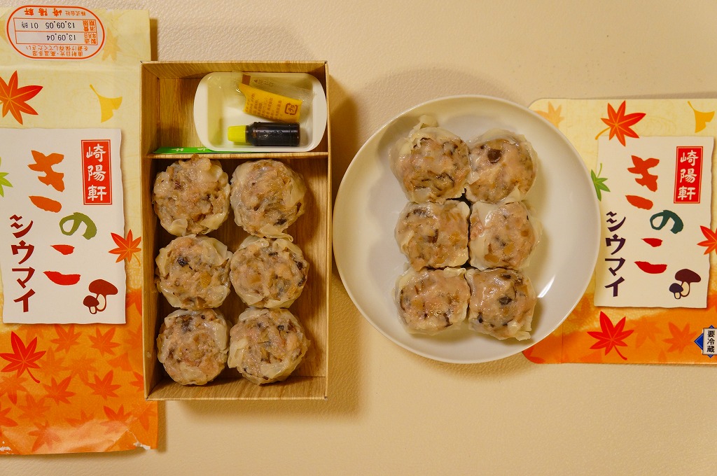 2003(平成15)年に発売された、季節の特製シウマイの秋版。今回も「きのこシウマイ」の、この常温タイプと「おいしさ長もちシリーズ」の両方を、2023(令和5)年9月1日から11月30日まで併売。折箱も包装紙も中身も風味も前年と同じで、実質的に11年連続で据え置かれた。しいたけ、ぶなしめじ、エリンギ、舞茸、ヒラタケと豚肉を混ぜ合わせた、中華の点心としては通常サイズ、崎陽軒の横浜駅弁としては大きいサイズのシウマイを、木目柄の紙箱に6個収め、醤油と辛子を添える。味も11年連続で据え置きか。価格は30円上がった。