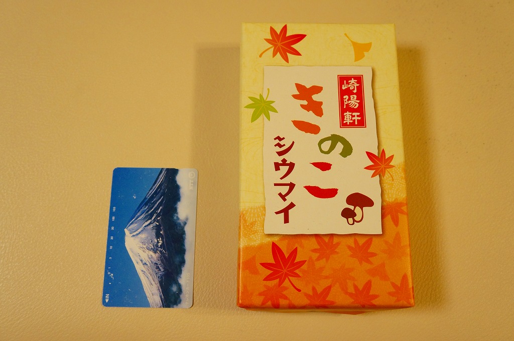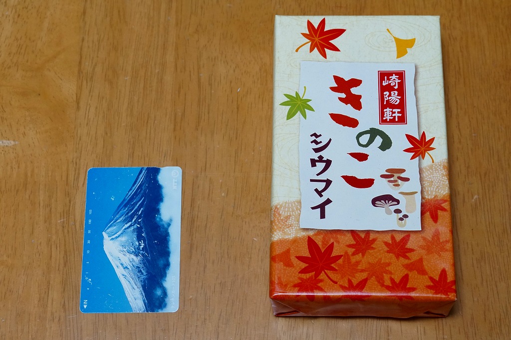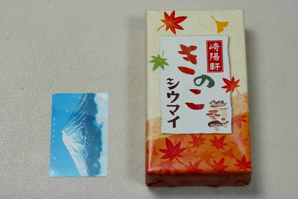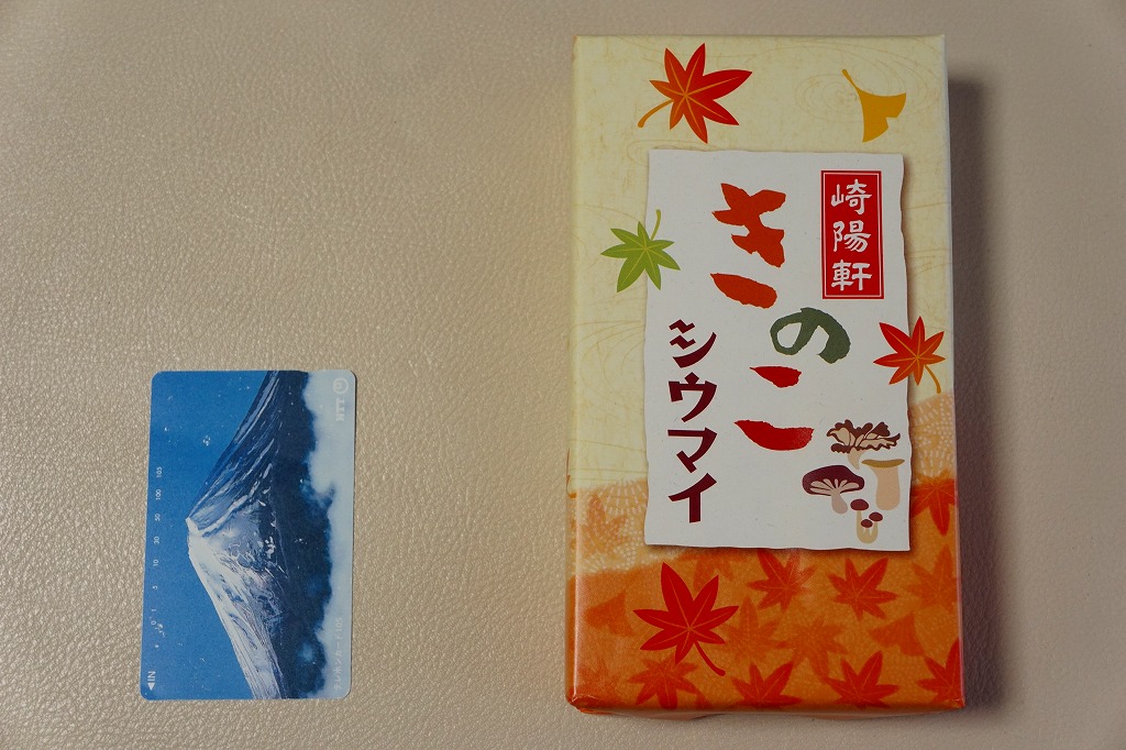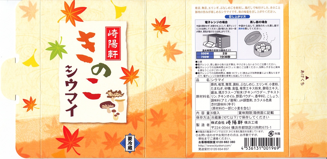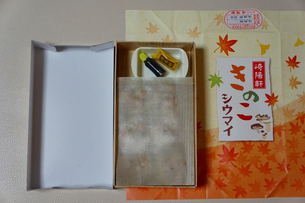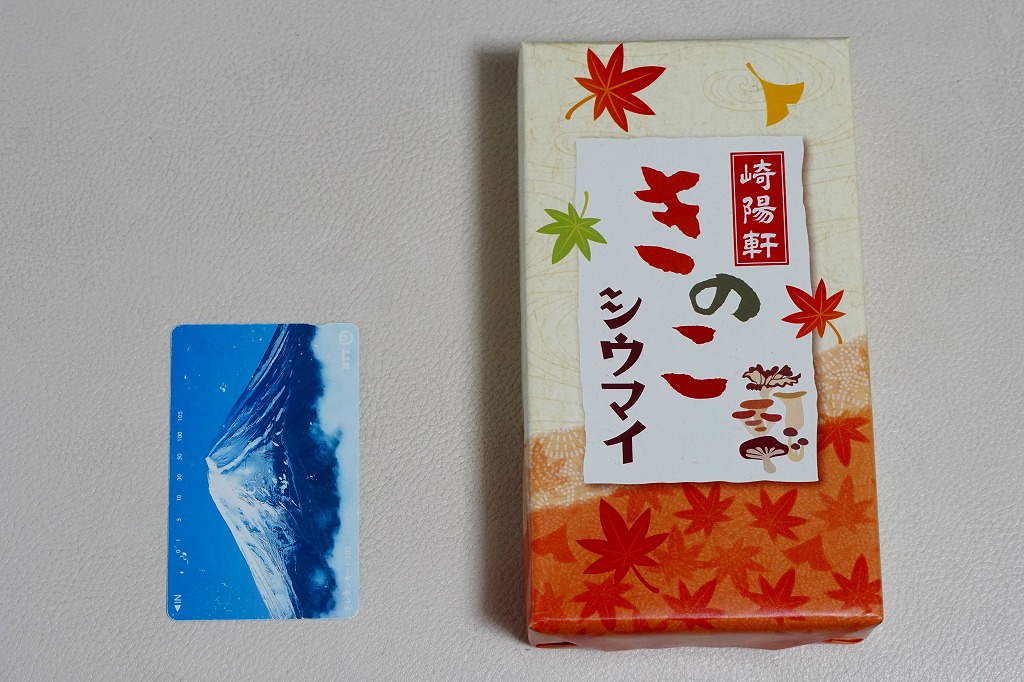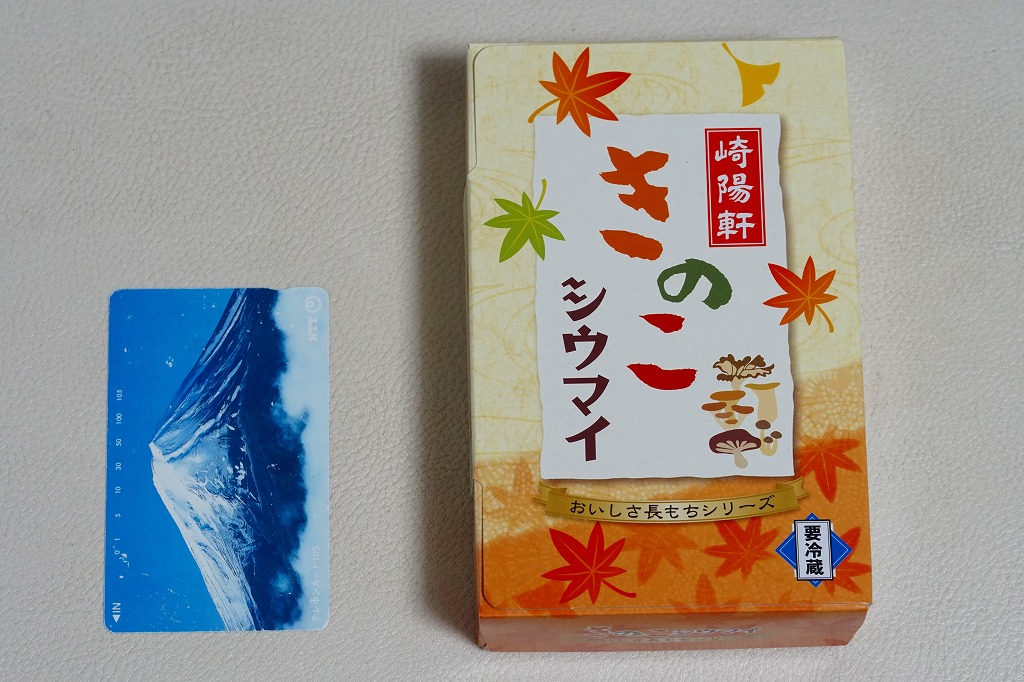 2003(平成15)年に発売された、季節の特製シウマイの秋版。今回も「きのこシウマイ」の、この常温タイプと「おいしさ長もちシリーズ」の両方を、2023(令和5)年9月1日から11月30日まで併売。折箱も包装紙も中身も風味も前年と同じで、実質的に11年連続で据え置かれた。しいたけ、ぶなしめじ、エリンギ、舞茸、ヒラタケと豚肉を混ぜ合わせた、中華の点心としては通常サイズ、崎陽軒の横浜駅弁としては大きいサイズのシウマイを、木目柄の紙箱に6個収め、醤油と辛子を添える。味も11年連続で据え置きか。価格は30円上がった。