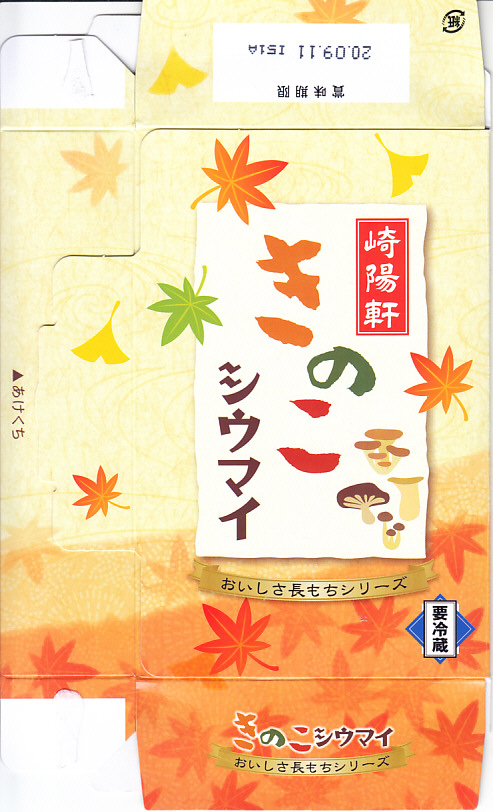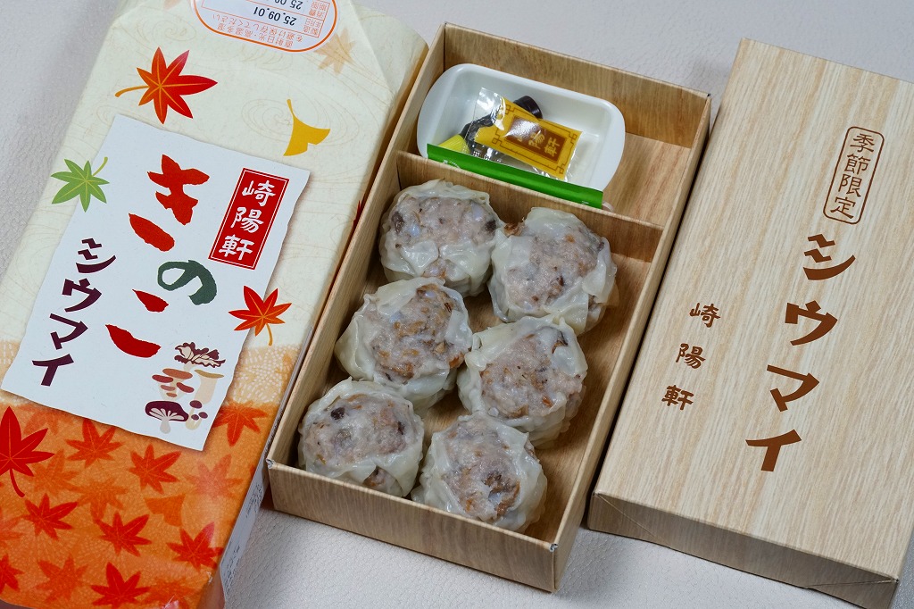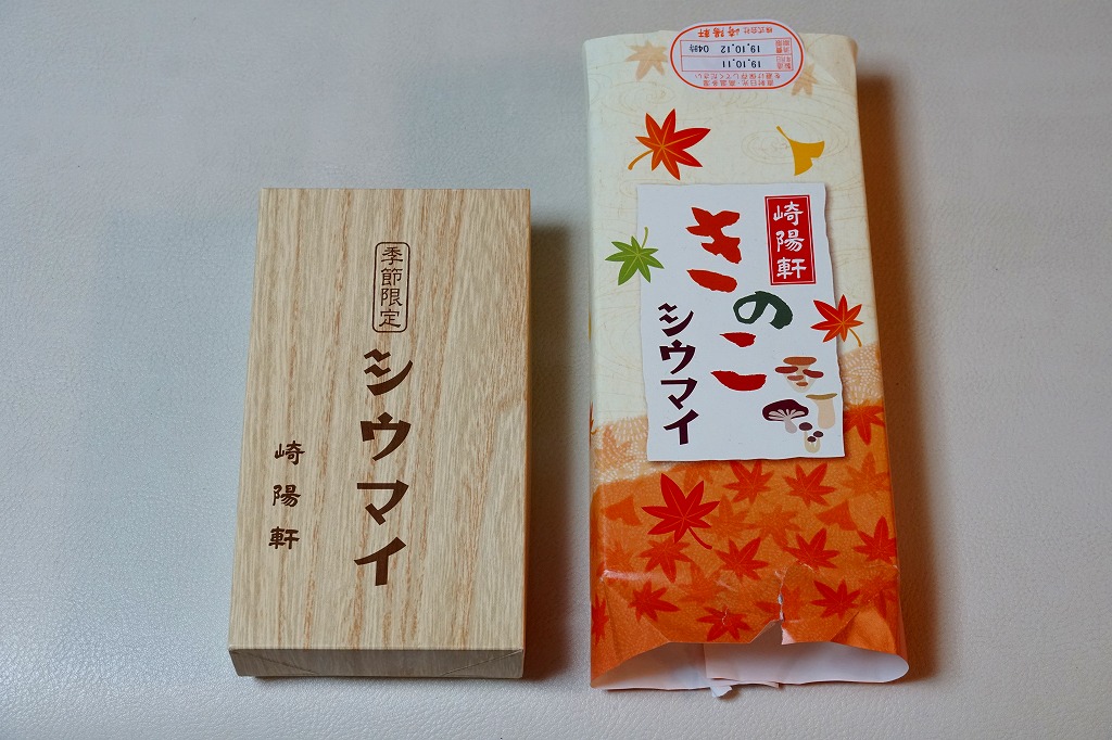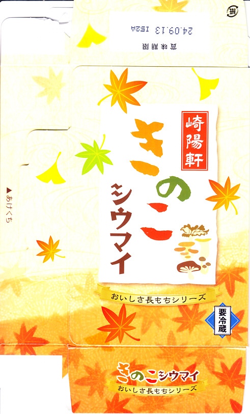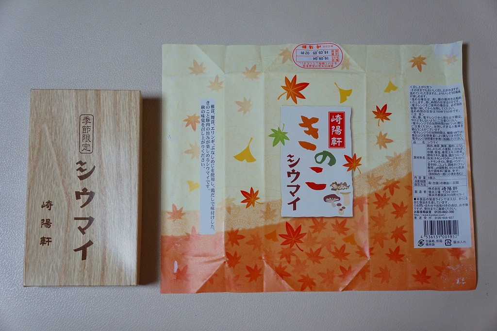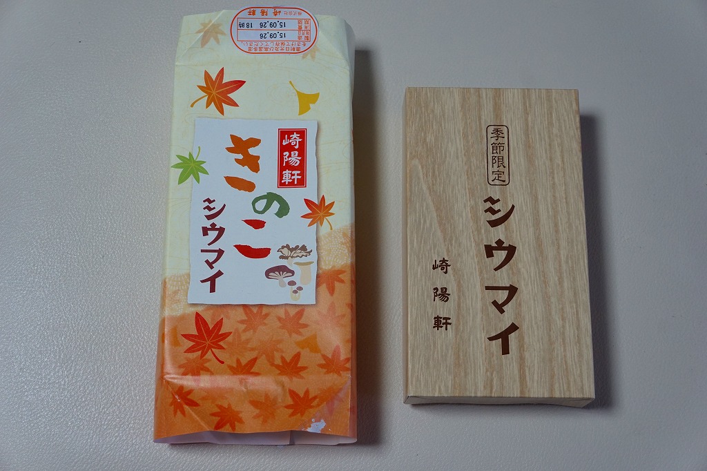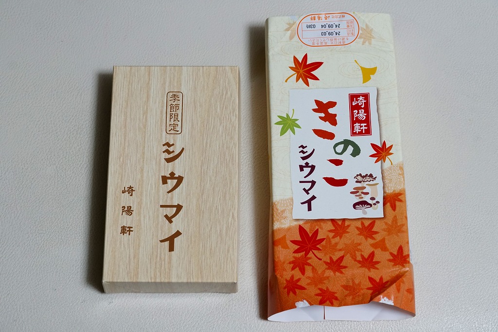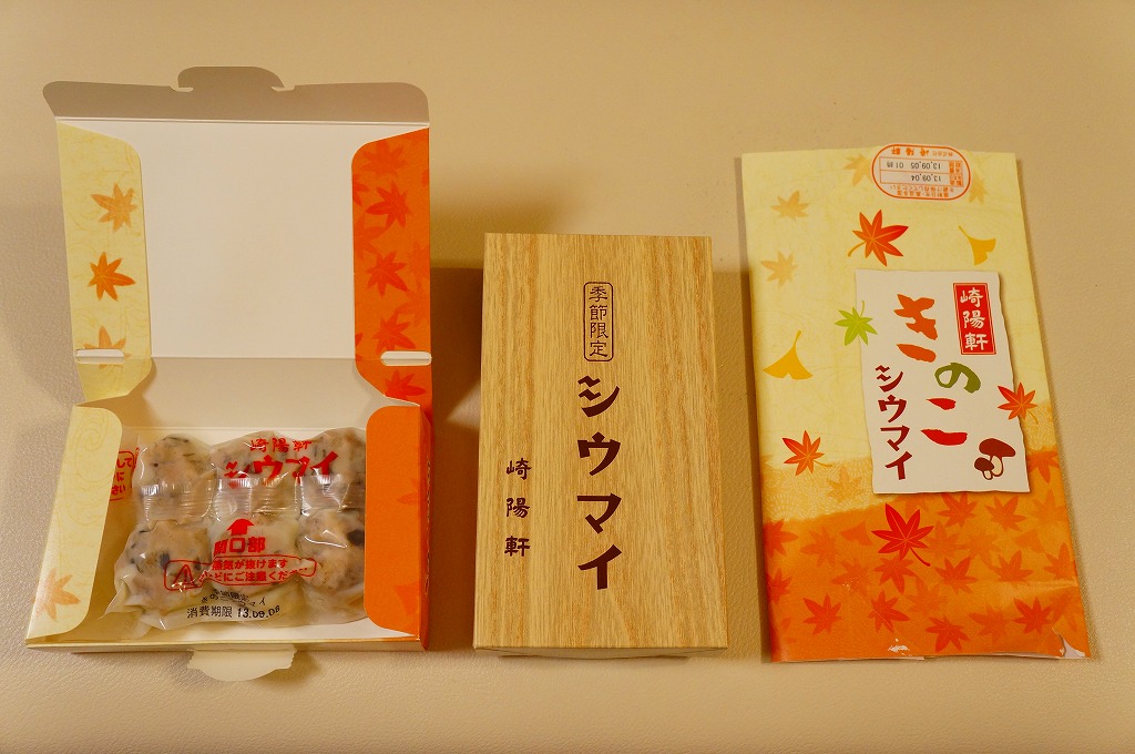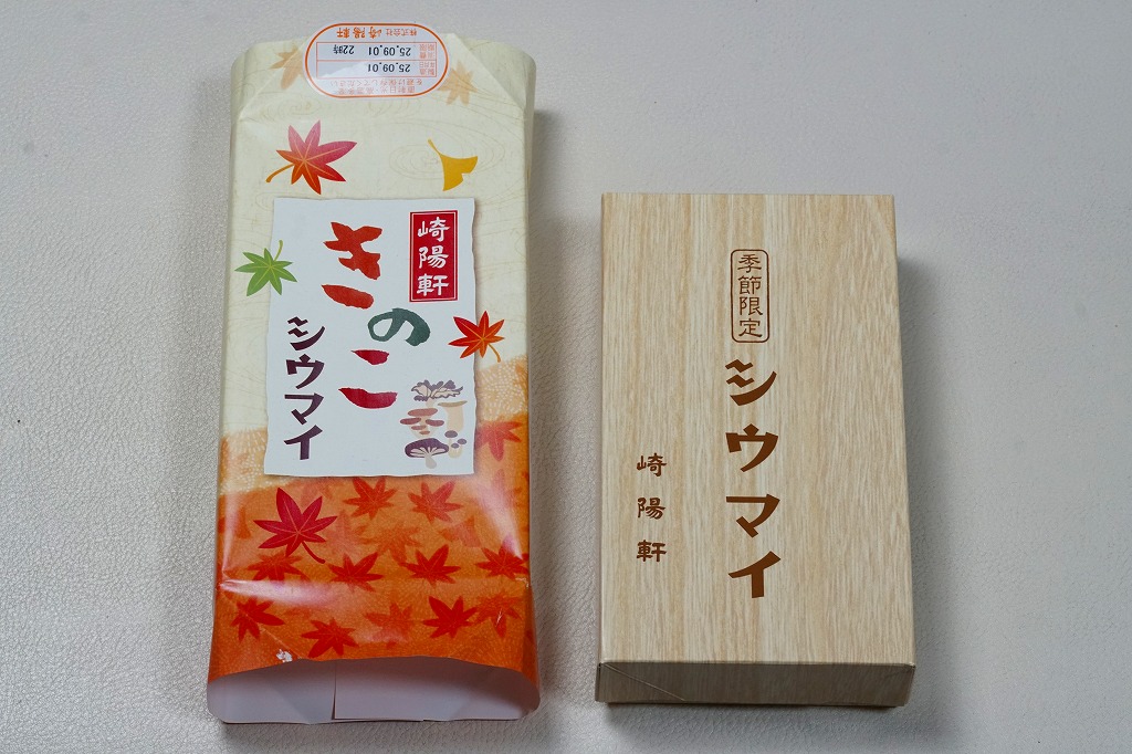 2003(平成15)年に発売された、季節の特製シウマイの秋版。今回も「きのこシウマイ」の、常温タイプとこの「おいしさ長もちシリーズ」の両方を、2023(令和5)年9月1日から11月30日まで併売。折箱も包装紙も中身も風味も前年と同じで、実質的に11年連続で据え置かれた。しいたけ、ぶなしめじ、エリンギ、舞茸、ヒラタケと豚肉を混ぜ合わせた、中華の点心としては通常サイズ、崎陽軒の横浜駅弁としては大きいサイズのシウマイを、樹脂の袋で押し潰して箱に詰め、辛子を添える。味も11年連続で据え置きか。価格は30円上がった。