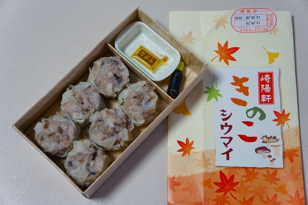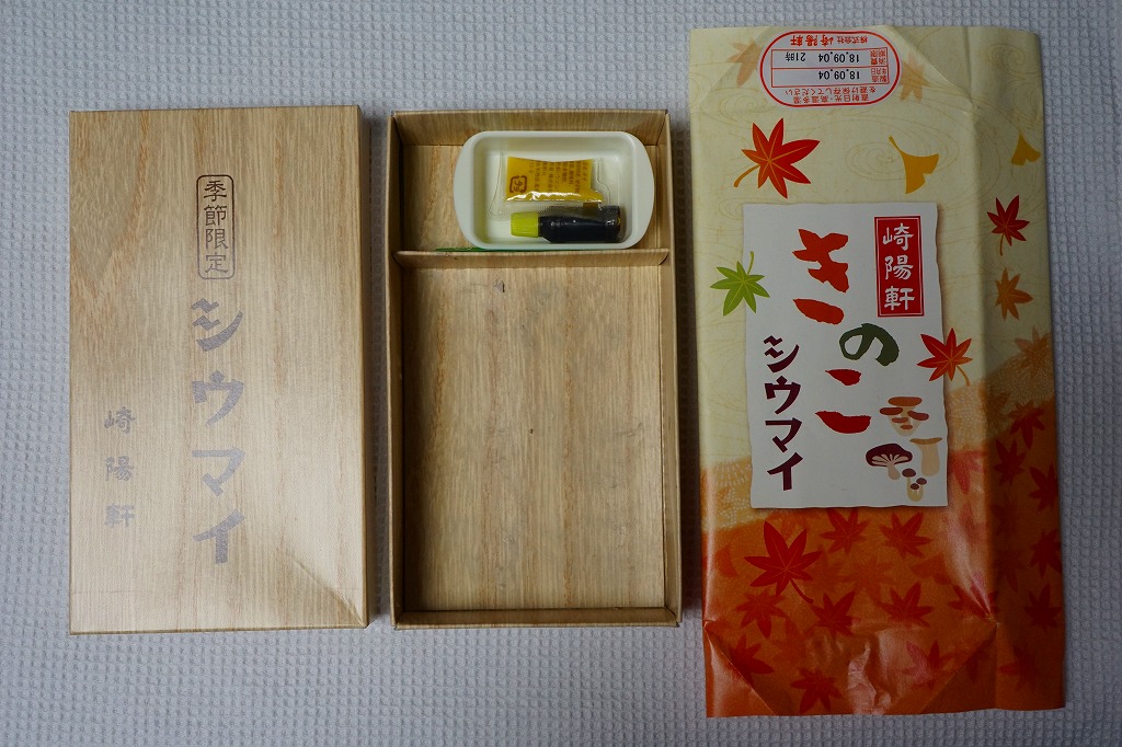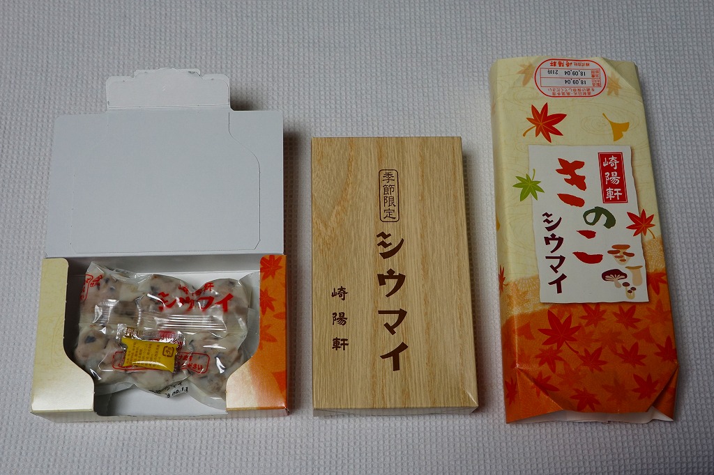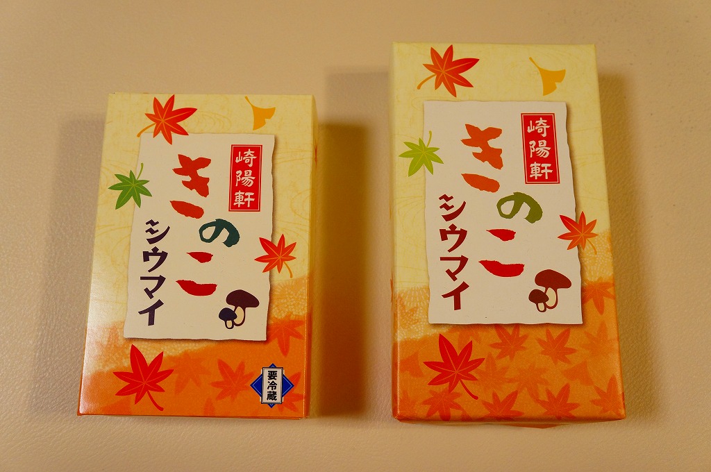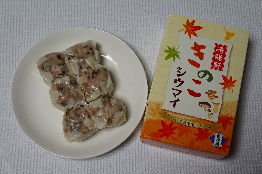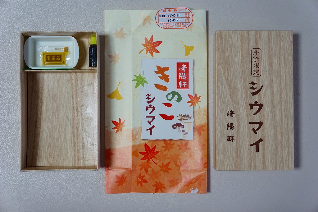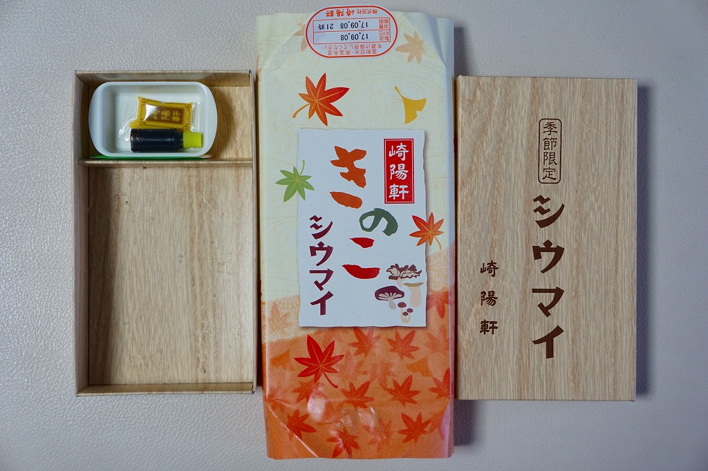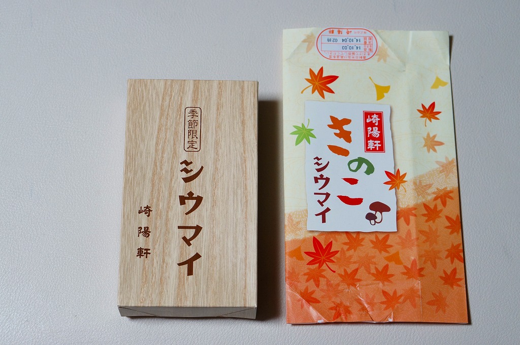 2003(平成15)年に発売された、季節の特製シウマイの秋版。今回も「きのこシウマイ」の、常温タイプとこの「おいしさ長もちシリーズ」の両方を、2023(令和5)年9月1日から11月30日まで併売。折箱も包装紙も中身も風味も前年と同じで、実質的に11年連続で据え置かれた。しいたけ、ぶなしめじ、エリンギ、舞茸、ヒラタケと豚肉を混ぜ合わせた、中華の点心としては通常サイズ、崎陽軒の横浜駅弁としては大きいサイズのシウマイを、樹脂の袋で押し潰して箱に詰め、辛子を添える。味も11年連続で据え置きか。価格は30円上がった。