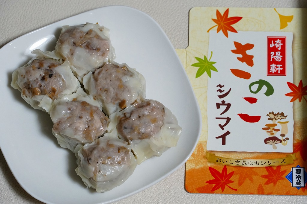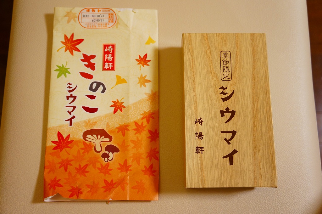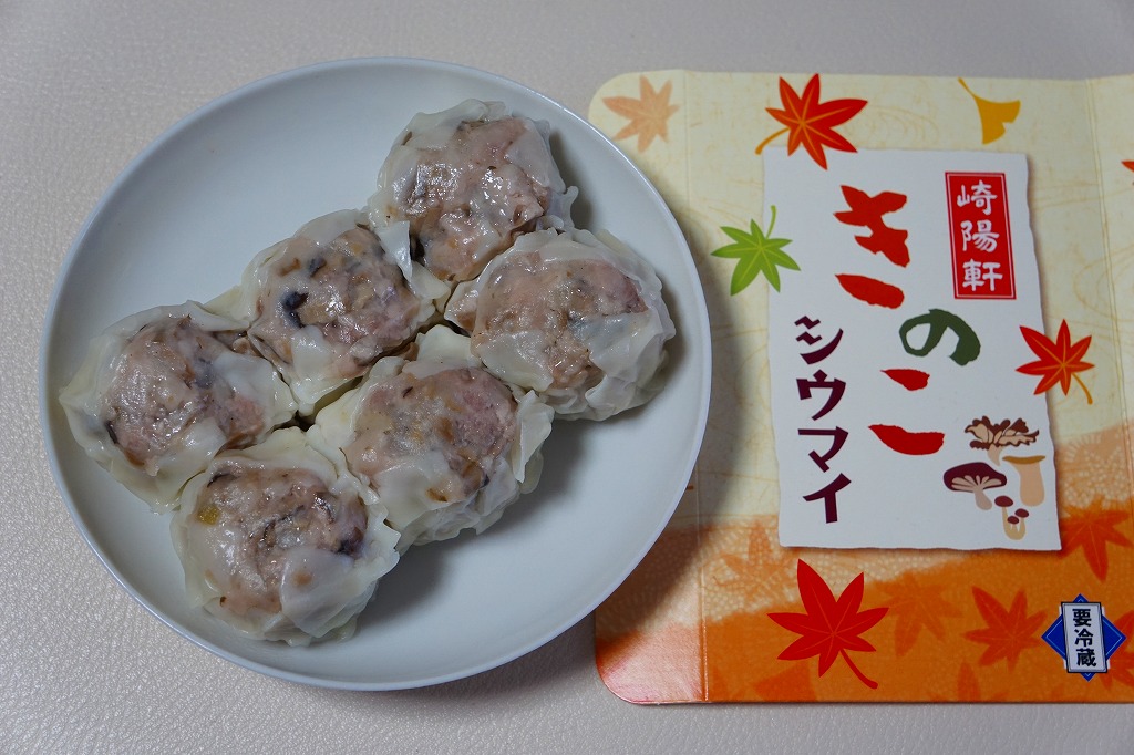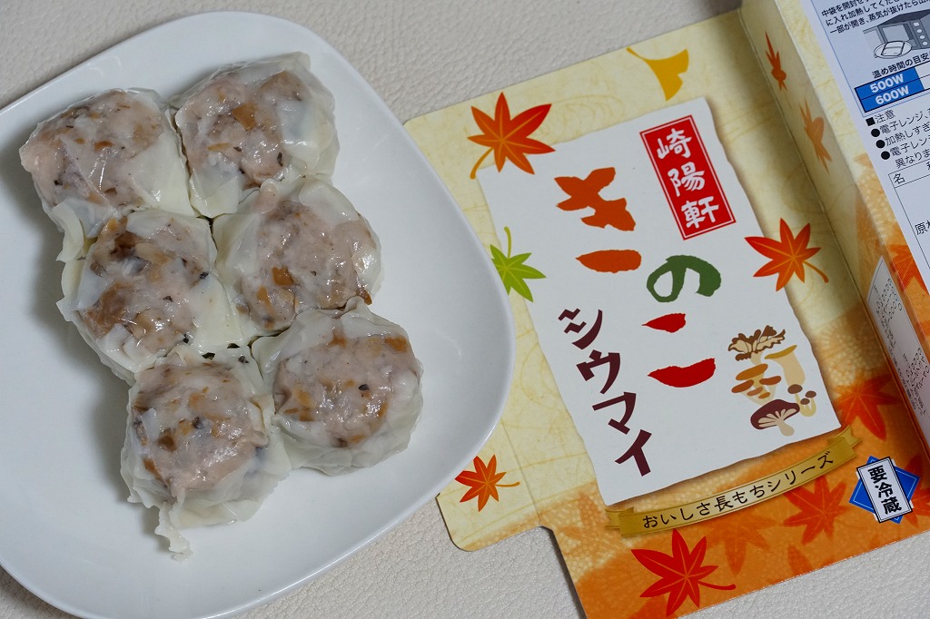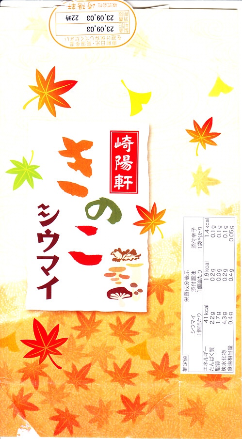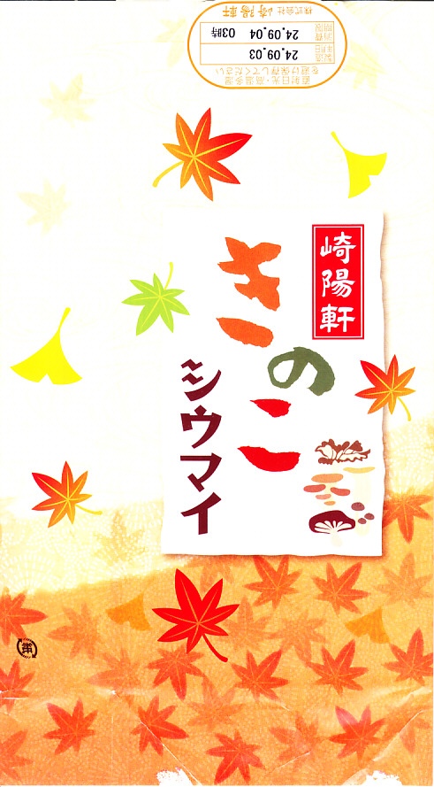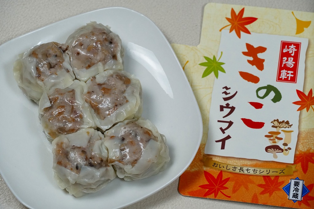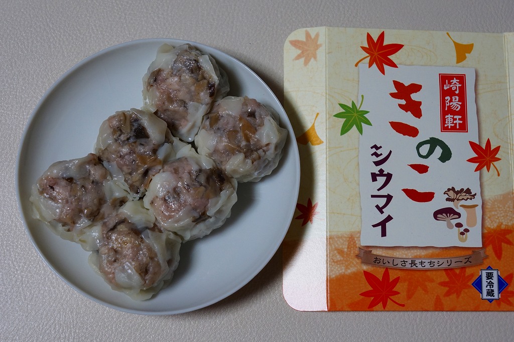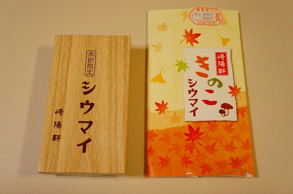 2003(平成15)年に発売された、季節の特製シウマイの秋版。今回も「きのこシウマイ」の、常温タイプとこの「おいしさ長もちシリーズ」の両方を、2023(令和5)年9月1日から11月30日まで併売。折箱も包装紙も中身も風味も前年と同じで、実質的に11年連続で据え置かれた。しいたけ、ぶなしめじ、エリンギ、舞茸、ヒラタケと豚肉を混ぜ合わせた、中華の点心としては通常サイズ、崎陽軒の横浜駅弁としては大きいサイズのシウマイを、樹脂の袋で押し潰して箱に詰め、辛子を添える。味も11年連続で据え置きか。価格は30円上がった。