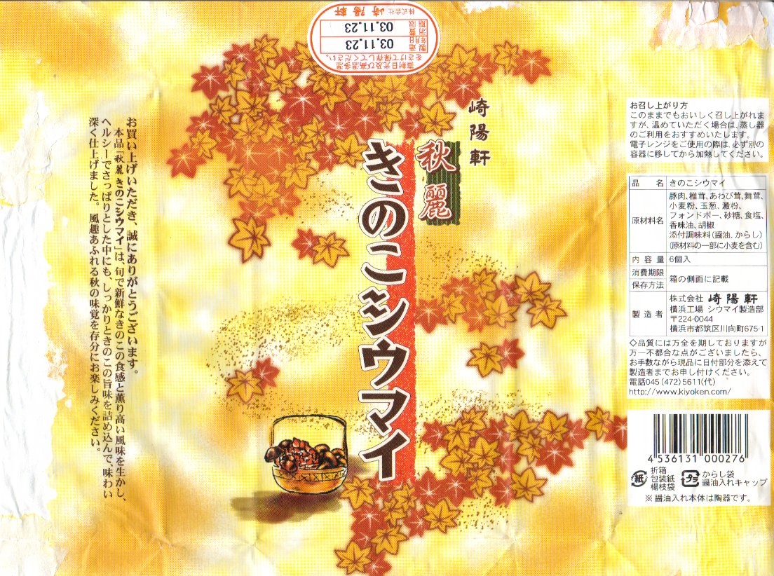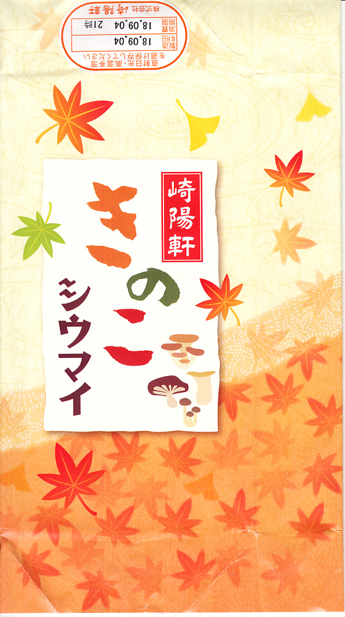 2003(平成15)年10月3日から12月20日頃まで販売された、季節限定の特製シウマイの第二弾。なお、第一弾は2003年7月27日から9月30日まで販売された「涼味いかシウマイ(550円)」。容器を開封しても感じないが、食べると舞茸や椎茸の味と食感と香りが一杯に広がるシウマイが6個、醤油入れ「ひょうちゃん」とともに入っている。