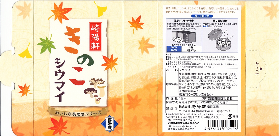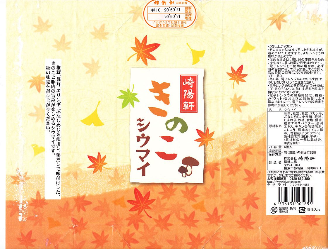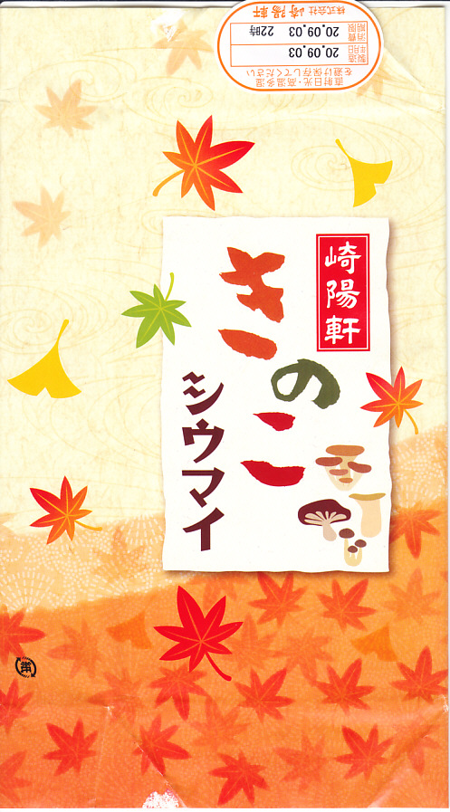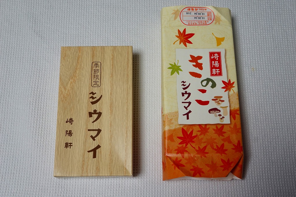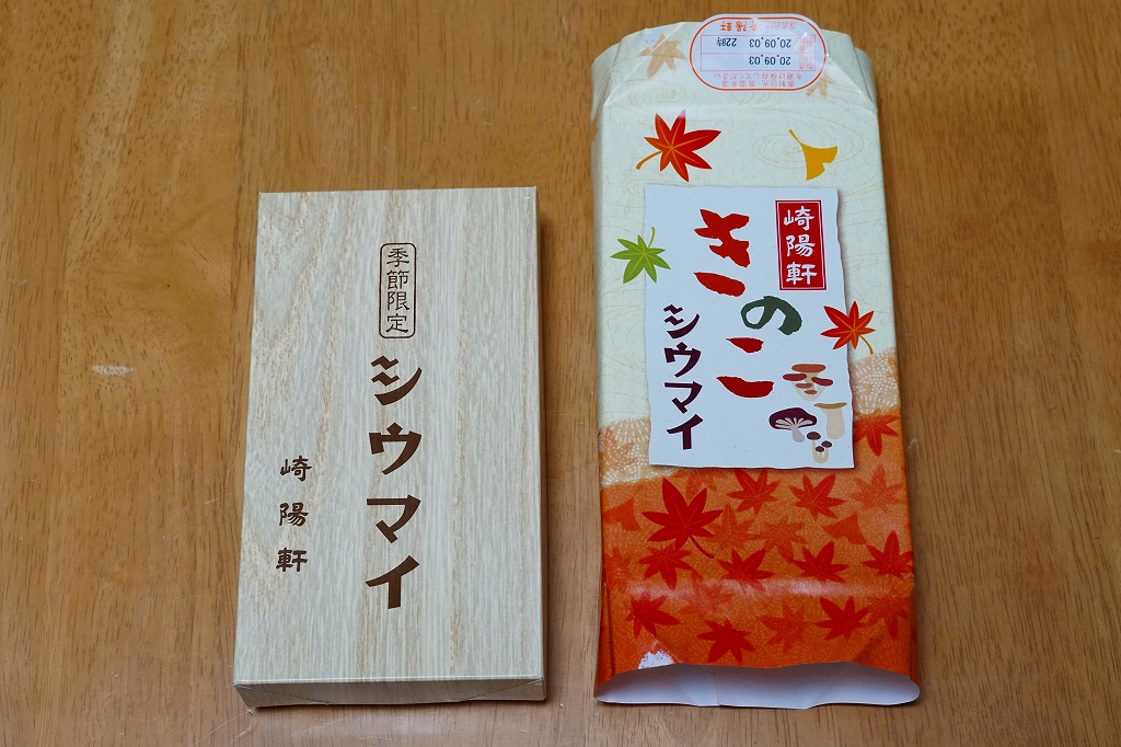 2003(平成15)年に発売された、季節の特製シウマイの秋版。今回も「きのこシウマイ」の、この常温タイプと「おいしさ長もちシリーズ」の両方を、2020(令和2)年9月1日から11月30日まで併売。折箱も包装紙も中身も風味も、前年とまったく同じで、実質的に8年連続で据え置かれた。