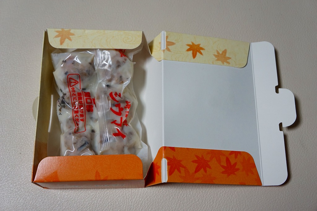 2017(平成29)年9月1日から11月30日までの販売の、秋の特製シウマイ。今回も引き続き、常温タイプと「おいしさ長もちシリーズ」の販売で、こちらは前者の常温タイプ。包装紙も紙箱も中身も味も、5年連続で据え置かれた。