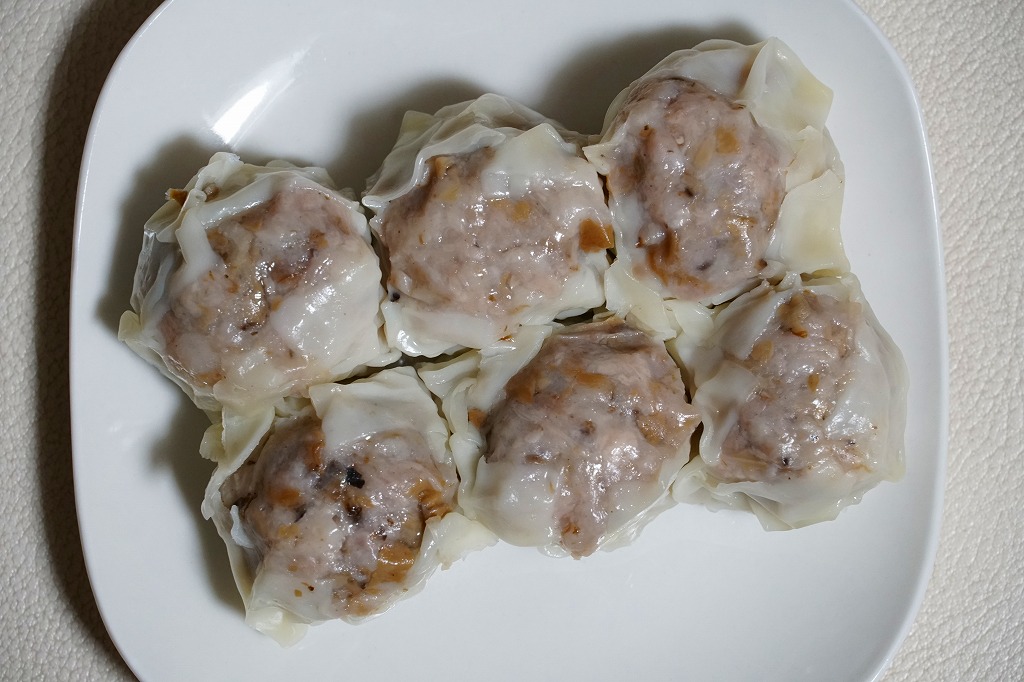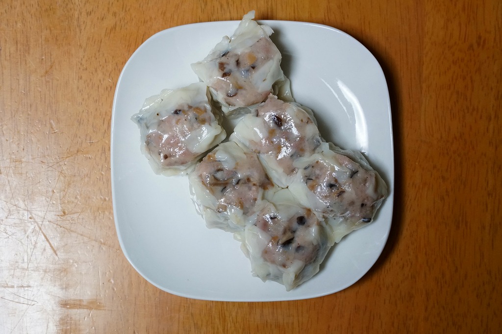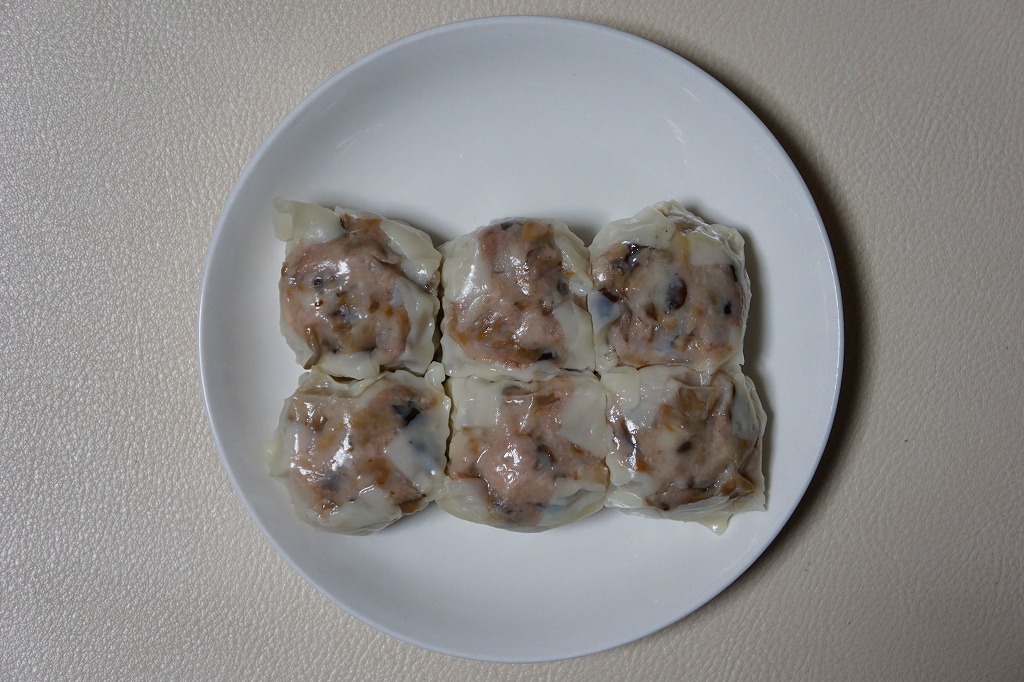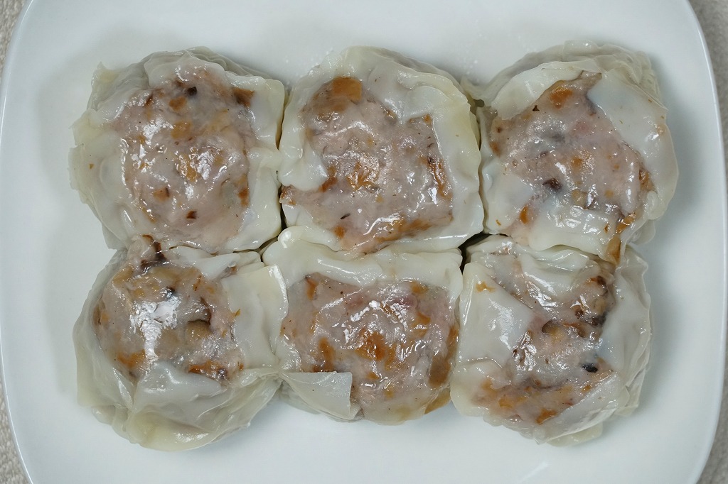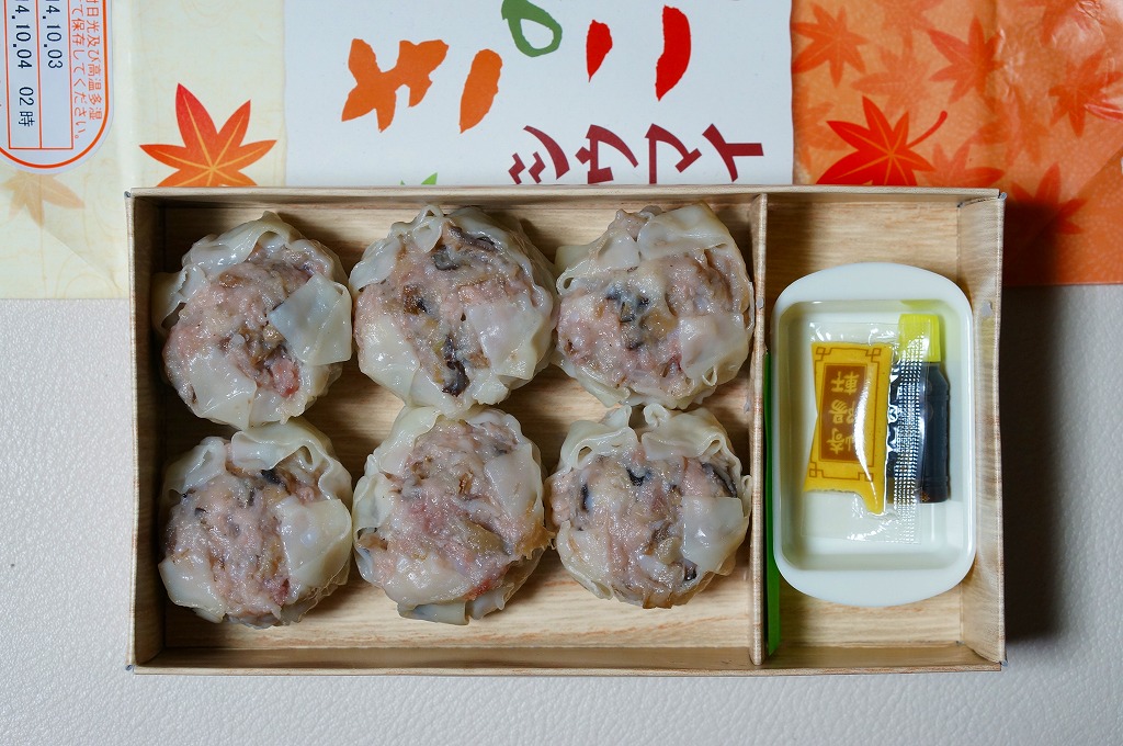 シイタケ、エリンギ、ぶなしめじ、ヒラタケと豚肉を混ぜ合わせた、中華の点心としては通常サイズ、崎陽軒の横浜駅弁としては大きいサイズのシウマイを、木目柄の紙箱に6個収め、醤油と辛子を添える。