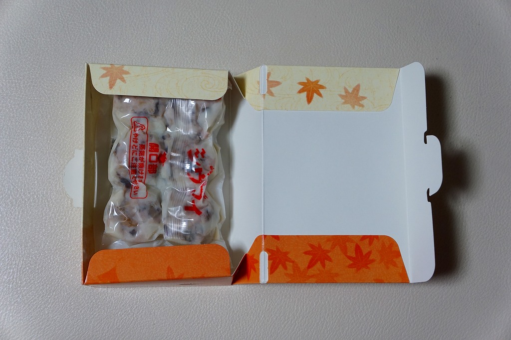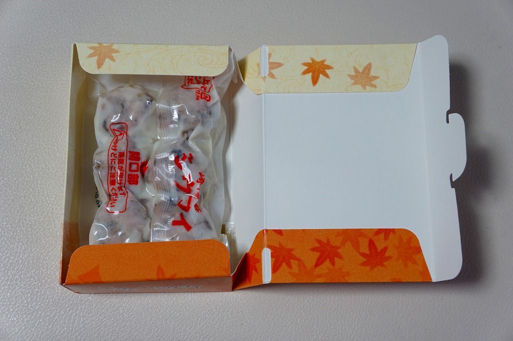 2018(平成30)年9月1日から11月30日までの販売の、秋の特製シウマイ。今回も引き続き、常温タイプと「おいしさ長もちシリーズ」の販売で、こちらは前者の常温タイプ。包装紙も紙箱も中身も味も、6年連続で据え置かれたと思ったら、今回はシウマイに混ぜたきのこが「椎茸、エリンギ、ぶなしめじ、ひらたけ」であり、舞茸が消えてひらたけが加わった。見ても食べても気が付かない差異。価格は20円のアップ。