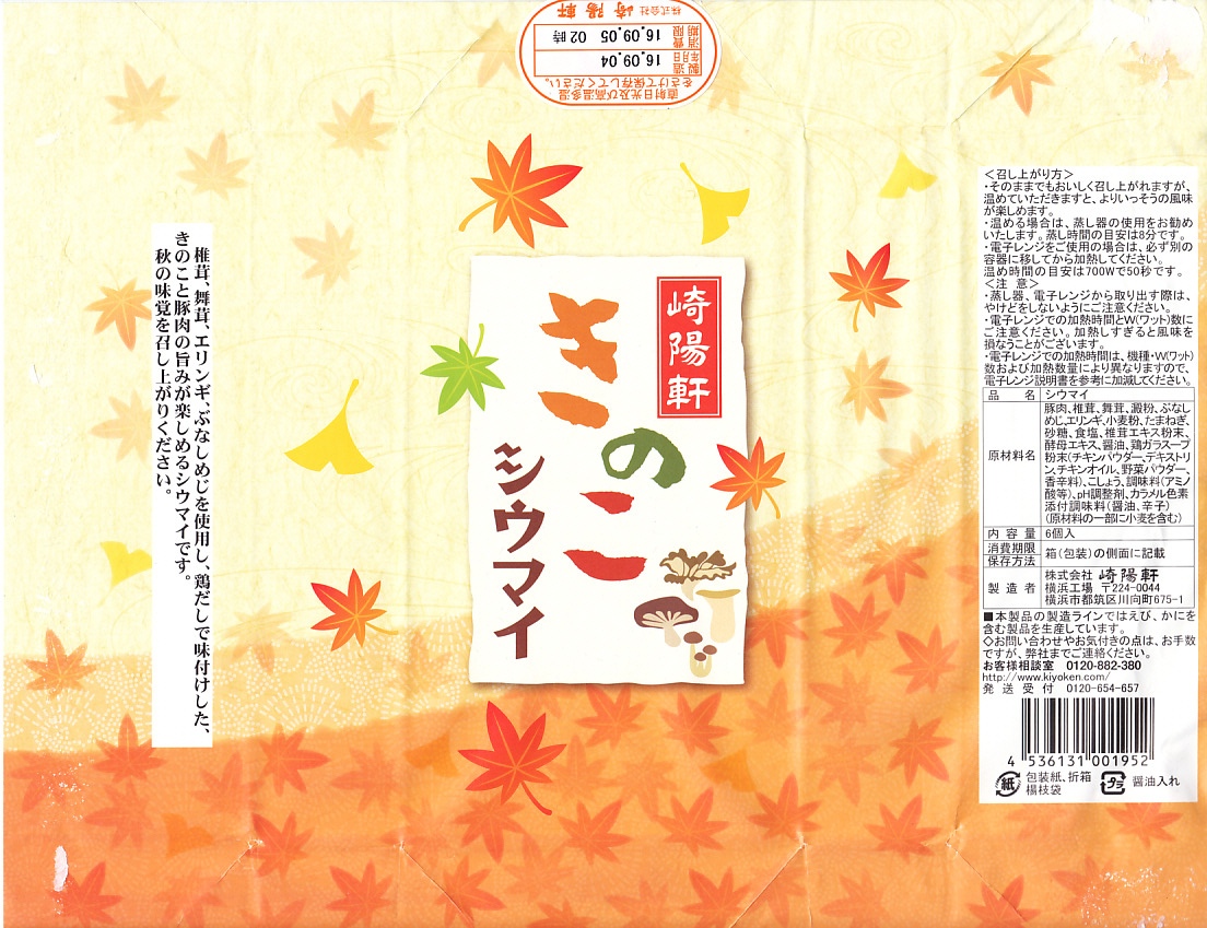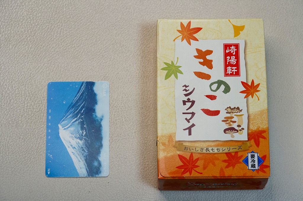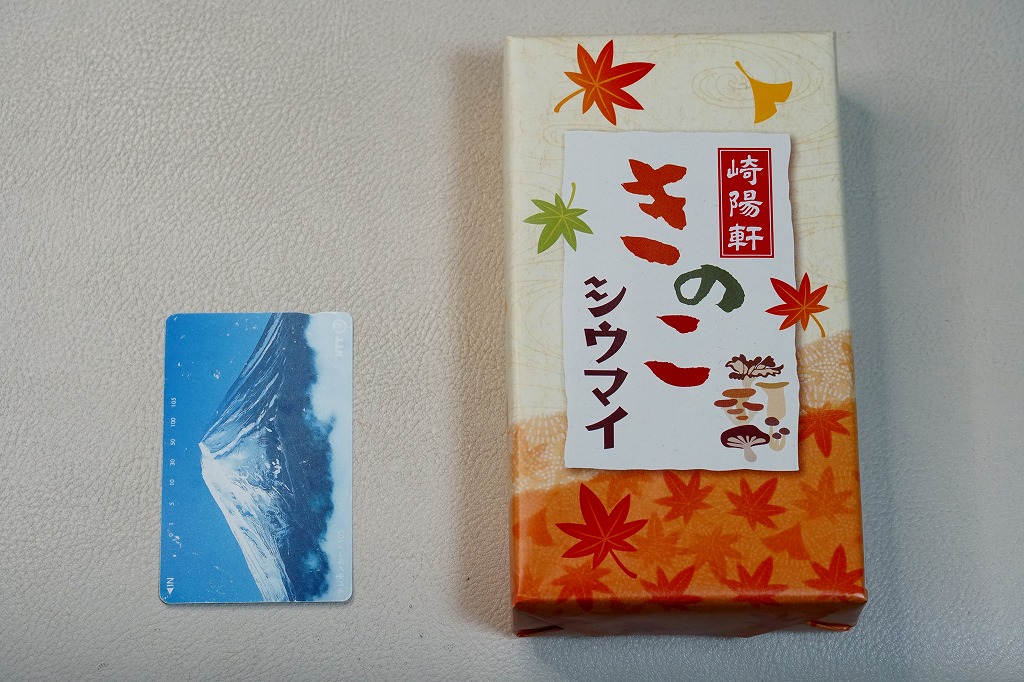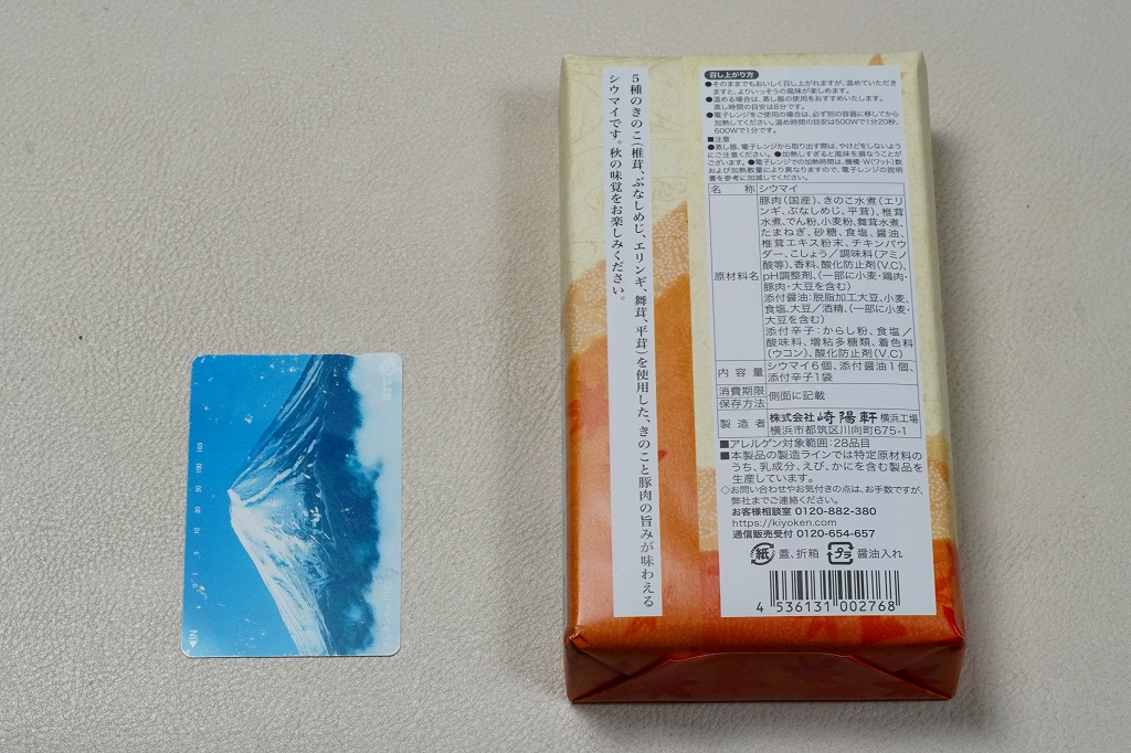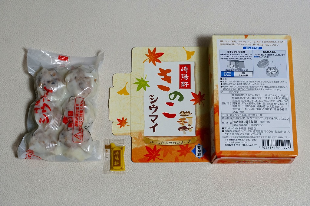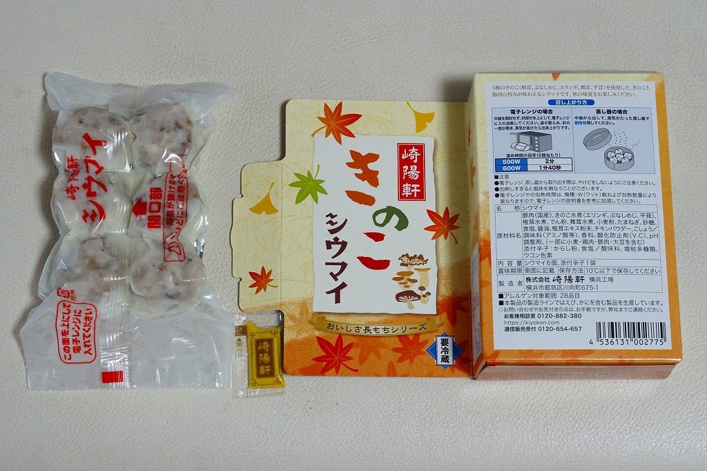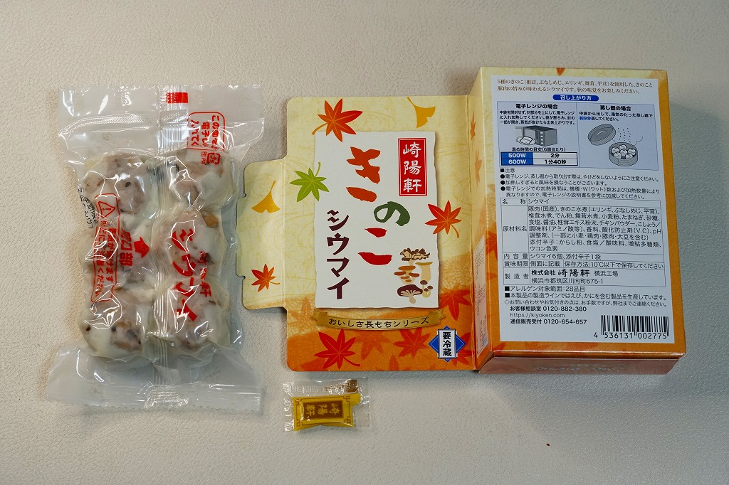 2003(平成15)年に発売された、季節の特製シウマイの秋版。今回も「きのこシウマイ」の、この常温タイプと「おいしさ長もちシリーズ」の両方を、2025(令和7)年9月1日から11月30日まで併売。折箱も包装紙も中身も風味も前年と同じで、実質的に13年連続で据え置かれた。しいたけ、ぶなしめじ、エリンギ、舞茸、ヒラタケと豚肉を混ぜ合わせた、中華の点心としては通常サイズ、崎陽軒の横浜駅弁としては大きいサイズのシウマイを、木目柄の紙箱に6個収め、醤油と辛子を添える。味も13年連続で据え置きか。価格も据え置かれた。