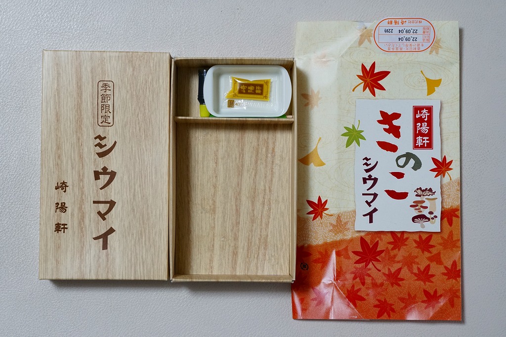 2003(平成15)年に発売された、季節の特製シウマイの秋版。今回も「きのこシウマイ」の、この常温タイプと「おいしさ長もちシリーズ」の両方を、2022(令和4)年9月1日から11月30日まで併売。折箱も包装紙も中身も風味も前年と同じで、実質的に10年連続で据え置かれた。