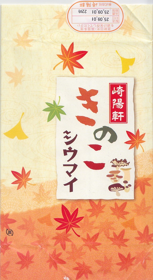 2014(平成26)年9月1日から11月30日までの販売の、秋の特製シウマイ。今回も引き続き、常温タイプと「おいしさ長もちシリーズ」の販売で、こちらは前者の常温タイプ。包装紙も紙箱も中身も味も据え置かれた。一般に焼売は、冷めたり冷たいよりは暖かいほうが好まれると思うが、このきのこシウマイに限っては、常温版を冷たくしてシャキシャキにしたほうがうまいと考えている。