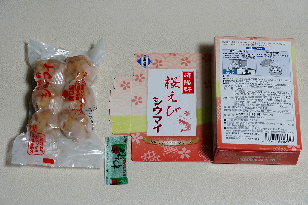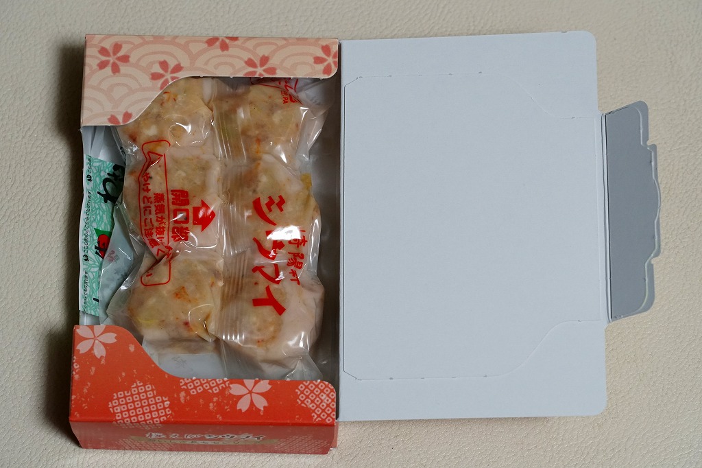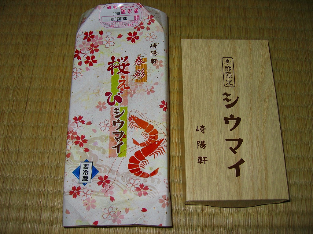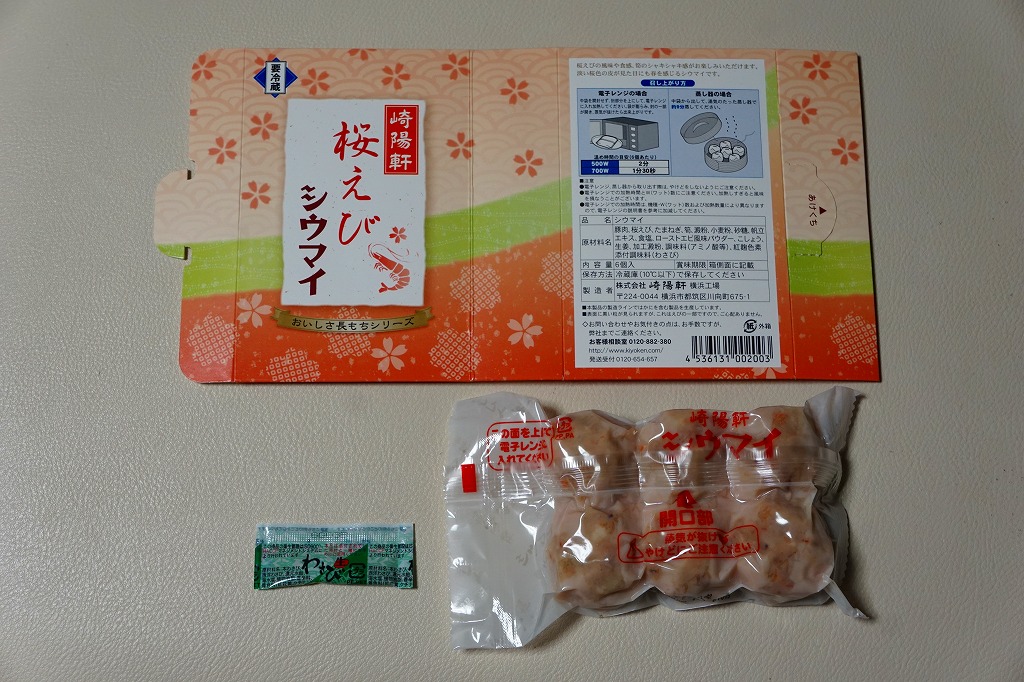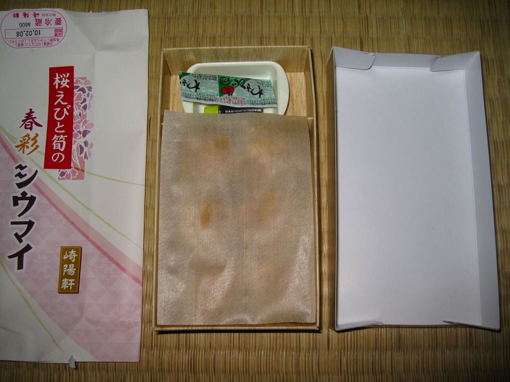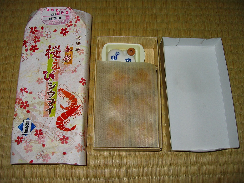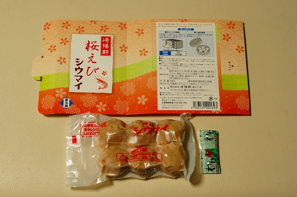 シウマイにはサクラエビに加えてキャベツとタケノコが混入されており、紅色と若草色が淡く出た春らしい見栄えで、包装紙も花いっぱい。しかし食べると桜海老と豚肉が風味でケンカしているような気がした。