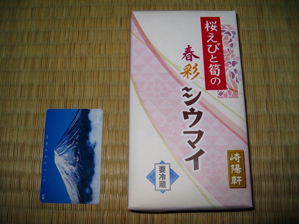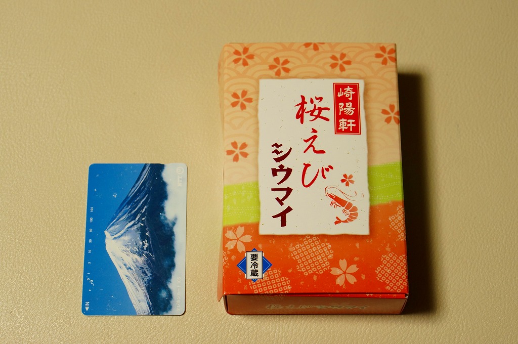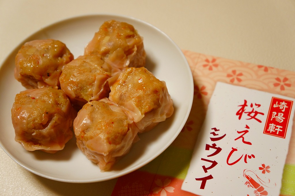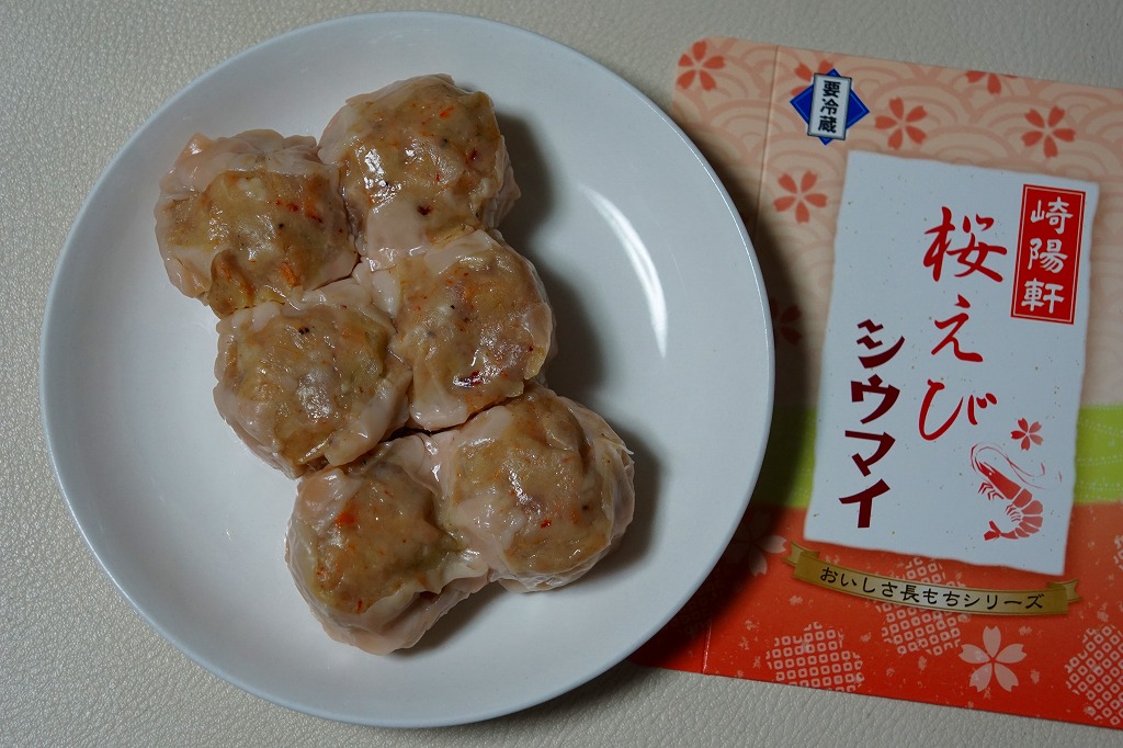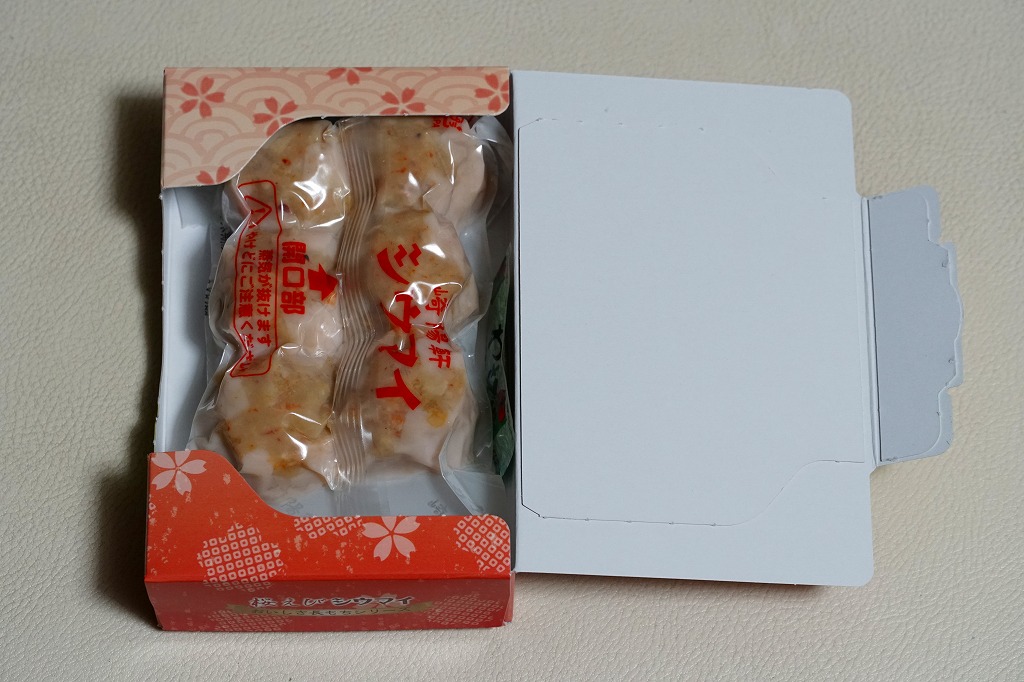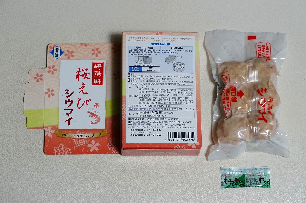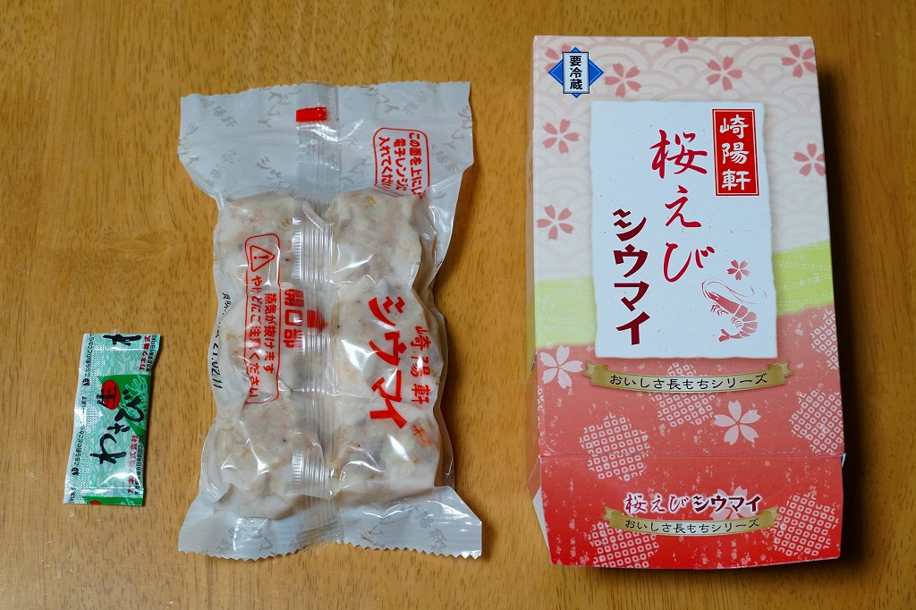 シウマイにはサクラエビに加えてキャベツとタケノコが混入されており、紅色と若草色が淡く出た春らしい見栄えで、包装紙も花いっぱい。しかし食べると桜海老と豚肉が風味でケンカしているような気がした。