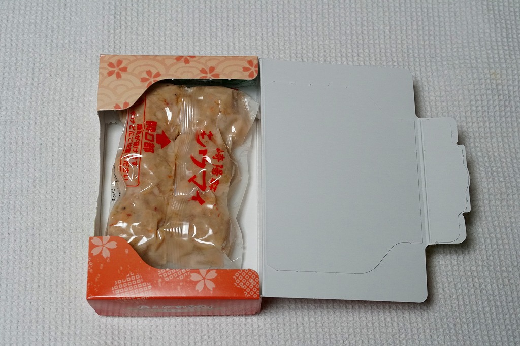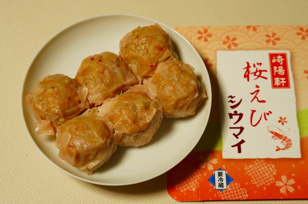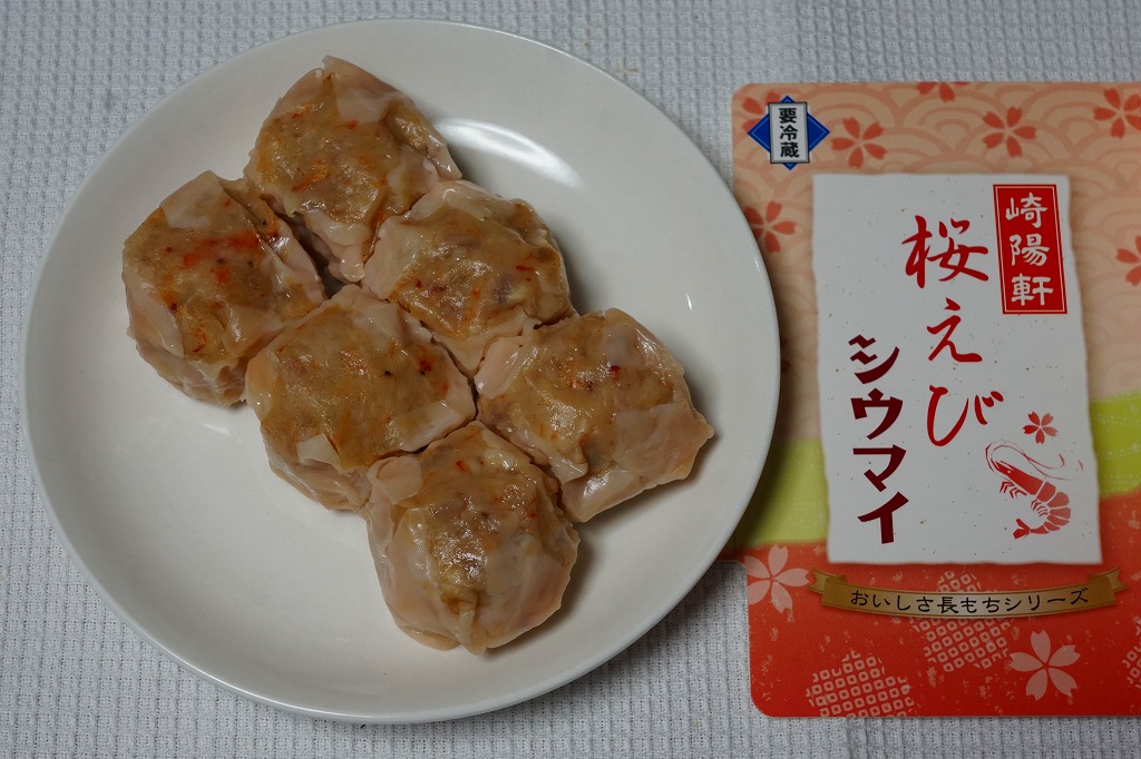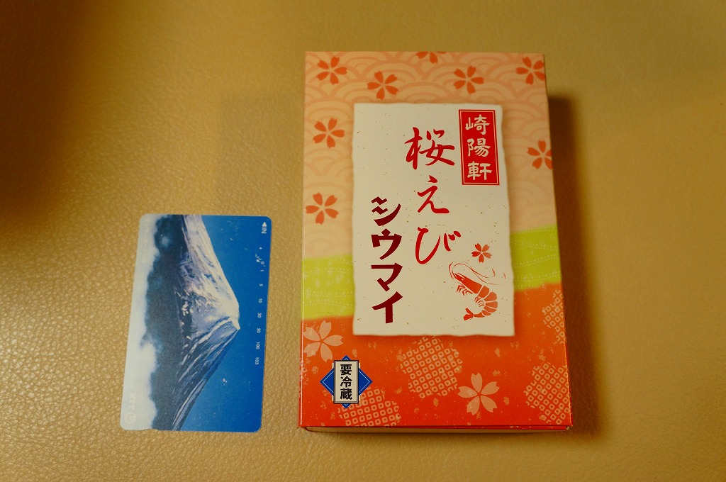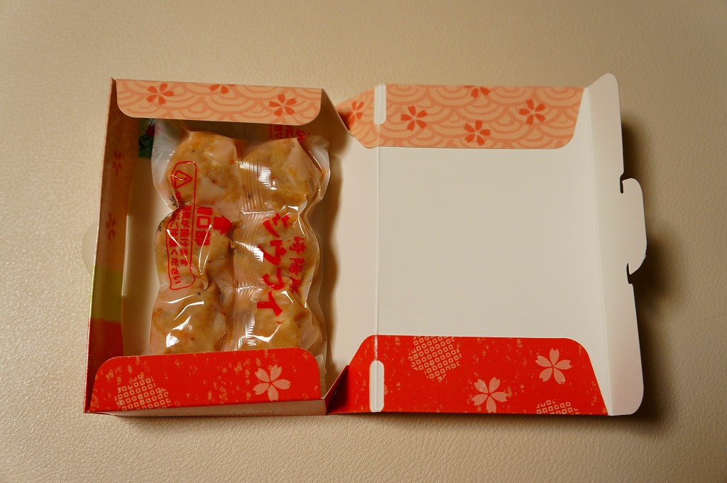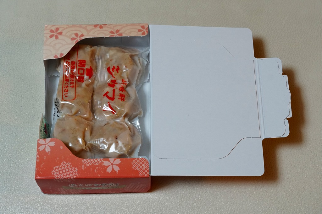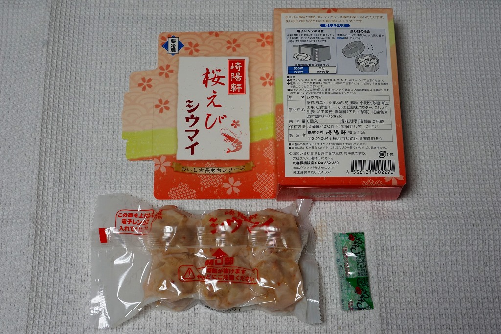 シウマイにはサクラエビに加えてキャベツとタケノコが混入されており、紅色と若草色が淡く出た春らしい見栄えで、包装紙も花いっぱい。しかし食べると桜海老と豚肉が風味でケンカしているような気がした。