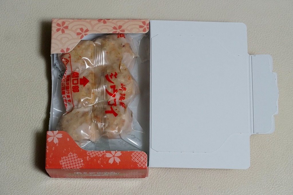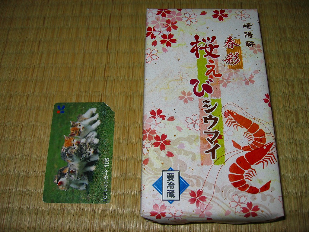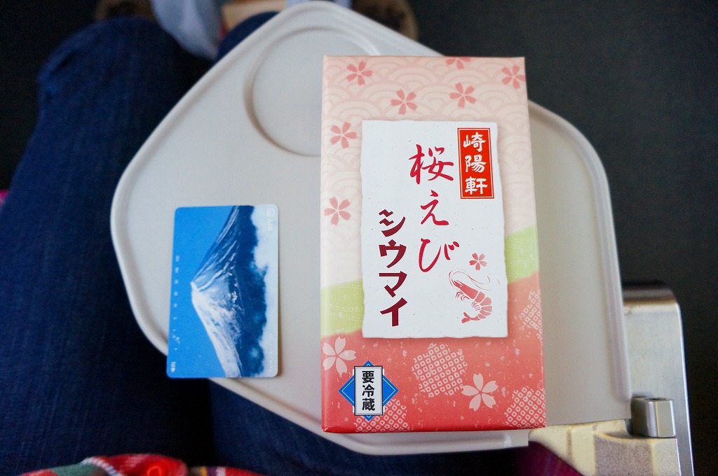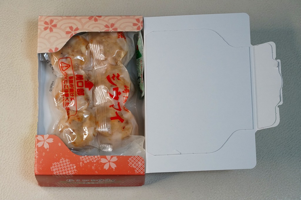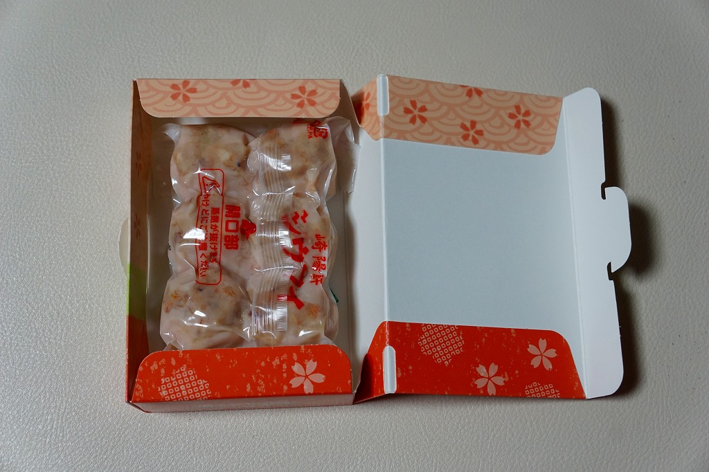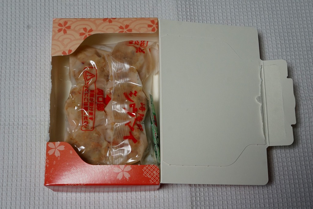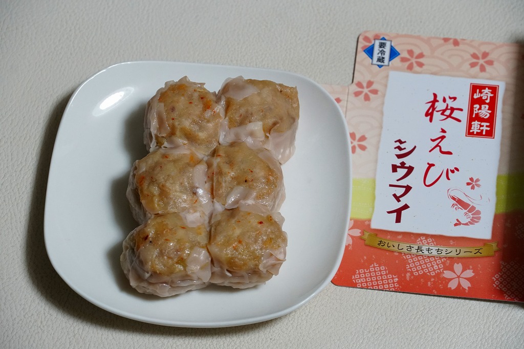 シウマイにはサクラエビに加えてキャベツとタケノコが混入されており、紅色と若草色が淡く出た春らしい見栄えで、包装紙も花いっぱい。しかし食べると桜海老と豚肉が風味でケンカしているような気がした。