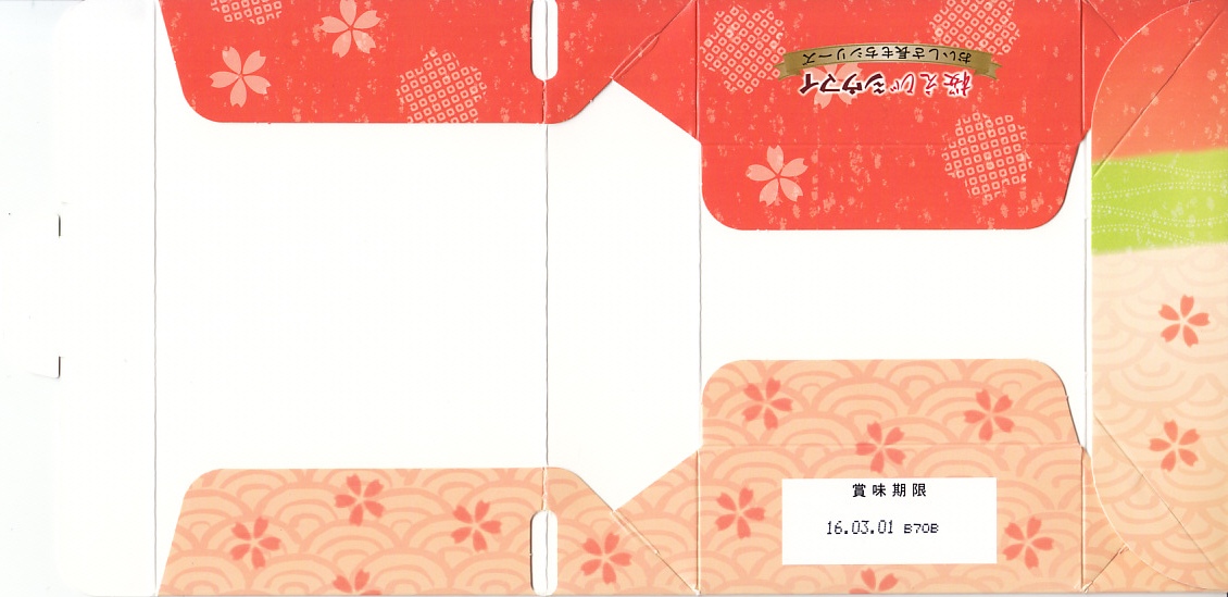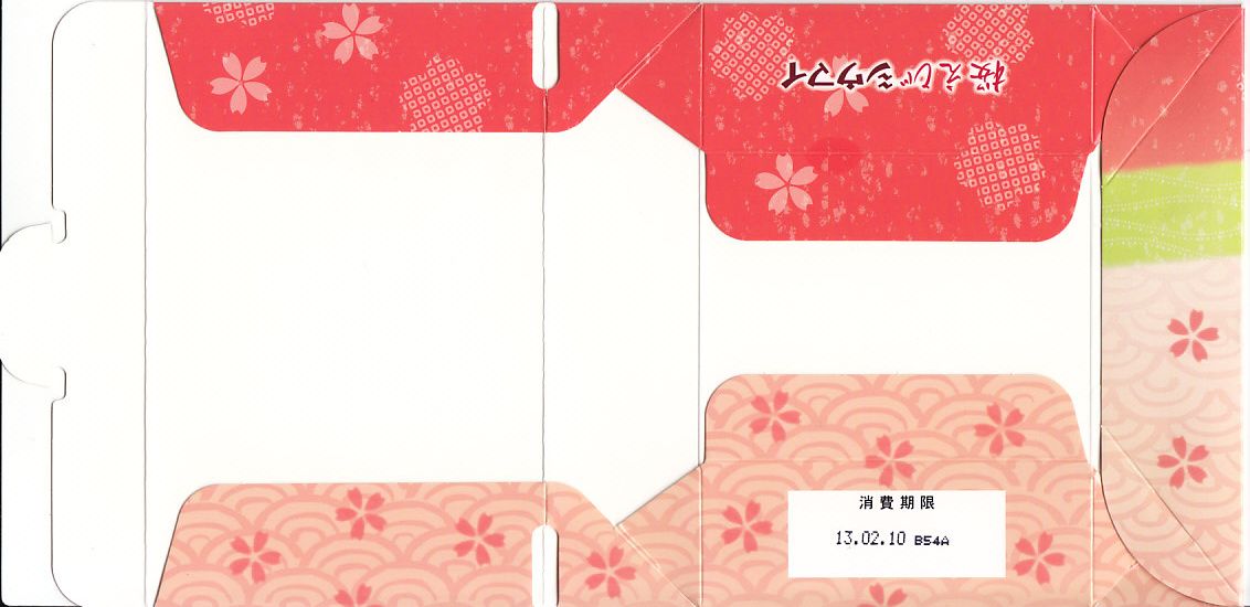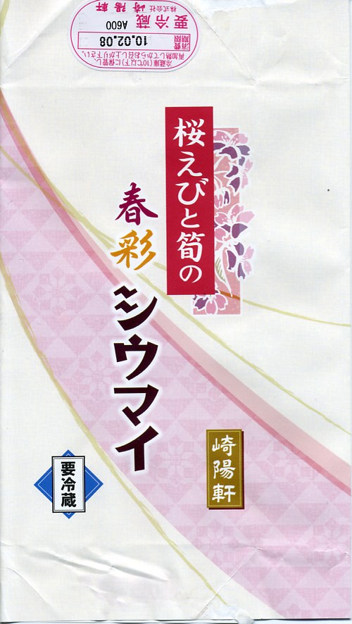 2012(平成24)年2月1日から5月末日まで販売された、季節限定の特製シウマイ。特製シウマイ6個を竹皮柄の紙箱に収めて包装紙で包む姿は、季節限定の特製シウマイの共通事項。今回はサクラエビの釜揚げとタケノコの角切りを混入し、崎陽軒として初めてシウマイの皮に色を付けたという。淡い黄色や赤色が随所に表現される点も春らしいもの。なお、買いそびれた2011年版も2〜5月発売の「桜えびシウマイ」で、皮の色以外は2012年版と同じだった模様。