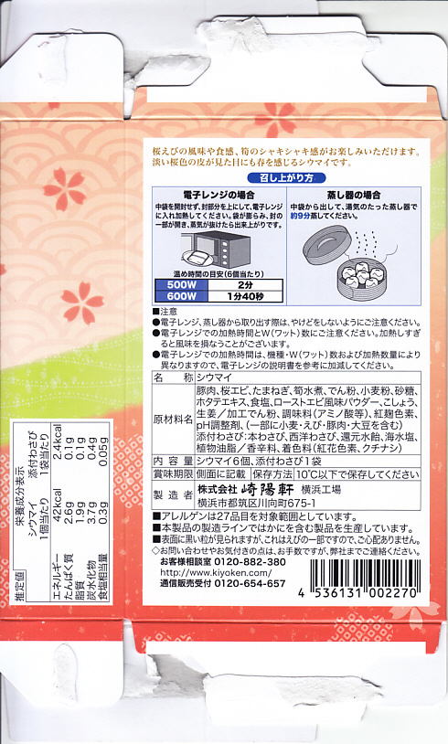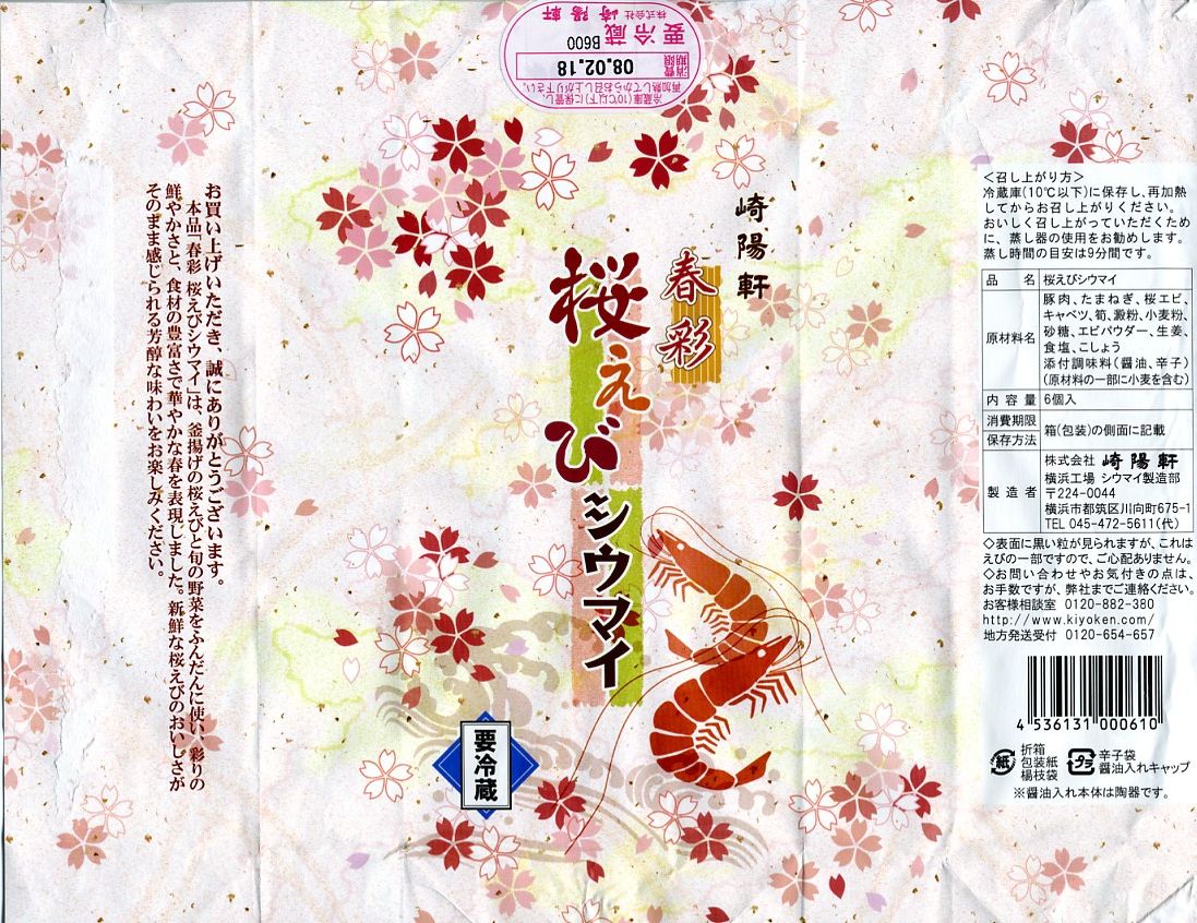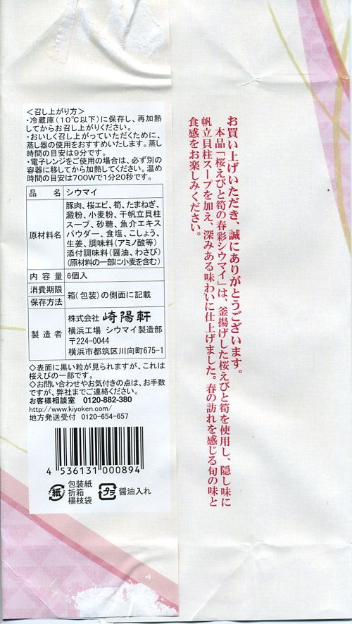 2019(平成31)年2月1日から4月中旬まで販売された、季節限定の特製シウマイ。7年連続して、サクラエビやタケノコを混ぜた特製シウマイを6個、「おいしさ長もちシリーズ」のパッケージに詰め、冷蔵販売した。食品表示はまたもや強化され、紙箱の構造は変わらず、価格は20円のアップ
