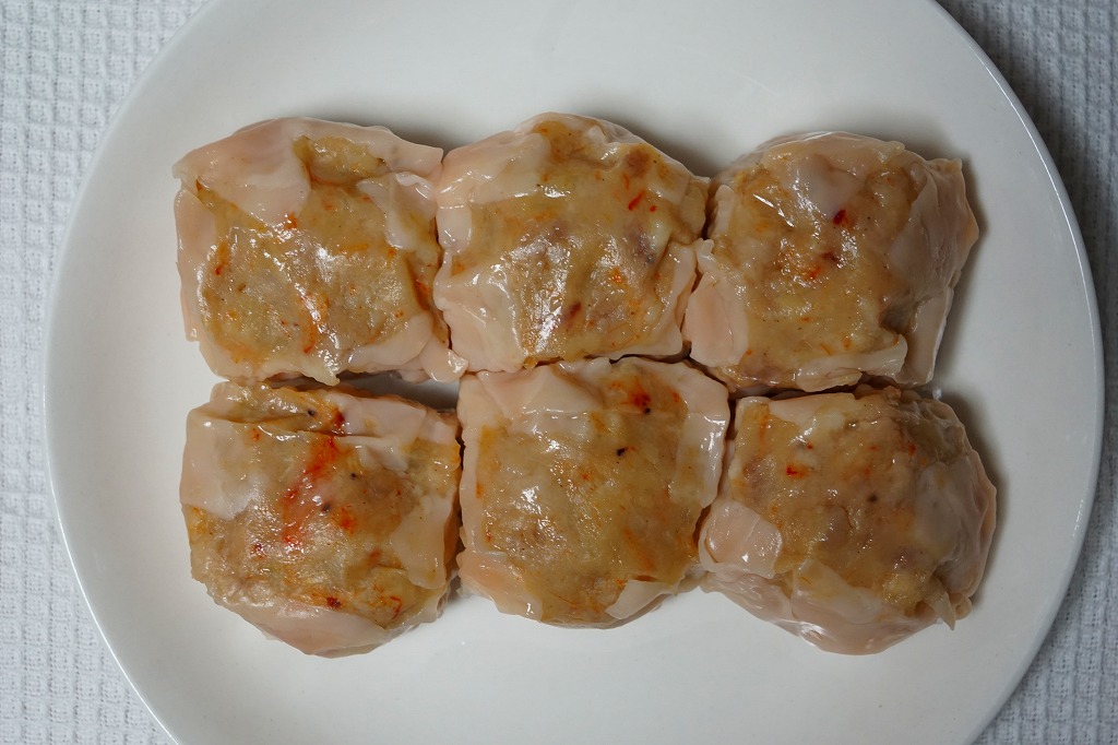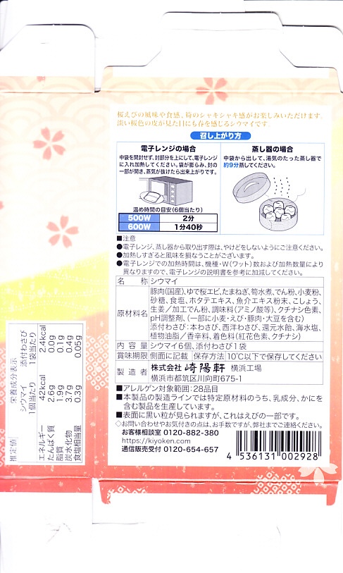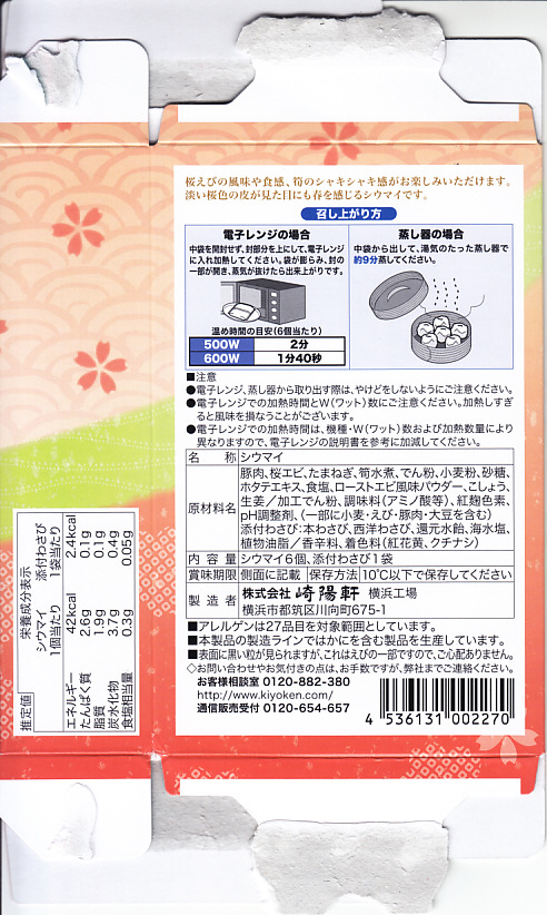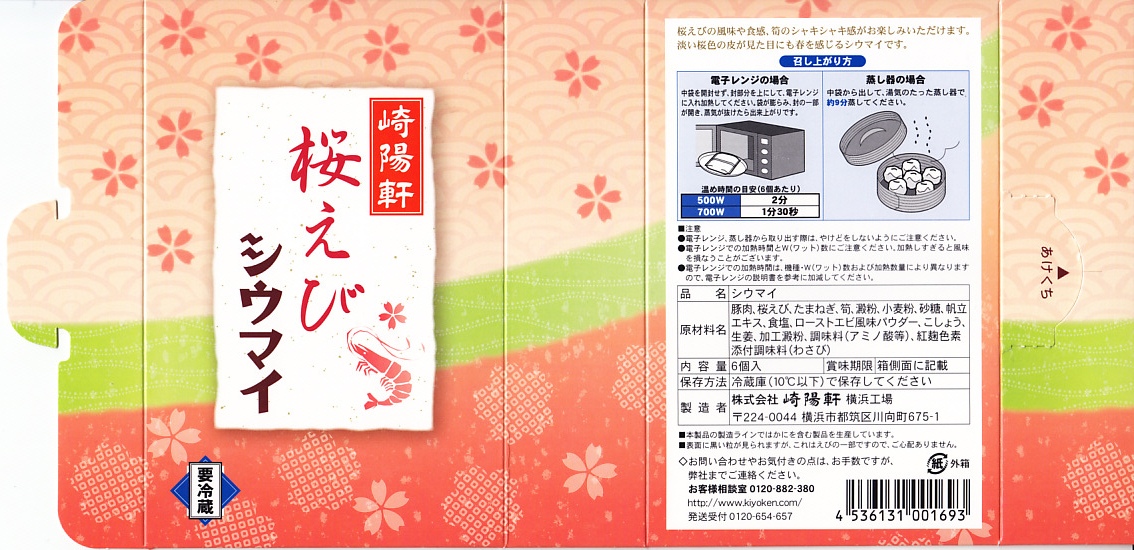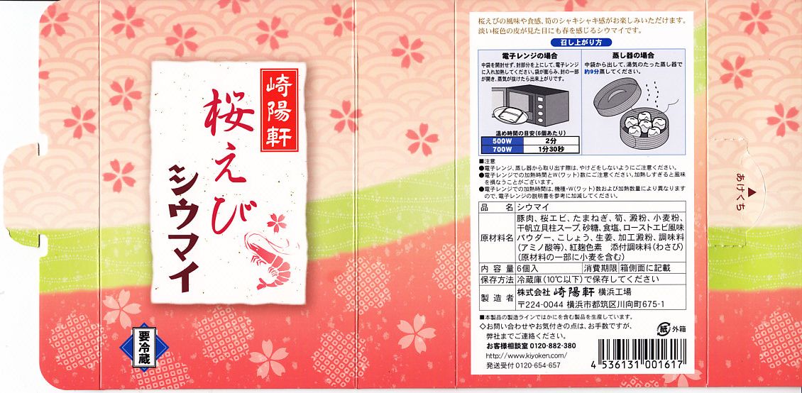 2016(平成28)年2月1日から4月中旬まで販売された、季節限定の特製シウマイ。4年連続して、サクラエビやタケノコを混ぜた特製シウマイを6個、「おいしさ長もちシリーズ」のパッケージに詰め、冷蔵販売した。発売のプレスリリースには、今回から「おいしさ長もちシリーズ」とあり、以前のパッケージを確認したら、確かに今回からその表示が加わった。過去3年間は単なる真空パックだった模様。両者の違いは、よくわからない。