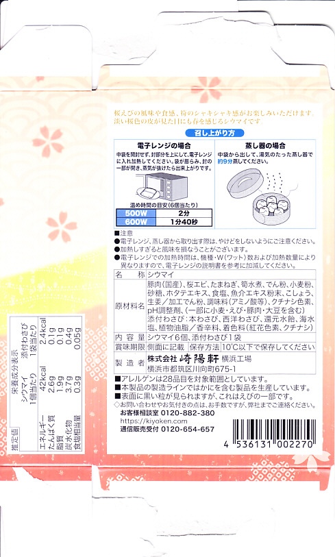 2022(令和4)年2月1日から4月15日まで販売された、季節限定の特製シウマイ。10年連続して、サクラエビやタケノコを混ぜた特製シウマイを6個、「おいしさ長もちシリーズ」のパッケージに詰め、冷蔵販売した。