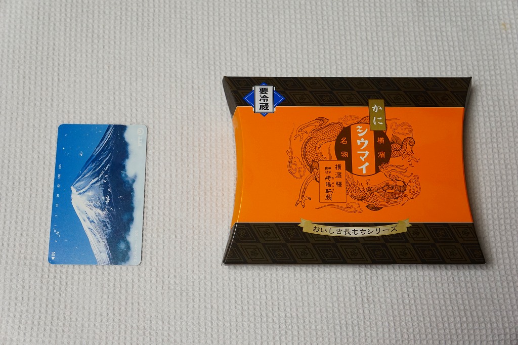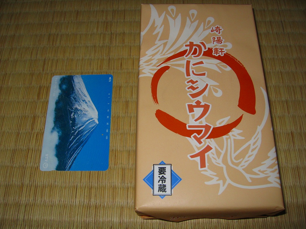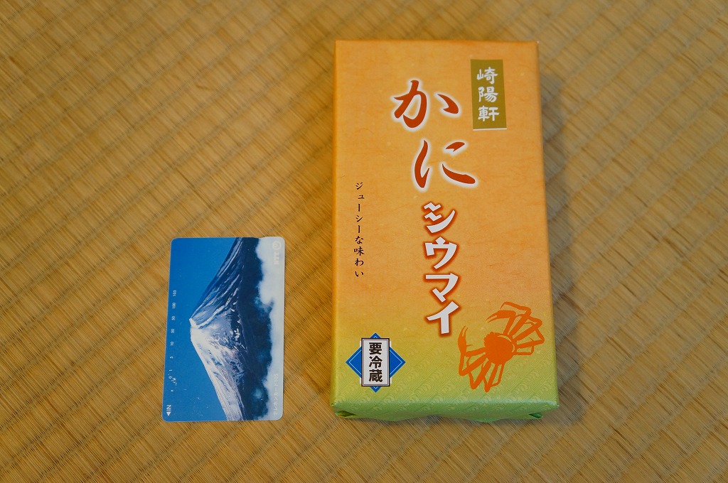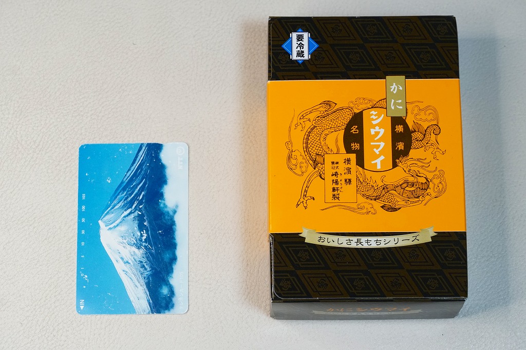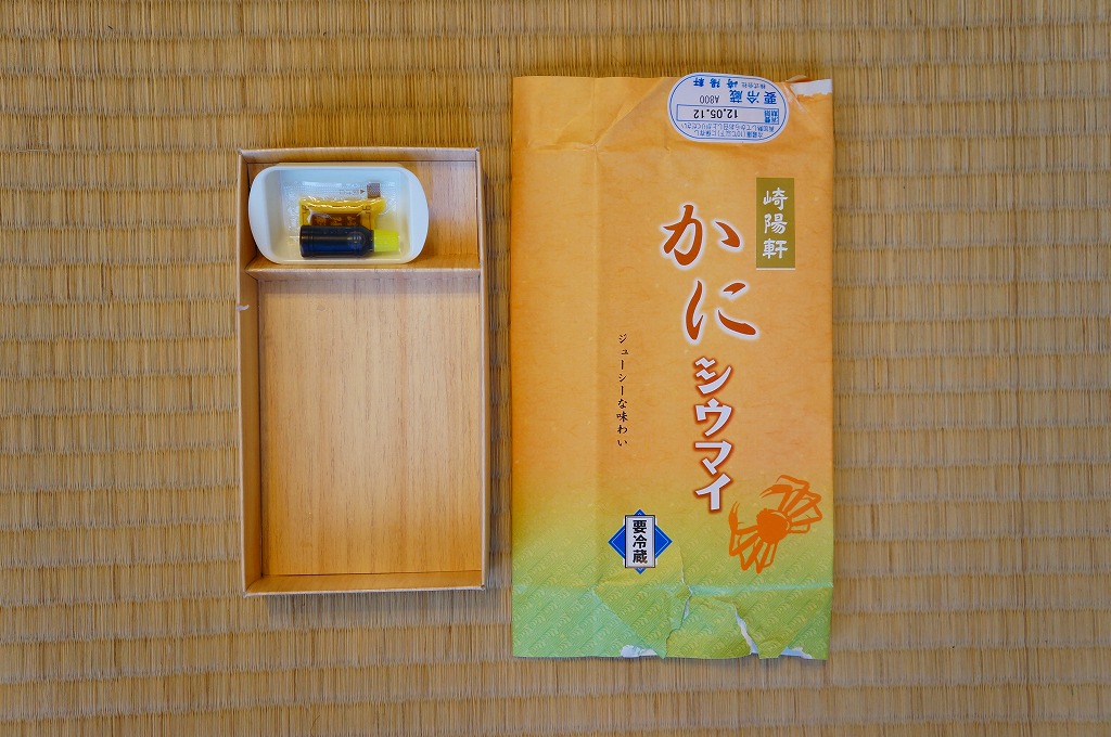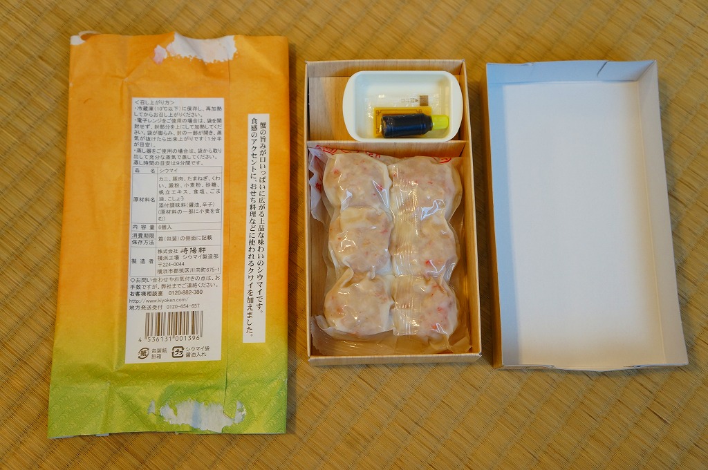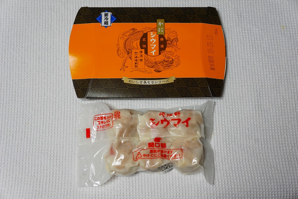 横浜駅弁のかにシウマイの、見慣れない姿。単品販売でなく、崎陽軒のギフトセットに含まれるもの。中身は上の通常版と同じだが、ボール紙のパッケージが簡易的でコンパクト。