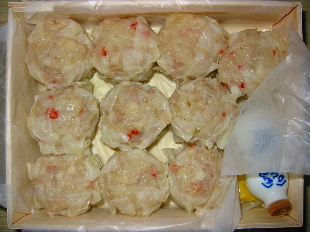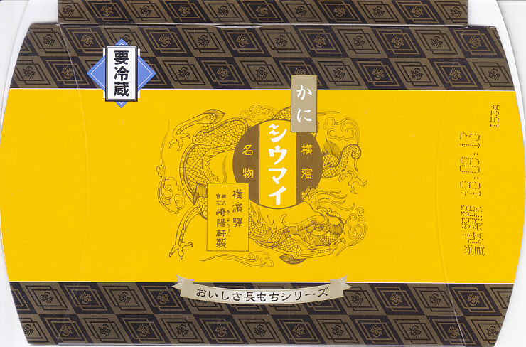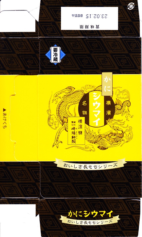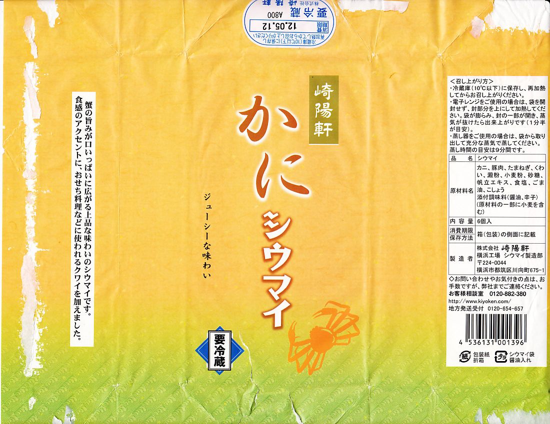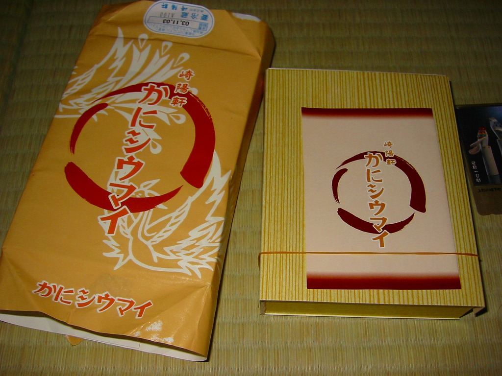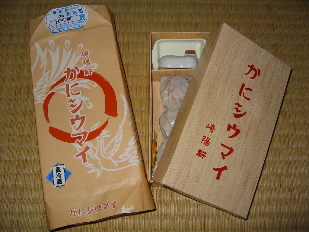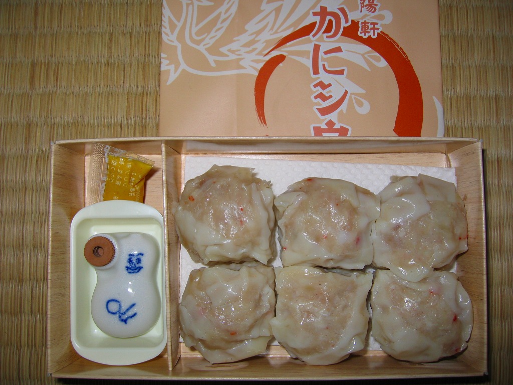 下記の商品「かにシウマイ」の、2004年3月19日からのパッケージ。10個入りを6個入りに少量化し、消費期限を3日間から5日間に延長し、磁器の醤油入れ「ひょうちゃん」の形状が変わり、シウマイの風味は以前と変わらない。価格は2006年の購入時で680円、2006年9月1日に730円へ値上げ、2008年10月に仕様を見直し700円へ値下げ、2010年9月に680円へ戻った。