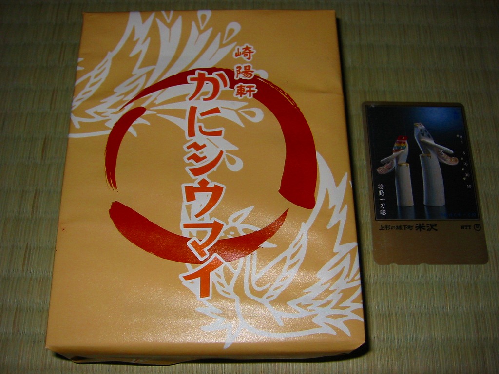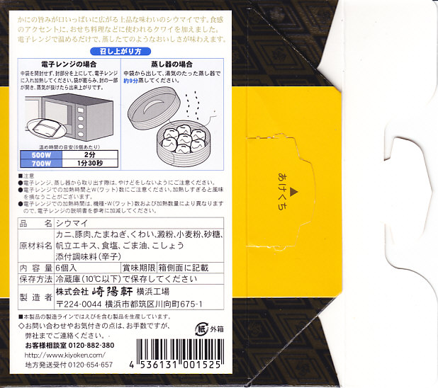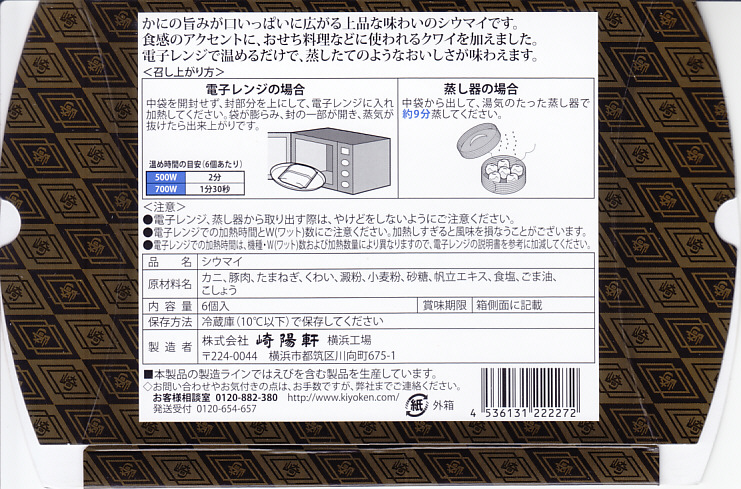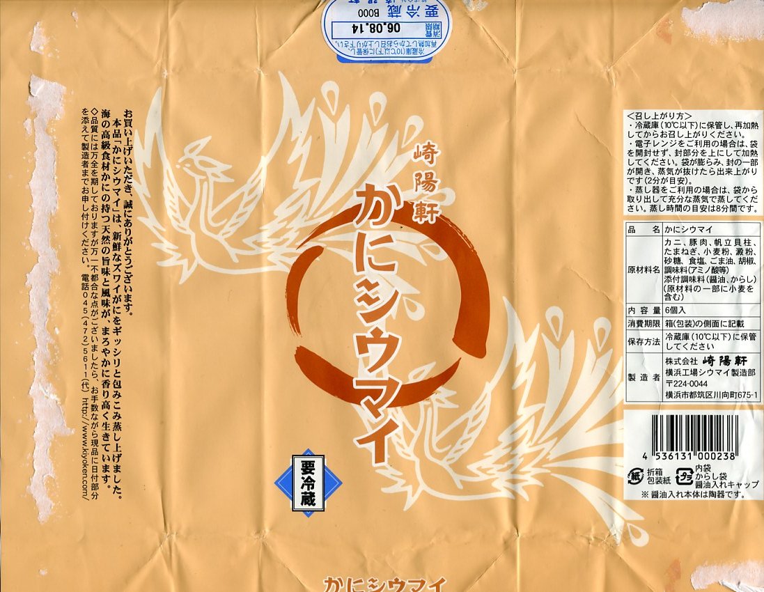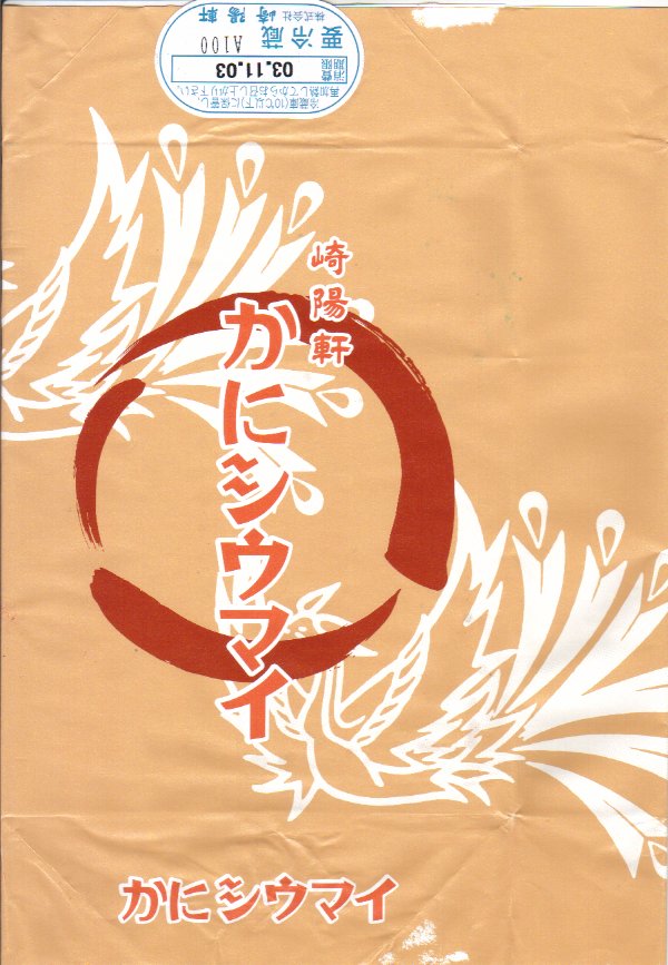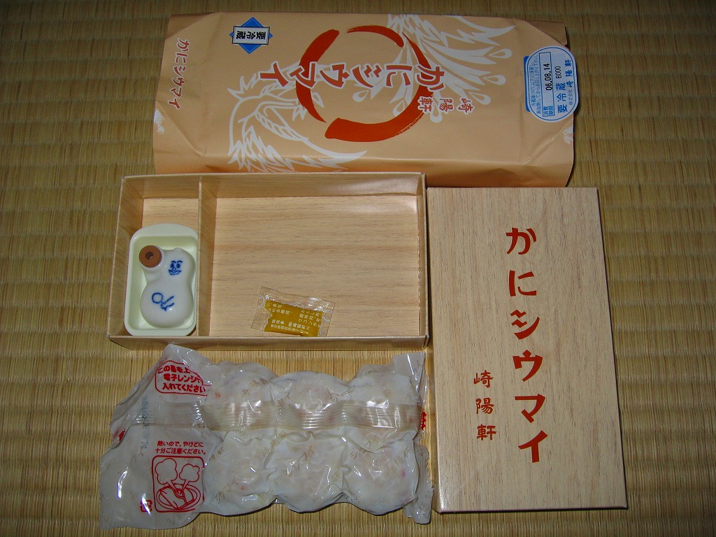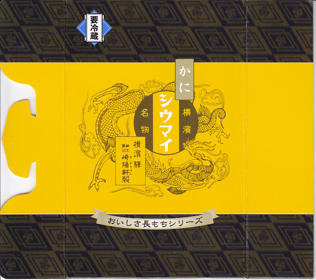 下記の商品「かにシウマイ」の、2004年3月19日からのパッケージ。10個入りを6個入りに少量化し、消費期限を3日間から5日間に延長し、磁器の醤油入れ「ひょうちゃん」の形状が変わり、シウマイの風味は以前と変わらない。価格は2006年の購入時で680円、2006年9月1日に730円へ値上げ、2008年10月に仕様を見直し700円へ値下げ、2010年9月に680円へ戻った。
