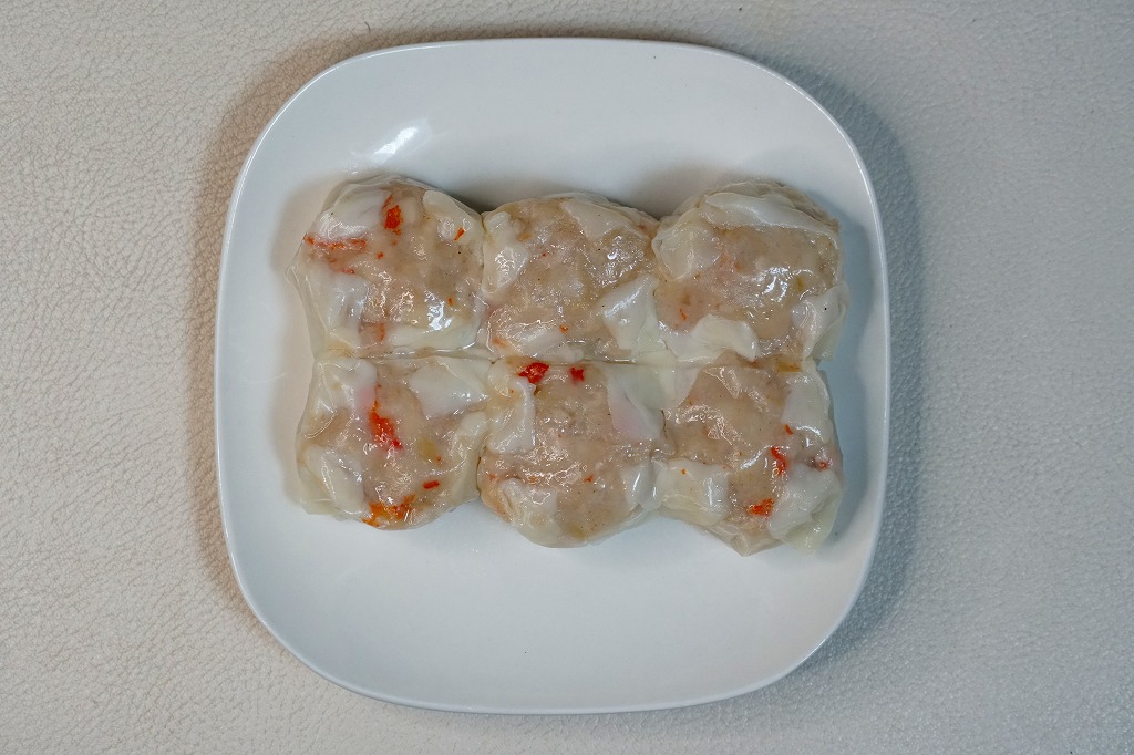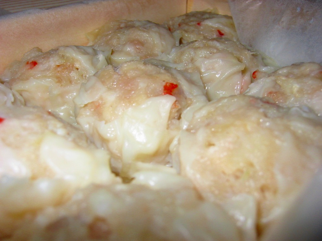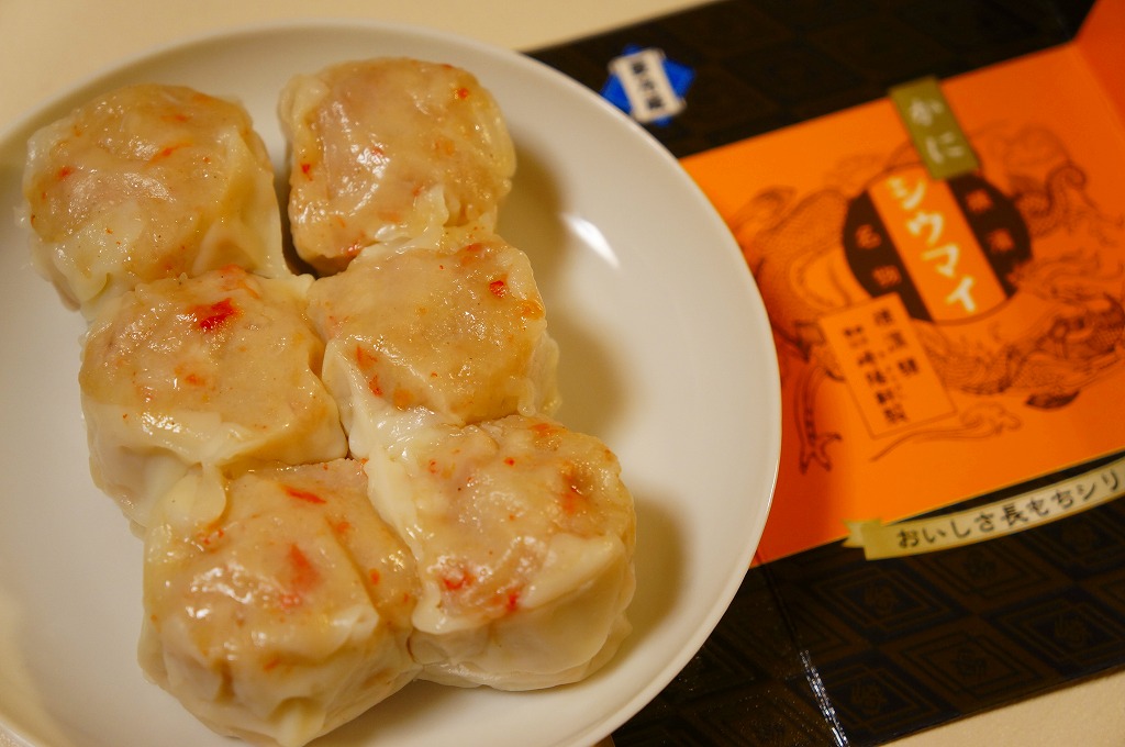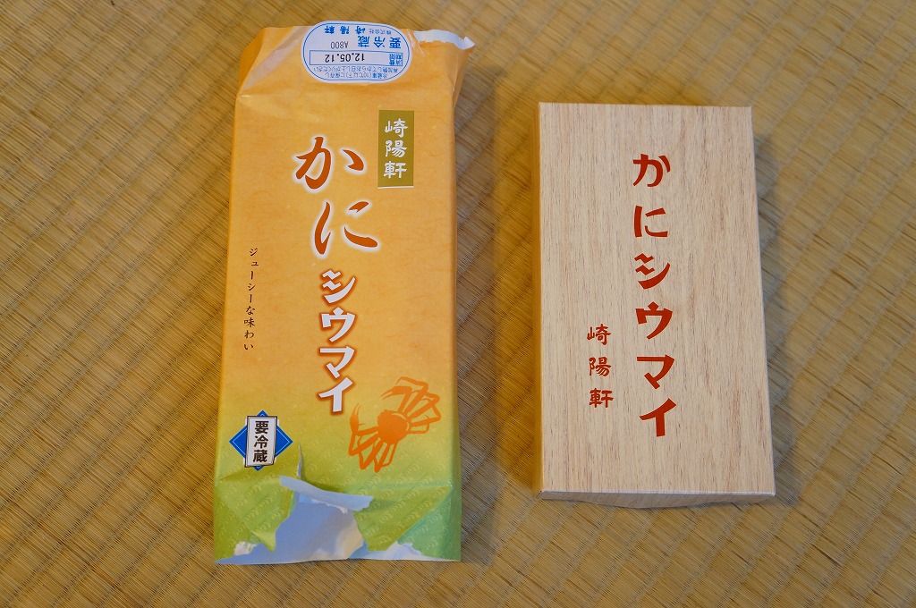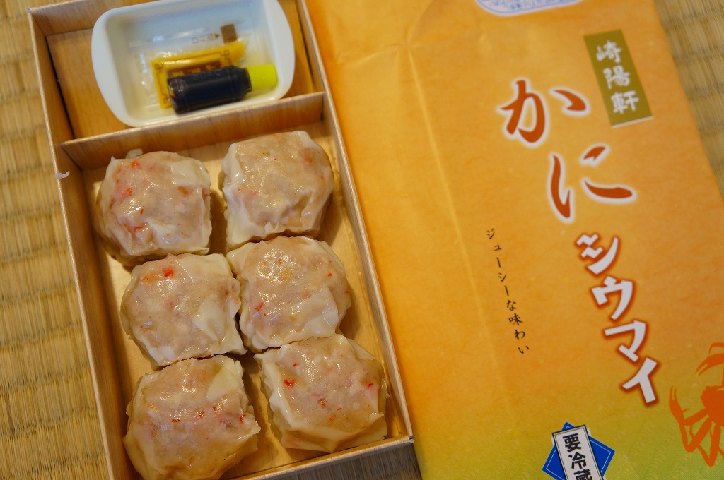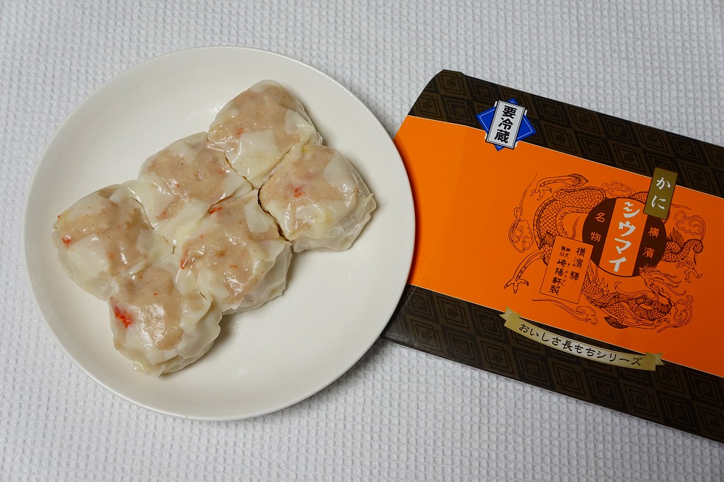1999(平成11)年10月7日に「えびシウマイ」とともに発売された、横浜名物シウマイの特製版のかにバージョン。経木枠の容器に、ズワイガニのほぐし身を織り込んだシウマイが10個入る。一口目では「特製シウマイ」と同じ味がしたが、噛み締める毎にカニのエキスが口の中に広がるので、柔らかいがしっかり噛んで味わいたい。写真の現地売り版も通販対応のレトルトパックも要冷蔵。2004(平成16)年3月19日から6個入り680円に変更された。
