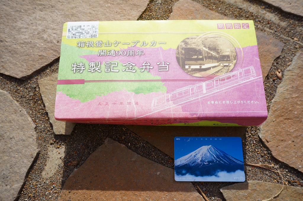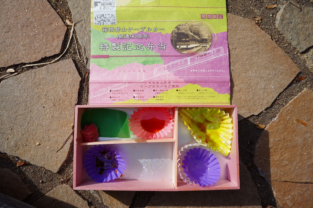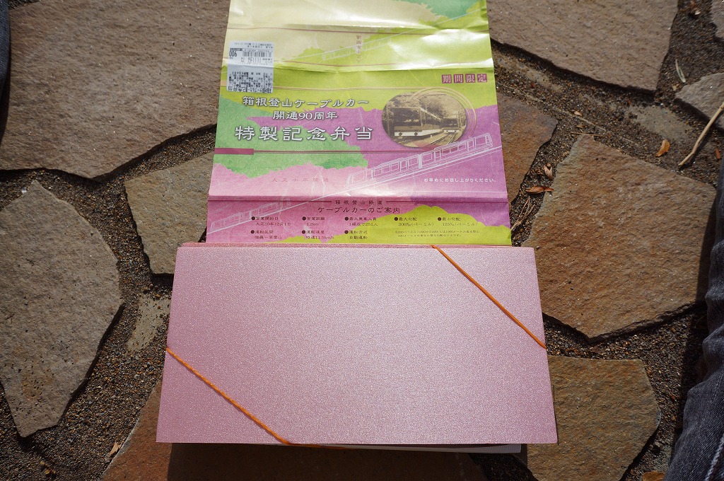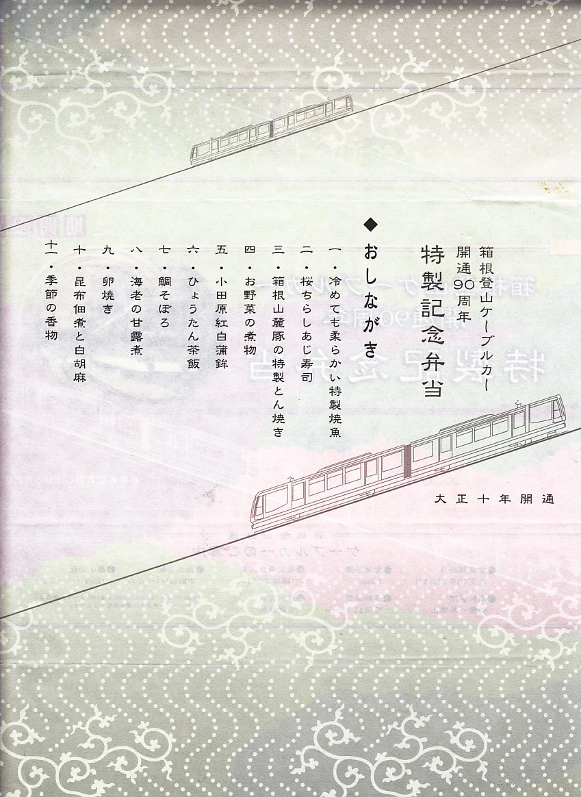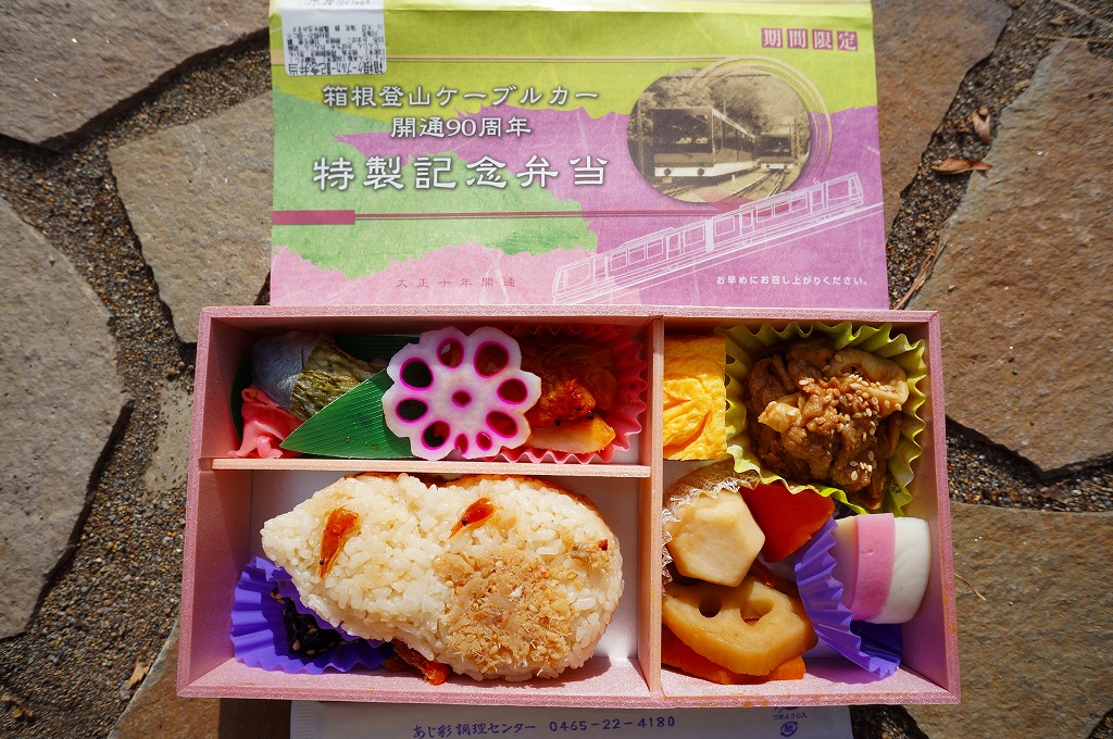 箱根登山ケーブルカーの開通90周年を記念し、時期は分からないが箱根湯本駅で期間限定で販売された記念駅弁で、調製元は小田原駅の改札外に駅弁を出す弁当屋。ピンク色の容器を、ケーブルカーの写真や図面や概要を記した掛紙で包む。中身はひょうたん型の茶飯、アジ寿司、赤魚の煮付け、紅白のかまぼこ、サトイモやニンジンなどの煮物、玉子焼、豚焼肉など。中身とケーブルカーとの関係は不明だが、豊富な分量で腹には満足。