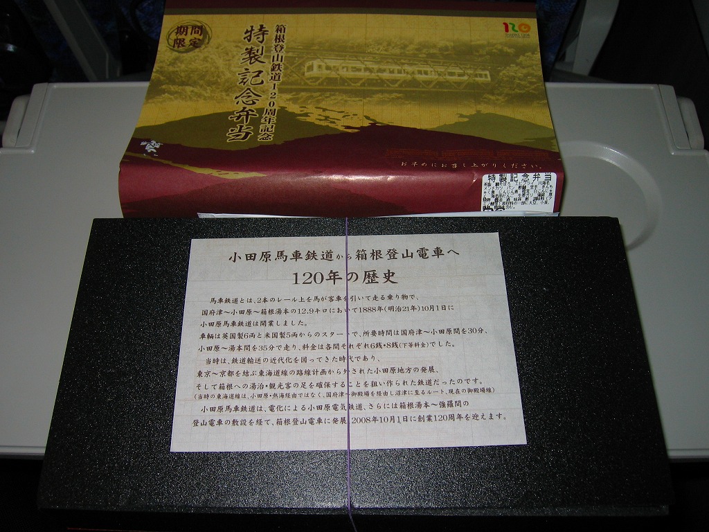 箱根登山鉄道のルーツである小田原馬車鉄道の創業120周年を記念し、2008年8月20日から2009年3月まで小田原駅と箱根湯本駅で販売される記念駅弁。大きめな長方形の真っ黒な容器に、120年の歴史を紹介するしおりを1枚置いて、登録有形文化財である早川橋梁、通称「出山の鉄橋」を渡る電車の写真を用いた掛紙を巻く。