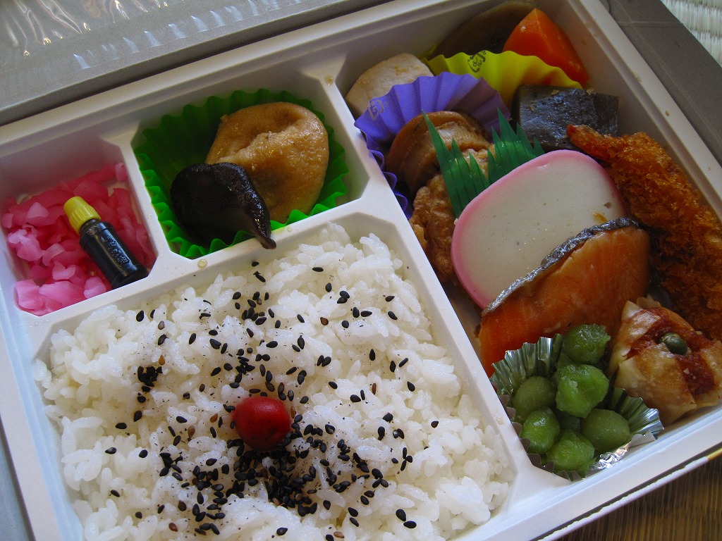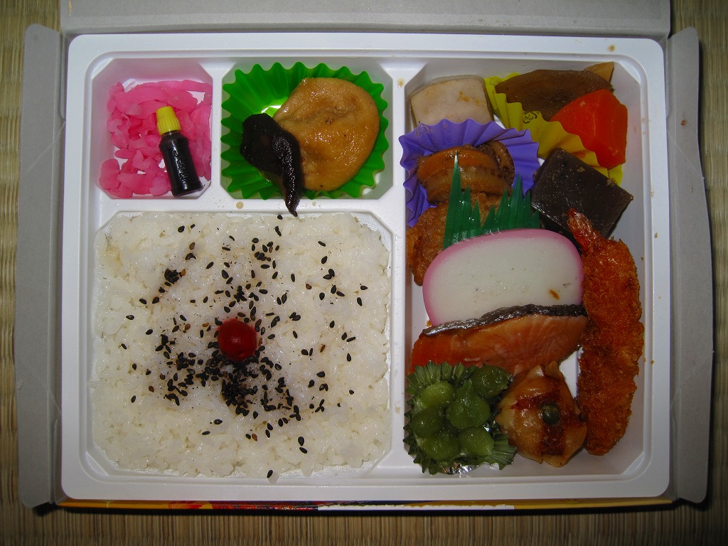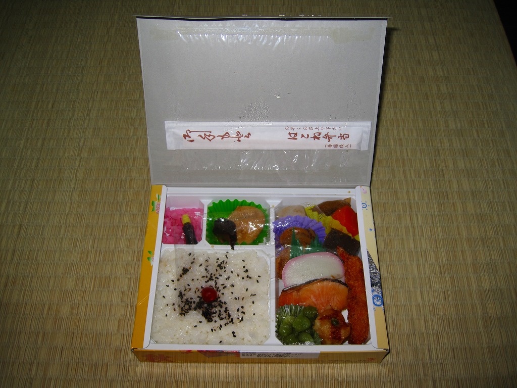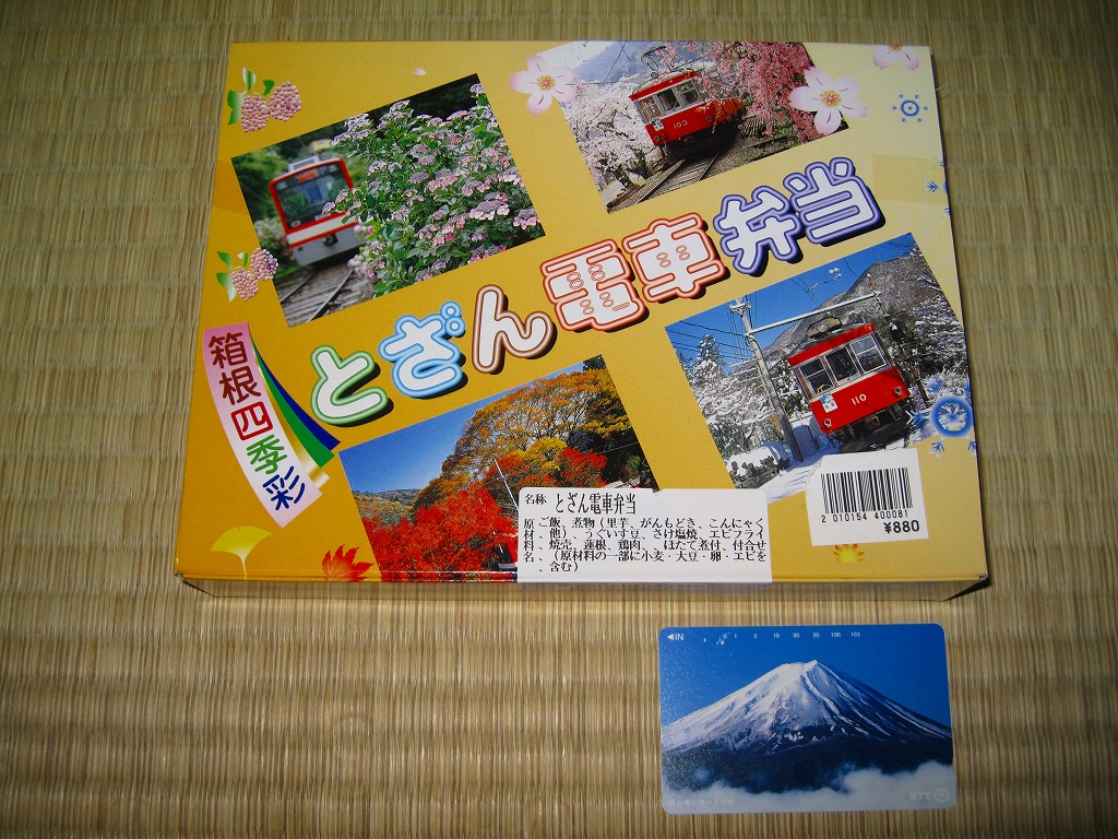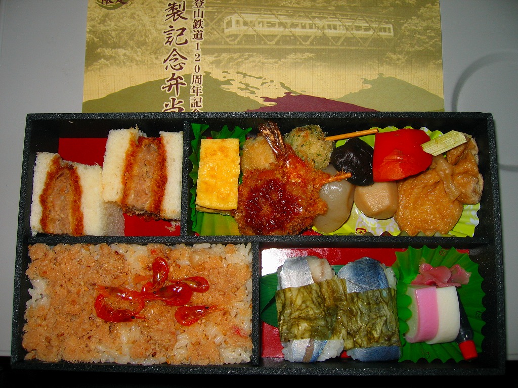 箱根登山鉄道の春夏秋冬の写真を印刷した専用のボール紙箱を使う。白いトレーに収まる中身は、日の丸御飯、焼鮭、エビフライ、揚げ焼売、かまぼこ、鶏唐揚、ホタテやサトイモやニンジンなどの煮物、がんもどき、うぐいす豆など。中身だけ見てしまえば箱根も個性もないし、季節で差し変わりそうな食材も見あたらない、単なる食事としての弁当。2013年頃までの販売か。