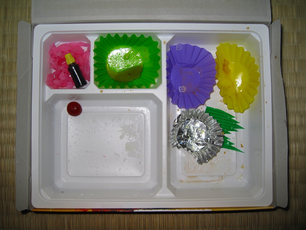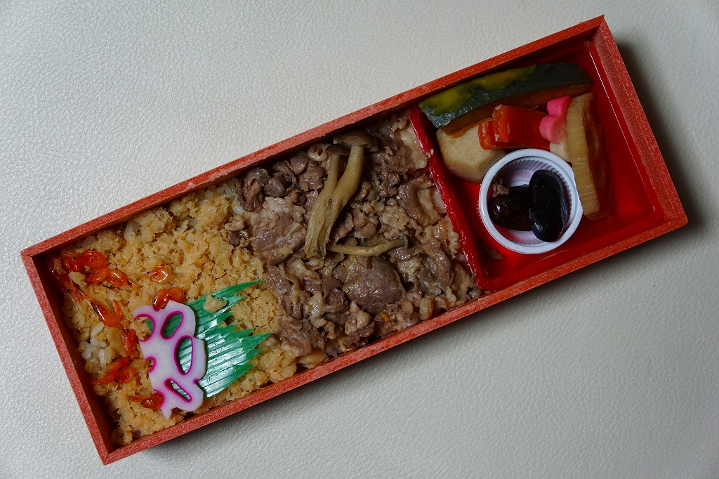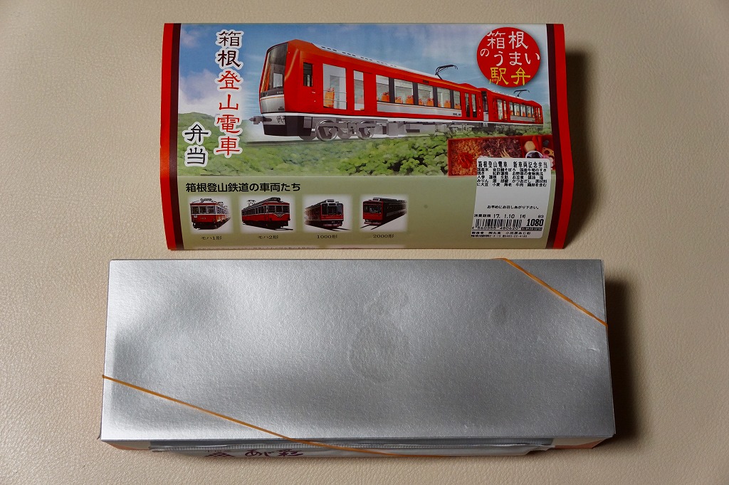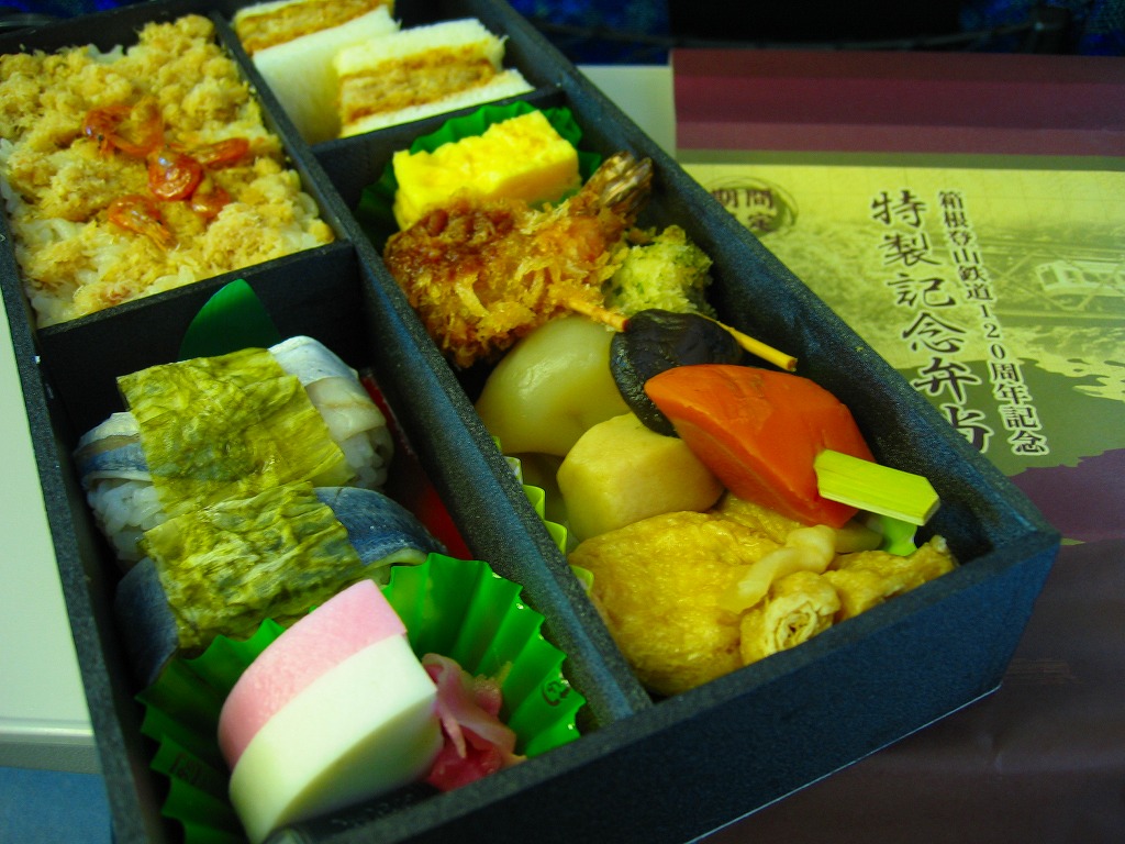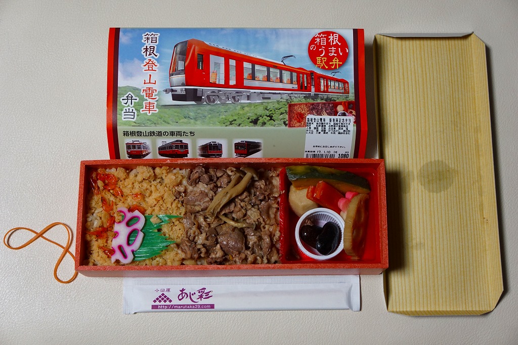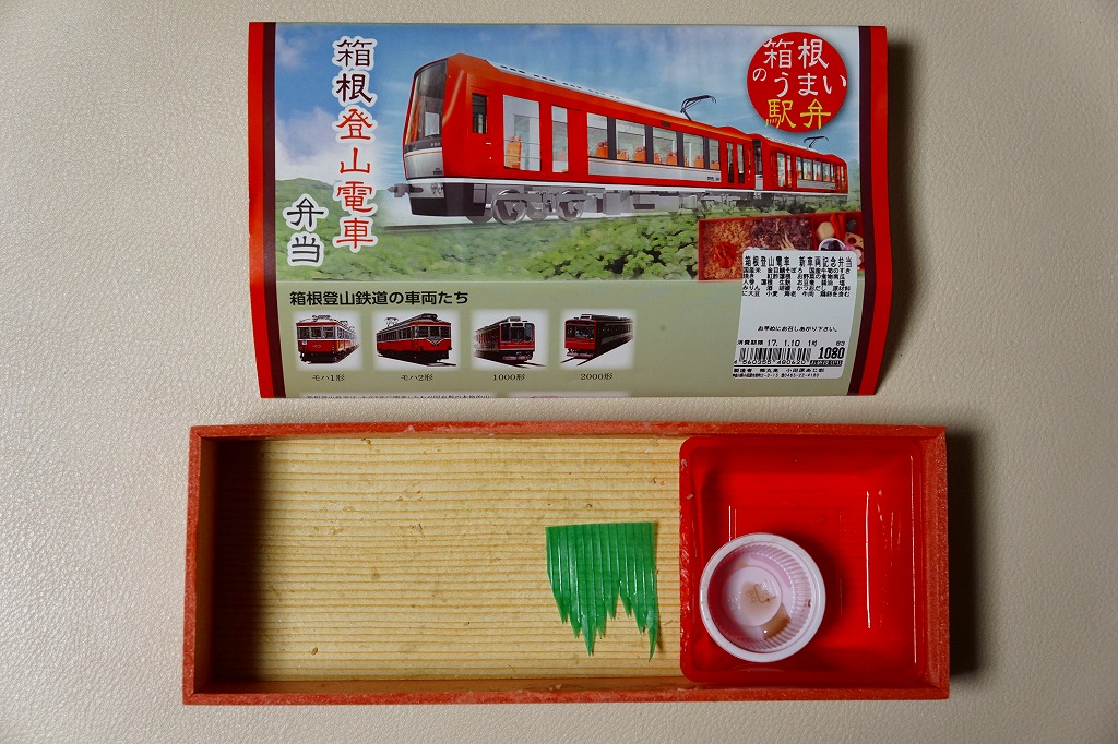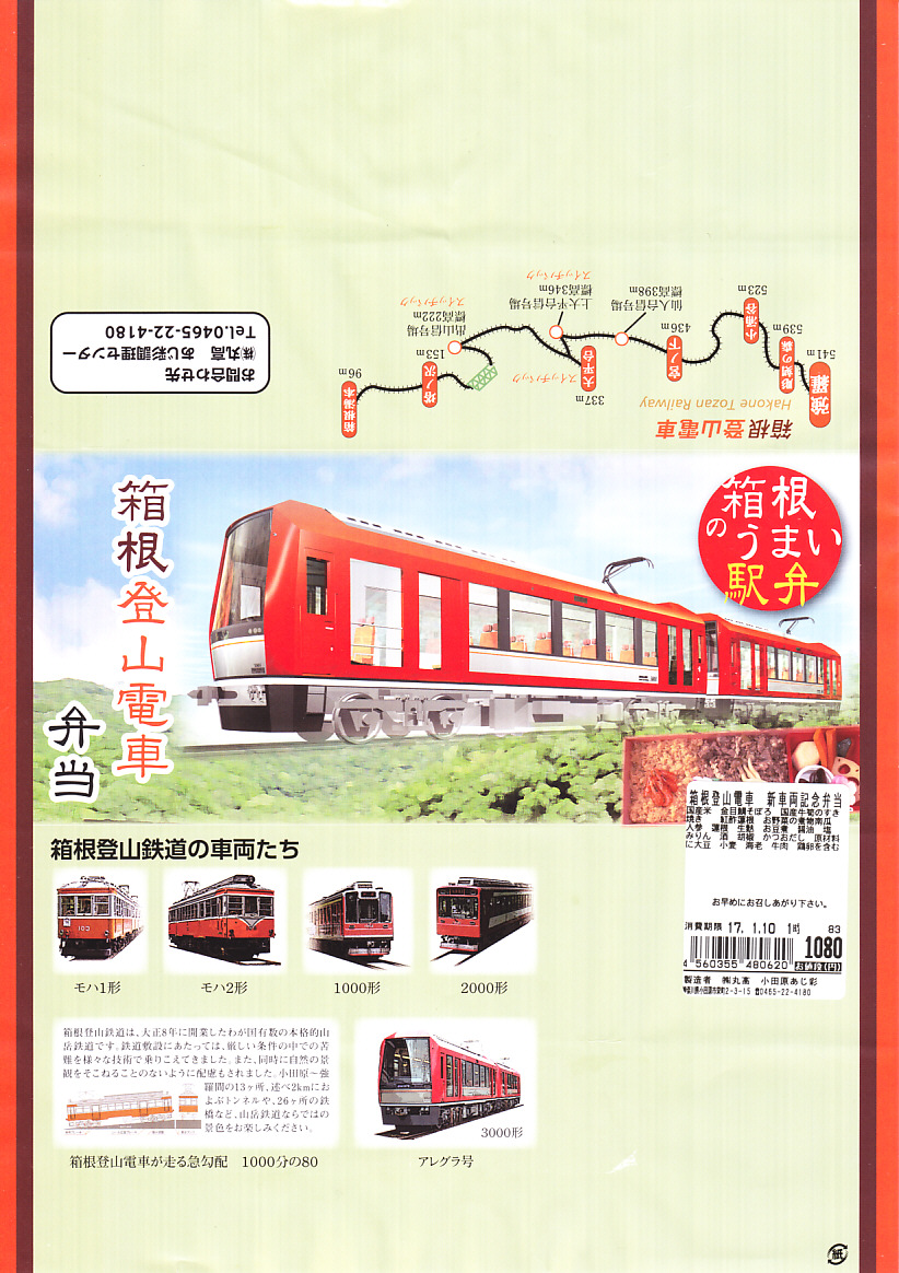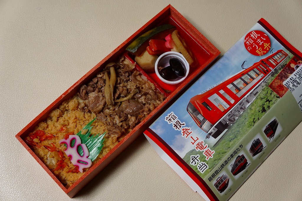 2015(平成27)年10月までに発売か。あるいは、食品表示ラベル上の商品名「箱根登山電車新車両記念弁当」のとおり、箱根登山鉄道3000形電車「アレグラ号」がデビューした、2014(平成26)年11月の発売か。掛紙にはその最新型電車のイラスト、箱根登山鉄道の箱根湯本駅〜強羅駅の概念的な路線図、「箱根登山鉄道の車両たち」を掲載。中身は茶飯をキンメダイそぼろと牛すき焼で覆い、サクラエビを少しまぶし、煮物と煮豆を添えたもの。少量で高価も、ていねいに作られた感じ。小柄で細長い容器は、常に満員の登山電車でも食べやすい、かどうか。