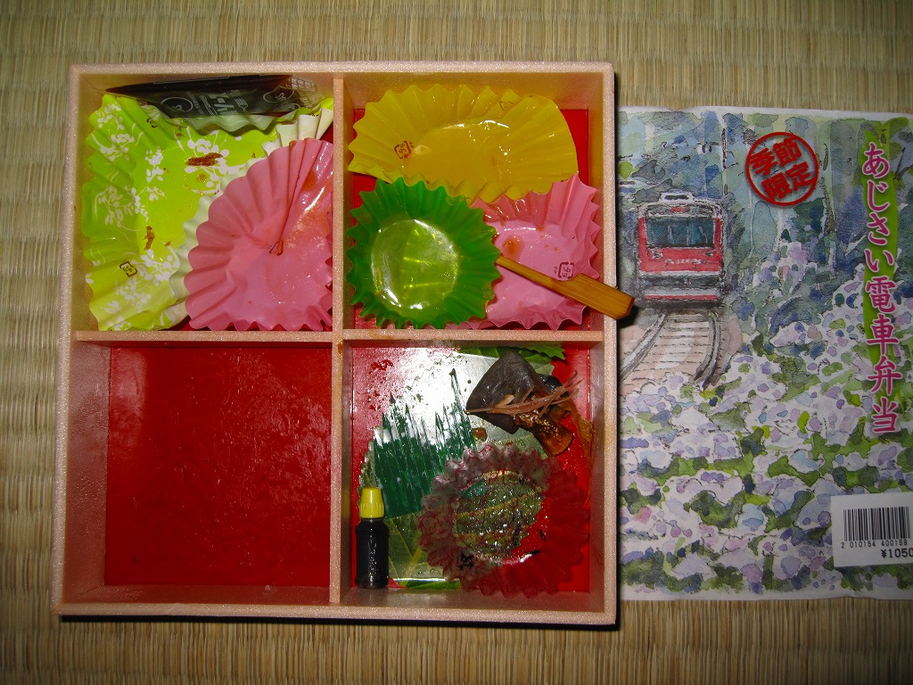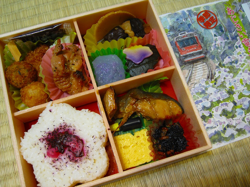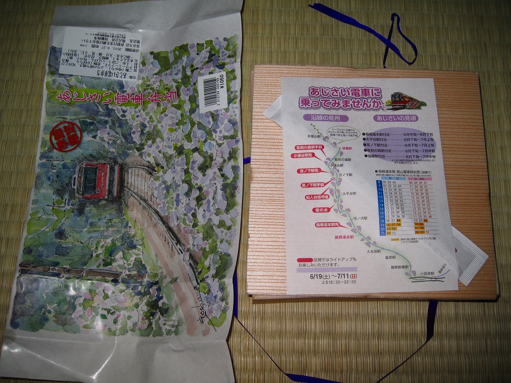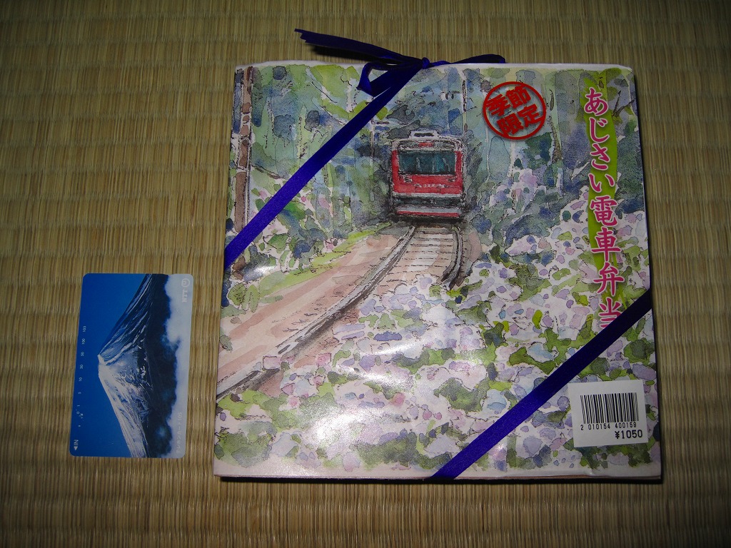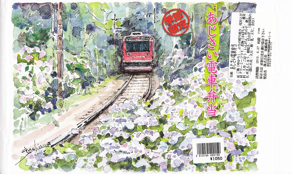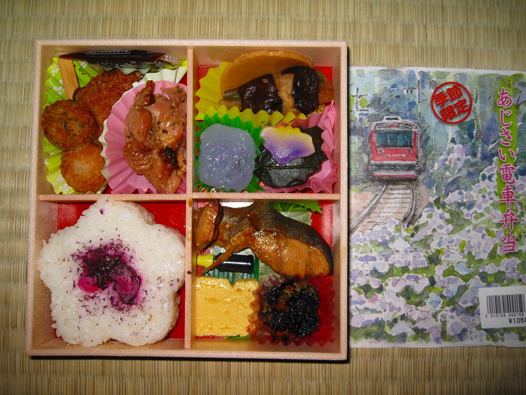 2004年かそれ以前から、6月から7月頃に販売されている季節駅弁。正方形の容器に、箱根登山鉄道「あじさい電車」の走行風景のイラストを描いた掛紙を巻く。松花堂風に4区画に収められる中身は、梅花型ゆかりめし、ブリ照焼と玉子焼とひじき、丸形エビフライや鶏照焼、煮物類やニシン昆布巻に水まんじゅうなど。中身のほとんどにアジサイや電車との関連は感じられないが、紫色がほのかに散る半透明の水まんじゅうが入るだけで十分である。