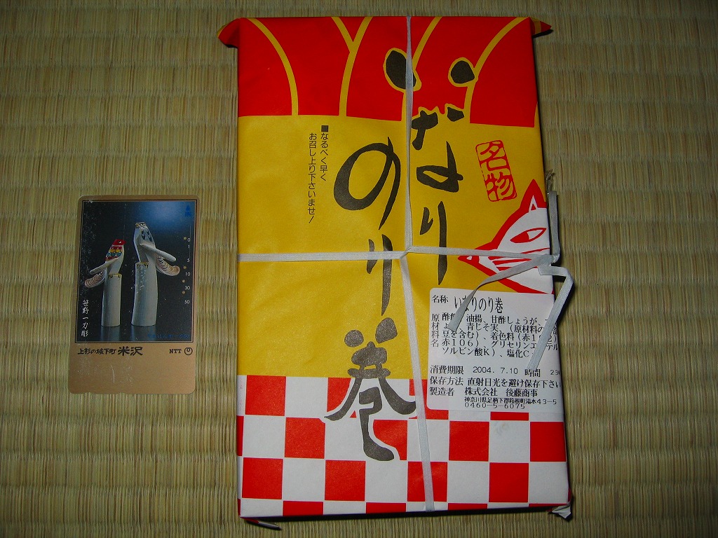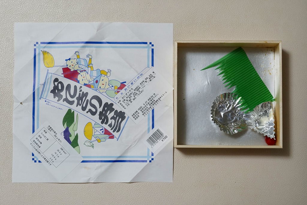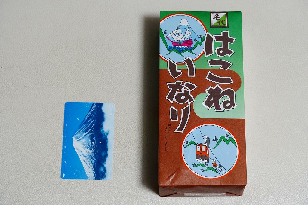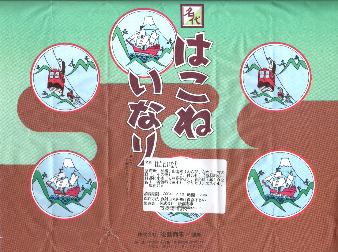2004(平成16)年7月10日に購入した、箱根湯本駅の包装紙。2011年時点のものとデザインは同じで、当時は食品表示が食品表示ラベルになっていた。