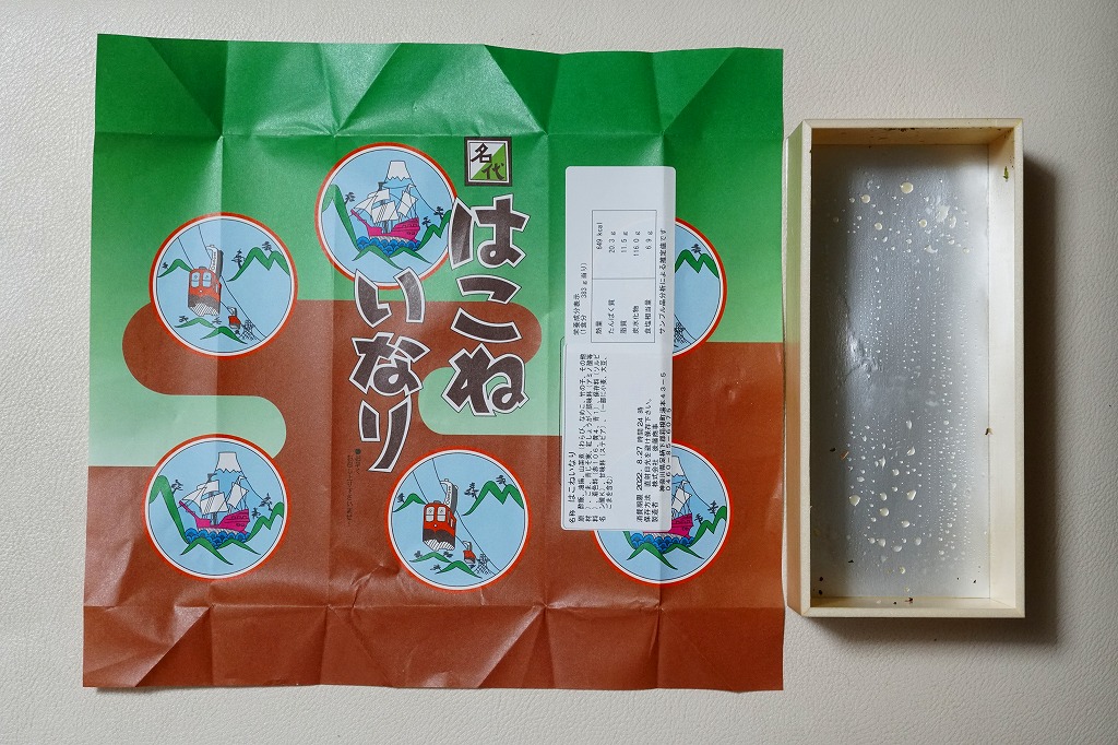箱根湯本駅の稲荷寿司駅弁。長方形の折箱に、具を見せたおいなりさん4個と紅生姜を詰め、経木のふたをして、昭和時代の箱根ロープウェイと箱根海賊船を描いた包装紙で包む。具はそれぞれ、梅じそふりかけ、のり玉ふりかけ、山菜、青のりと、とてもシンプル。今の箱根や駅弁にない素朴さがあると思う。