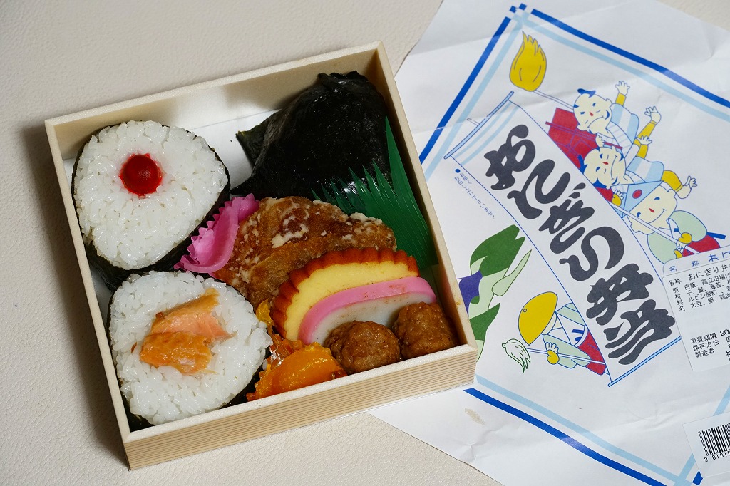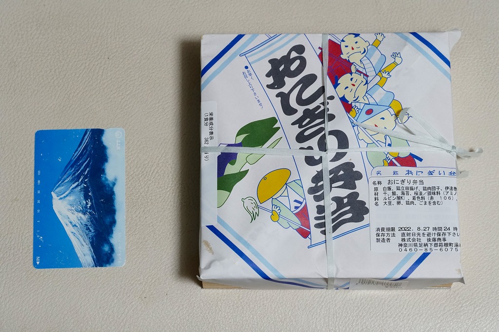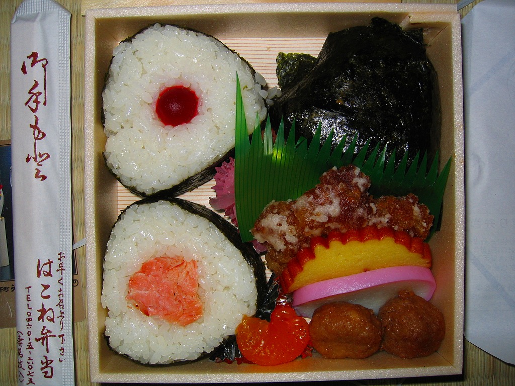 箱根湯本駅のおにぎり駅弁。平たい正方形の折箱に、平たい白飯に鮭と梅干しの具を貼り付けて周囲に海苔を巻いて三角形っぽく整形した、おにぎりというよりは海苔巻のような独特の形をした飯と、海苔で目張りした普通の形のおにぎりと、鶏肉の竜田揚、かまぼこ、伊達巻き、鶏肉団子、大根桜漬、みかんを詰める。内容はともかく、コンビニやスーパーにない見た目を持つお弁当。