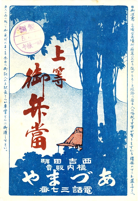1930(昭和5)年4月4日の調製と思われる、昔の西吉田駅、現在の吉田駅の駅弁の掛紙。絵柄は茶屋の向こうの弥彦山かどうか。