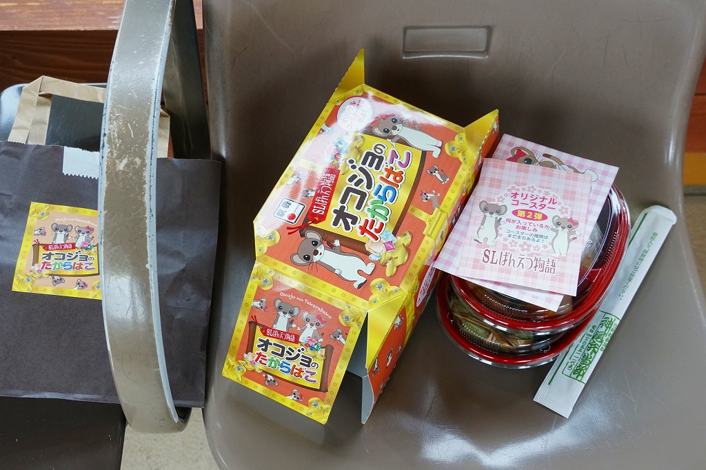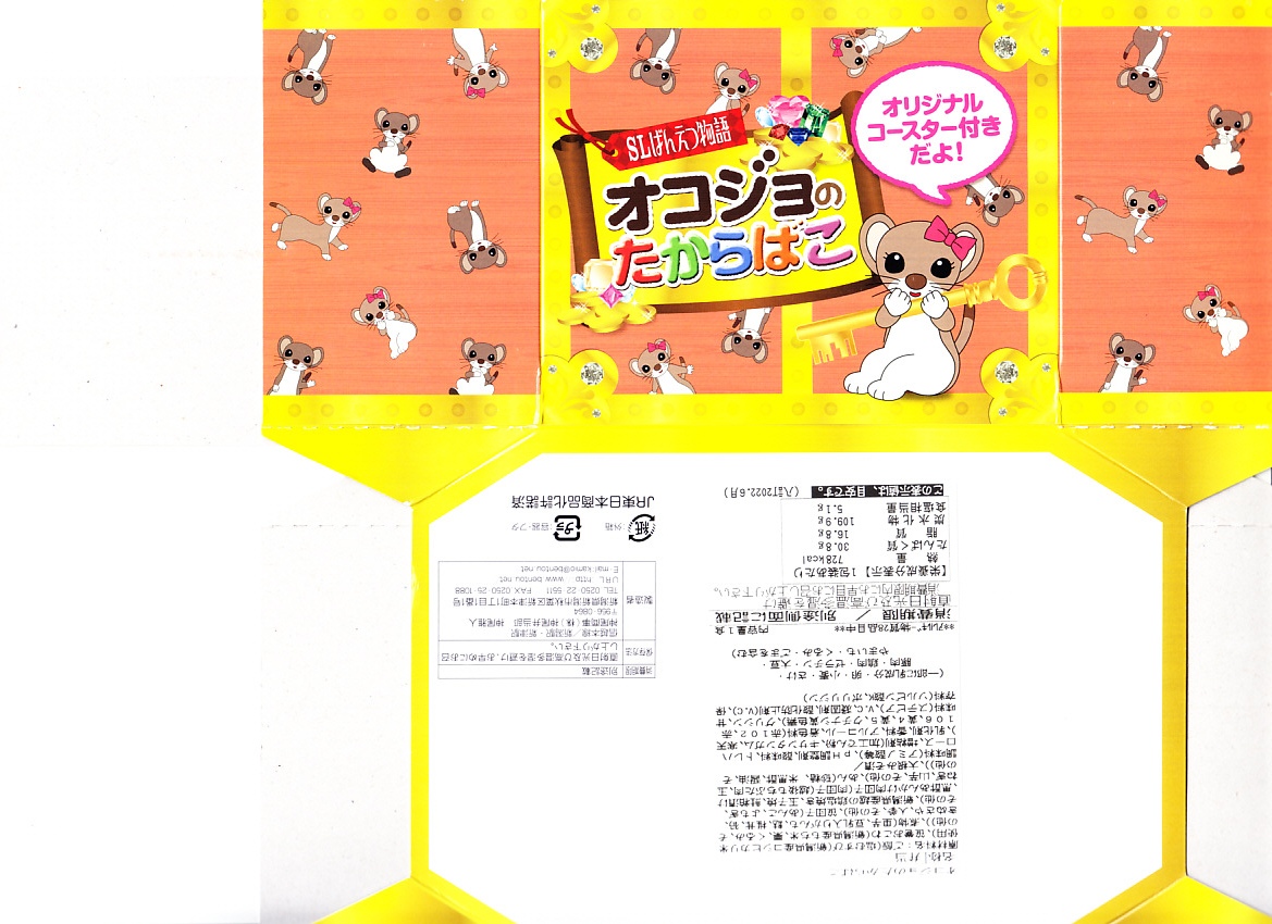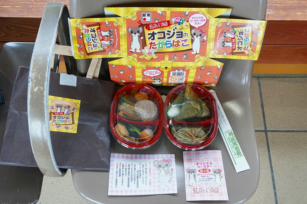 2012(平成24)年の7月に、磐越西線の観光列車「SLばんえつ物語」の車内売店で発売。JR東日本新潟支社が同年3月に、SL列車の公式キャラクターとしてオコジョの「オコジロウ」を設定し、4月に子供向けのフリースペース「オコジョルーム」を5号車に設けたため、これに合わせたものだろう。2015年に弁当の内容を子供向けから一般向けにリニューアル。
