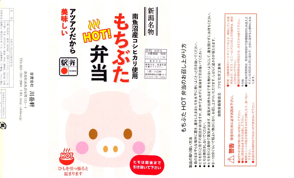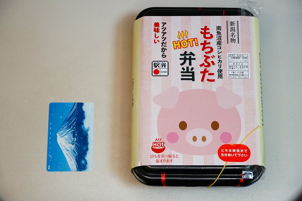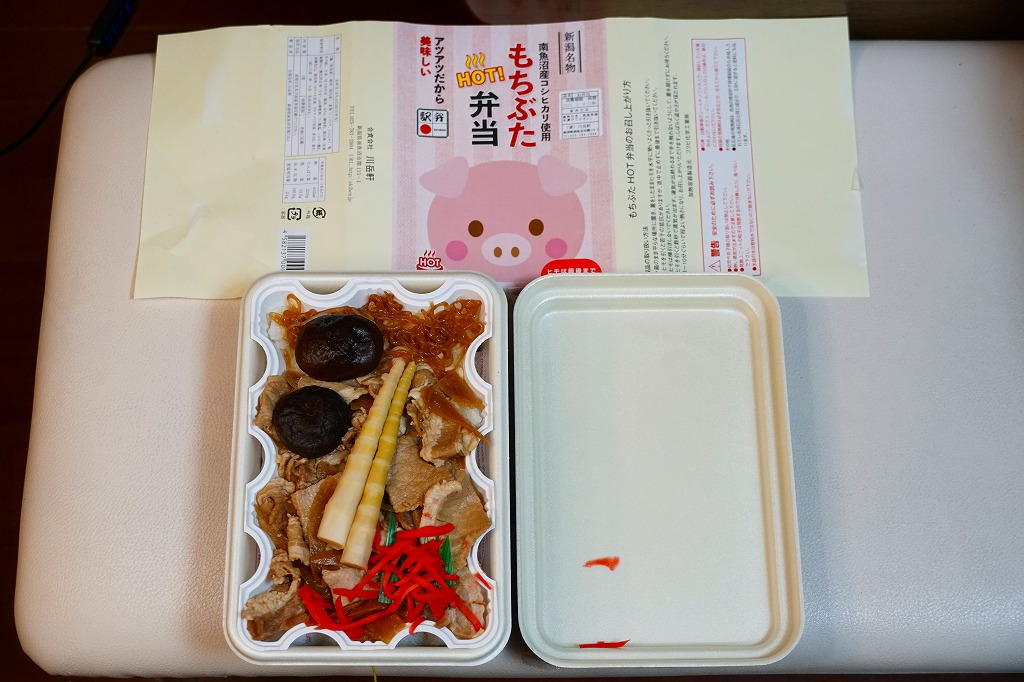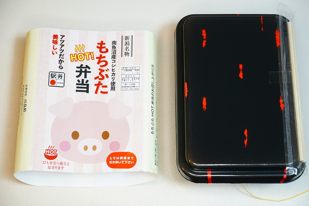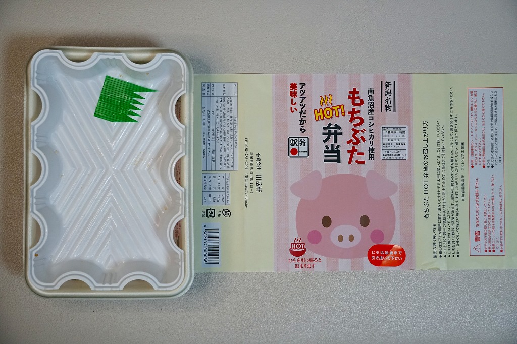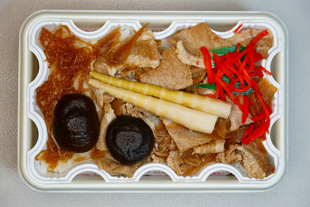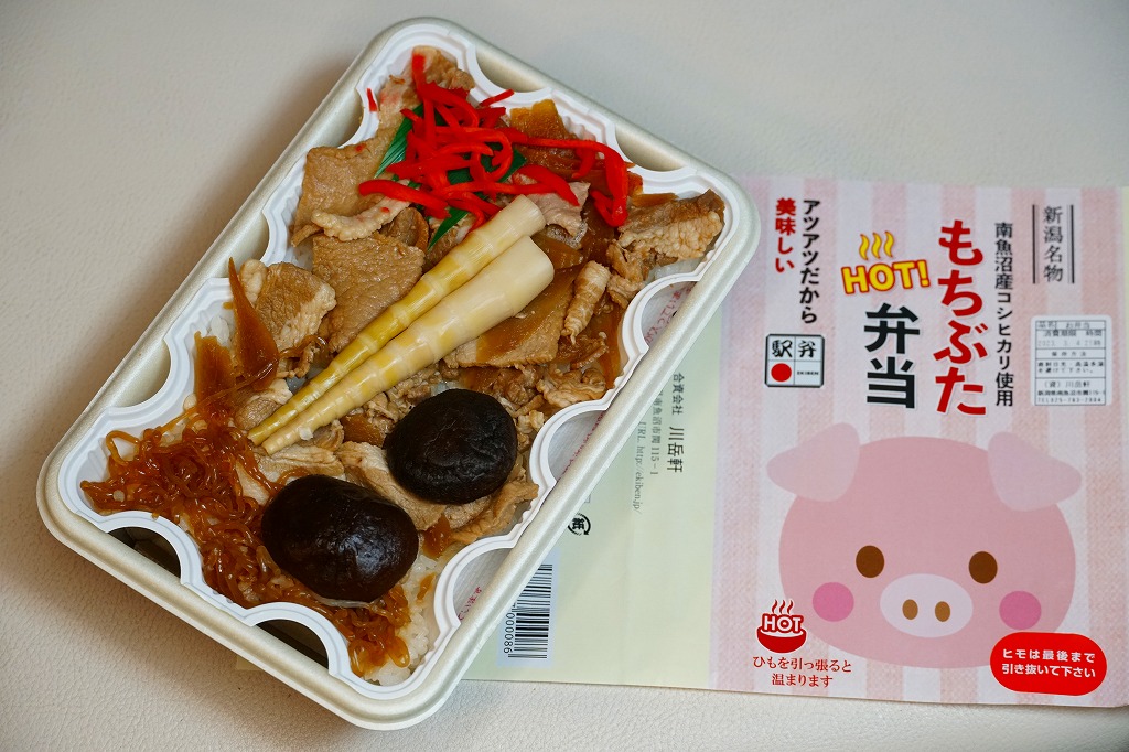 この名前では2023(令和5)年の新作なのだろうか。長方形の加熱機能付き容器に、南魚沼産コシヒカリの白飯を詰め、豚肉で覆い、しいたけ、糸こんにゃく、姫竹、ささがきごぼう、紅生姜を載せる。そんな内容は、越後湯沢駅の駅弁「越後もち豚すきすき弁当」と同じ。そのスリーブを掛紙に替えて、値段は380円も高い観光地価格を付けた。現地でも催事でも通販でも同じ価格で売ることがほとんどの駅弁で、こういうケースは珍しい。